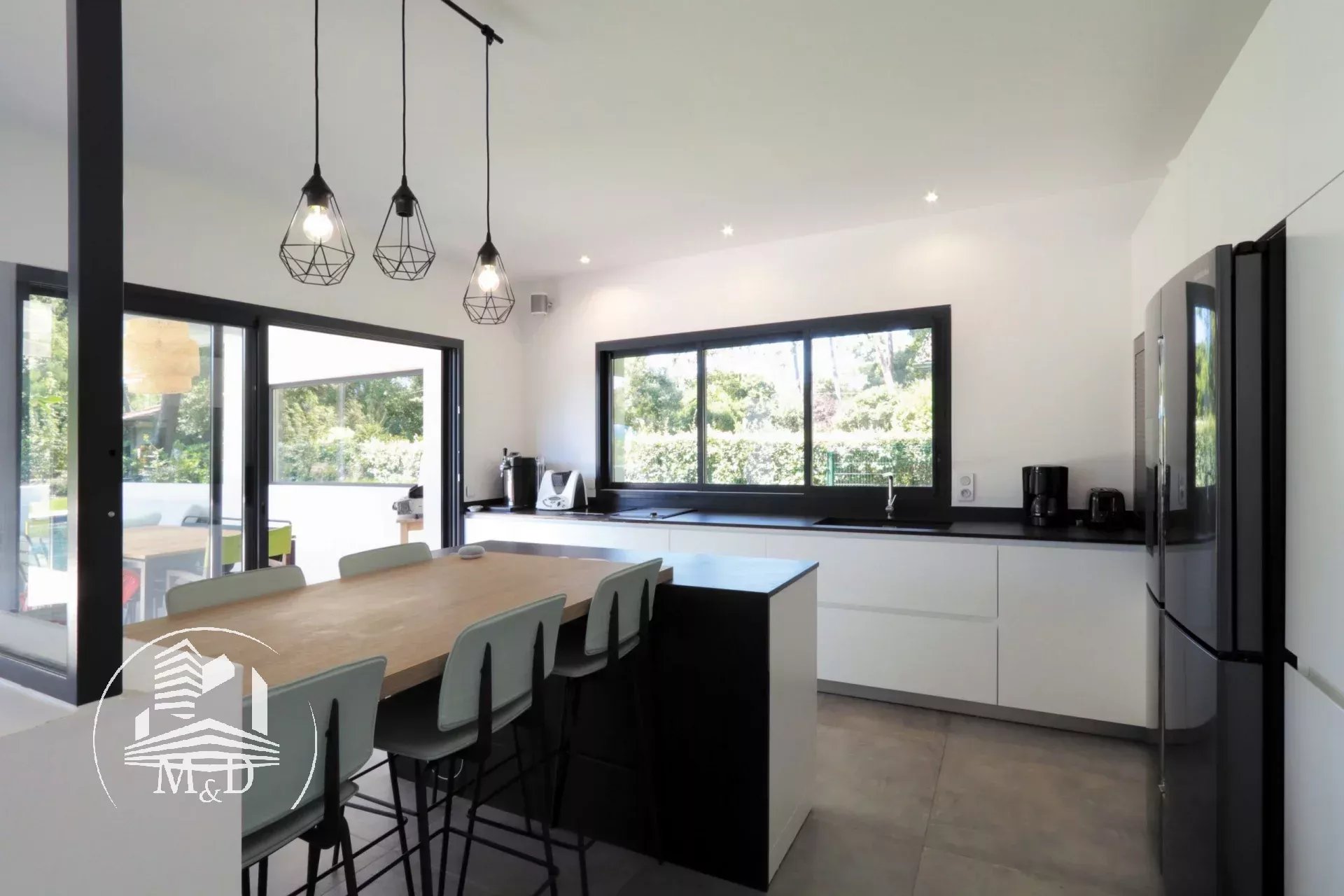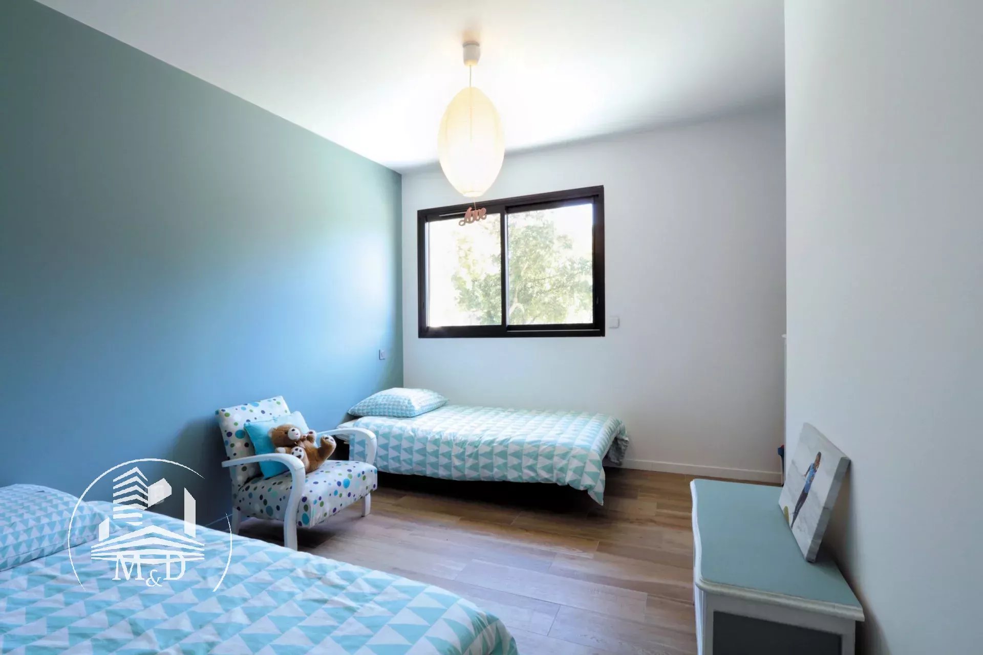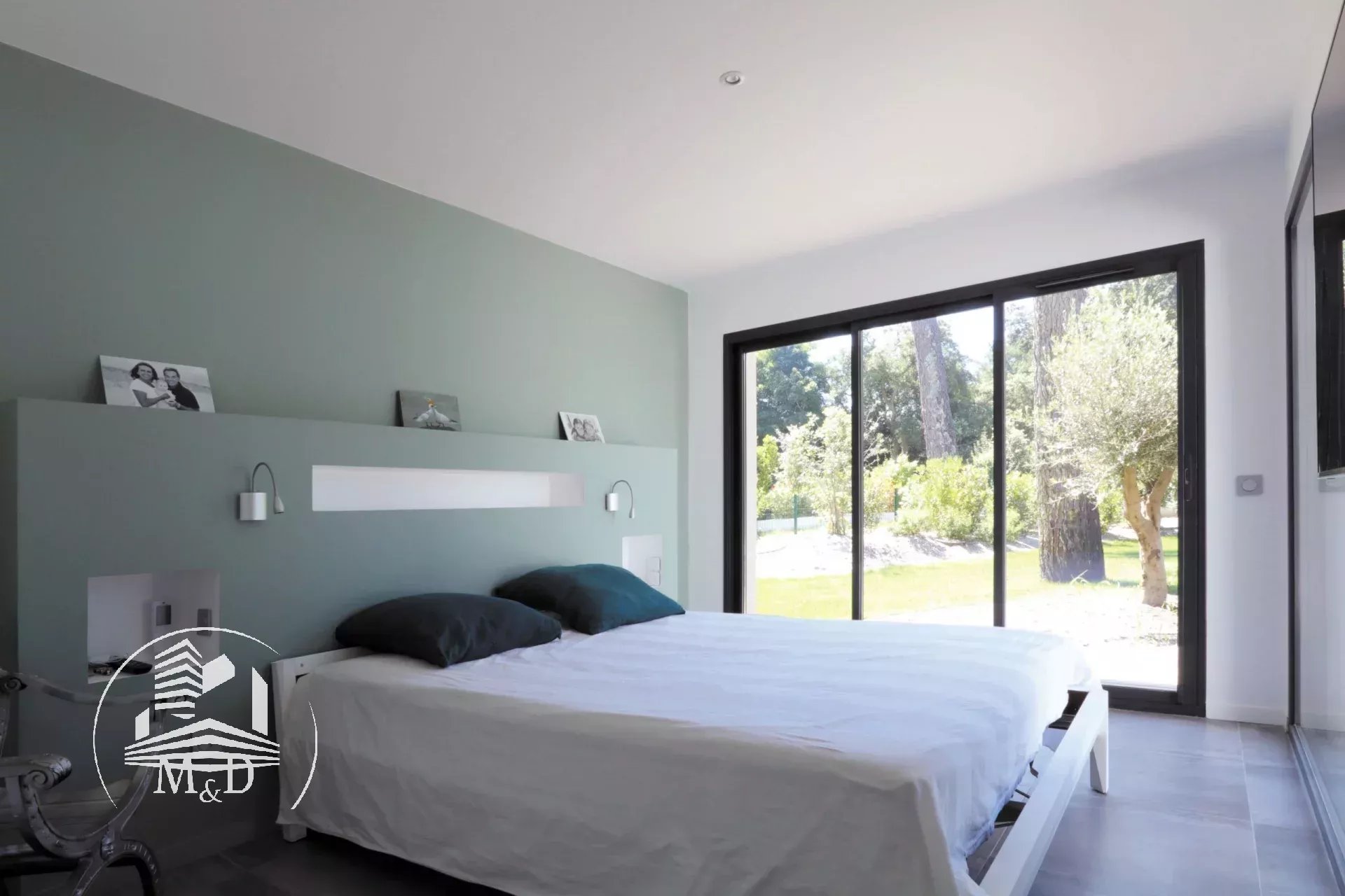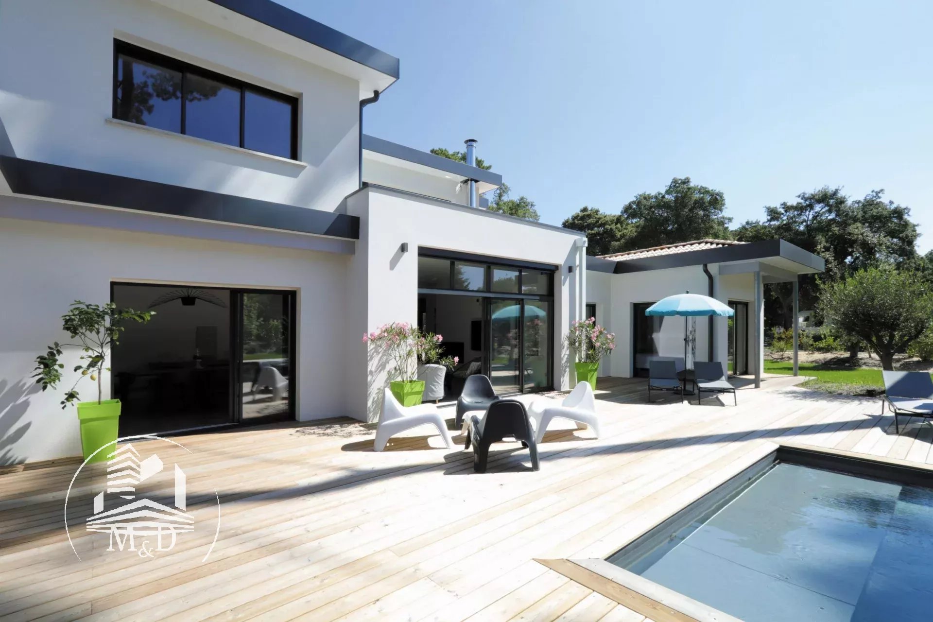 Maison T5 de 170m² neuve comprenant une cuisine ouverte sur une grande pièce de vie lumineuse avec grandes baies coulissantes, un cellier/buanderie, une salle de bain, 4 grandes chambres avec placard dont une suite parentale avec dressing et salle d'eau, deux wc, et un garage.