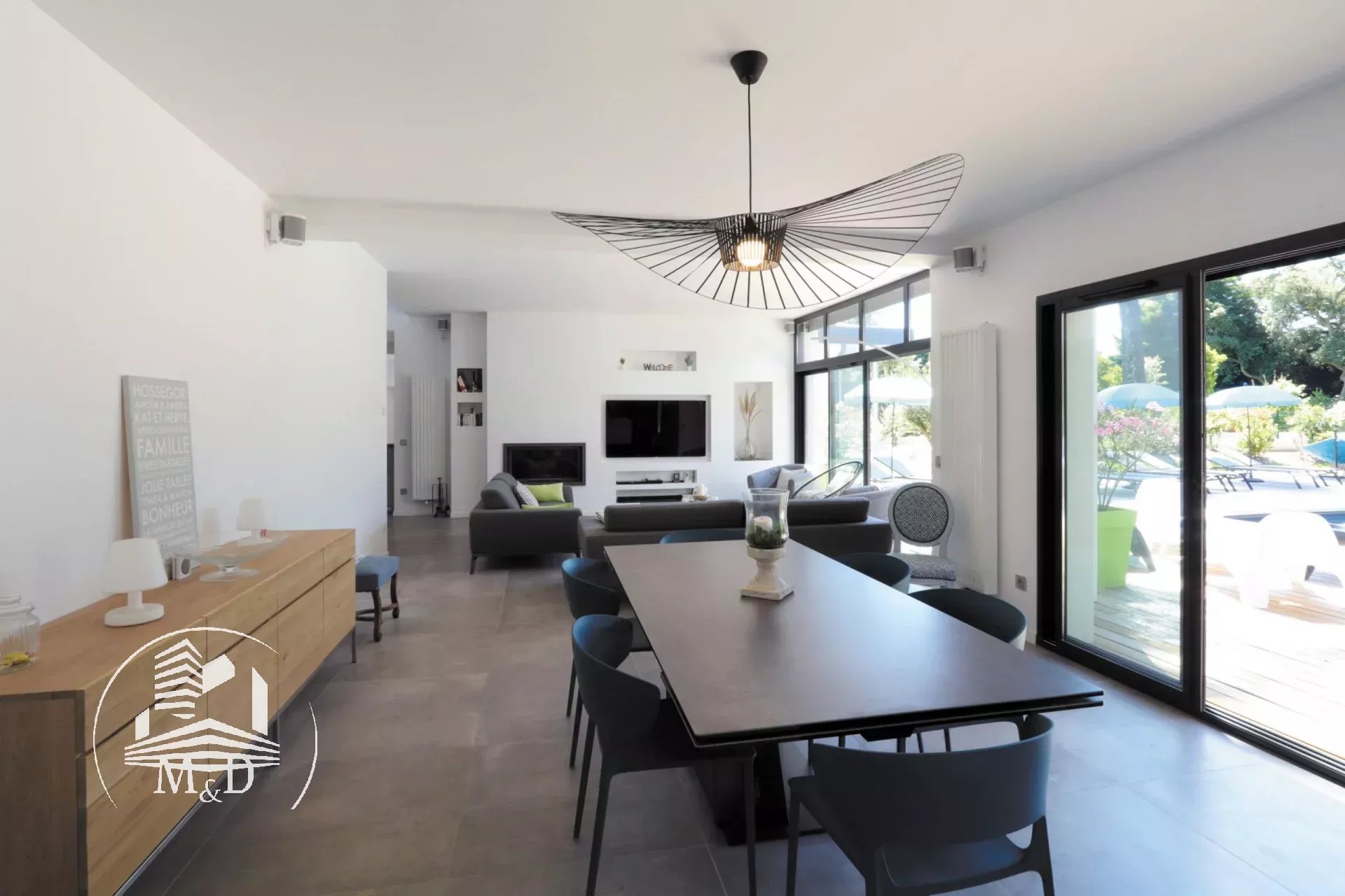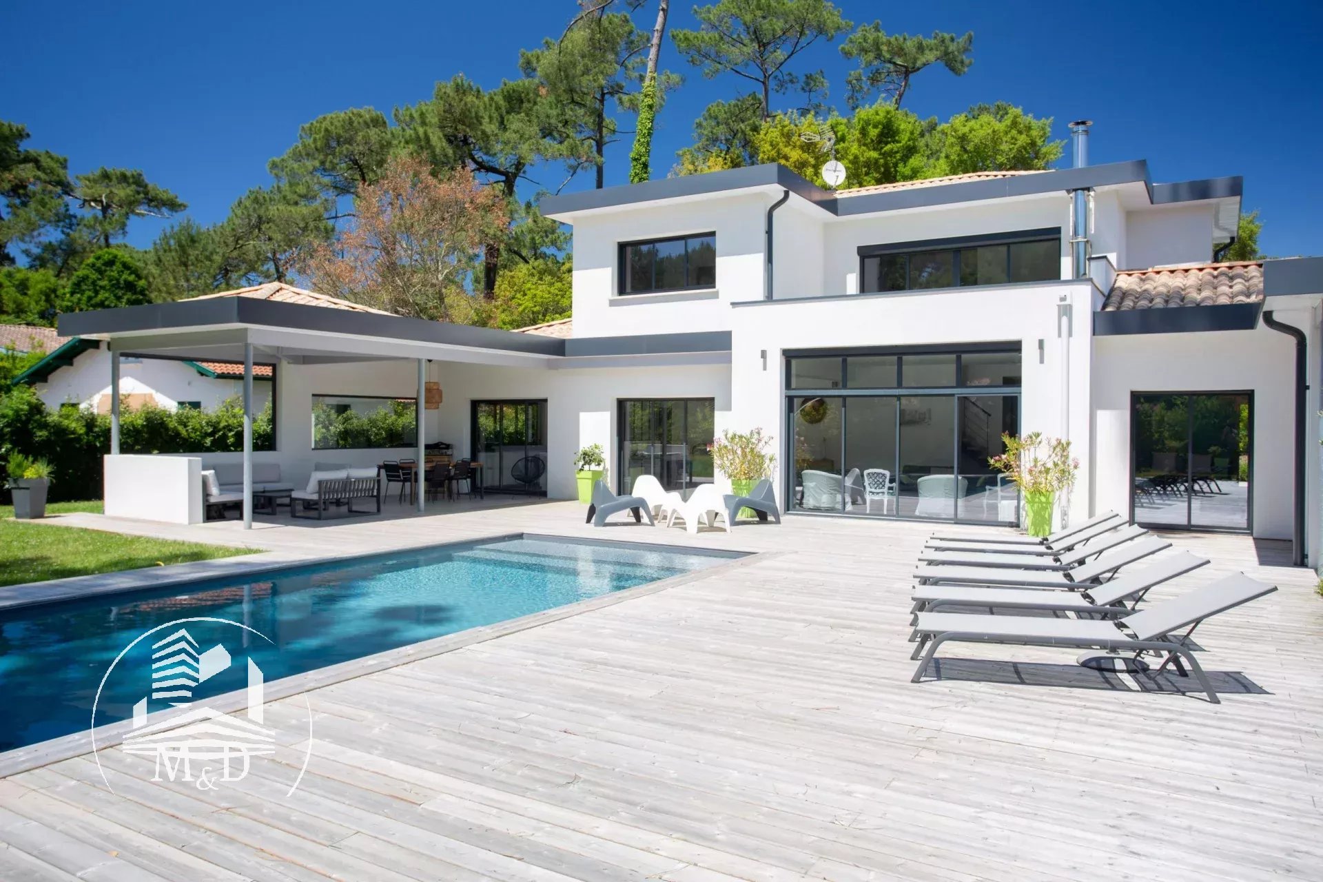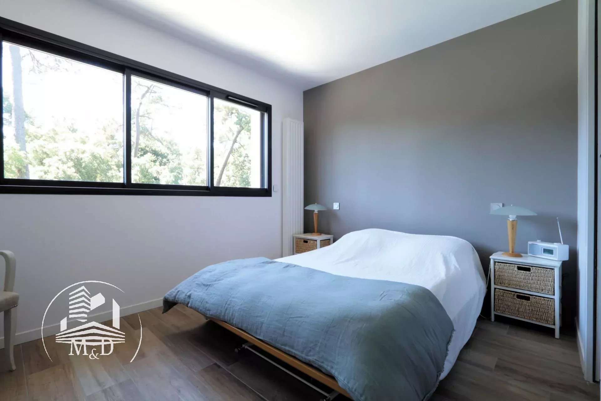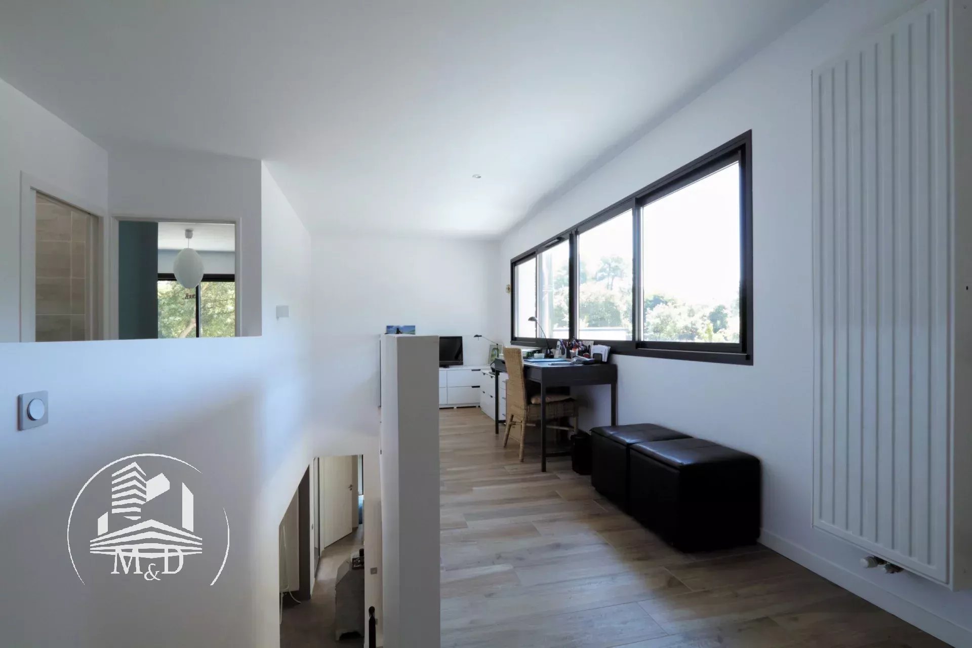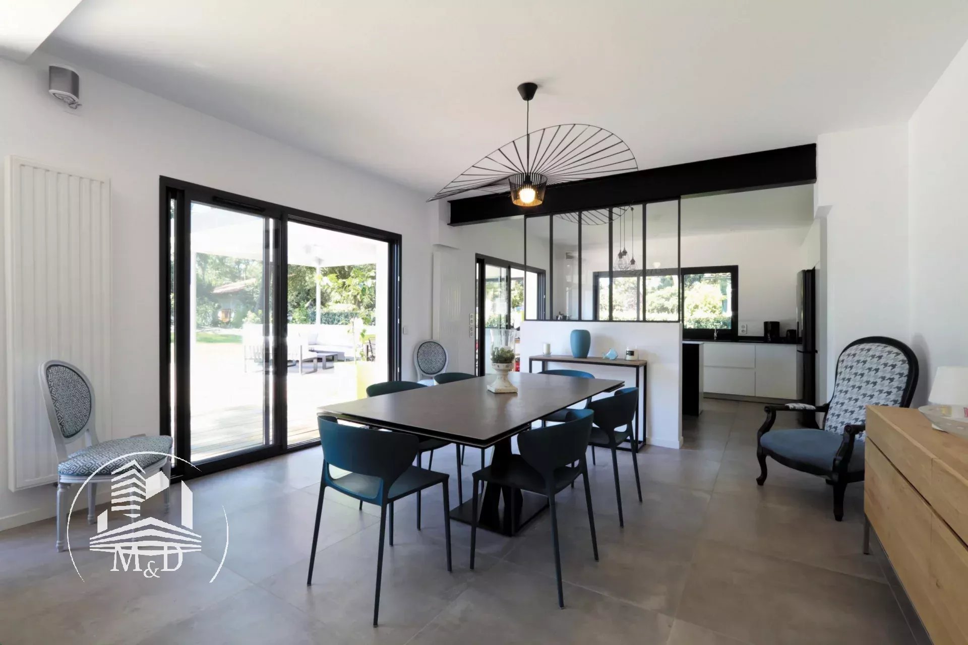 Maison T5 de 170m² neuve comprenant une cuisine ouverte sur une grande pièce de vie lumineuse avec grandes baies coulissantes, un cellier/buanderie, une salle de bain, 4 grandes chambres avec placard dont une suite parentale avec dressing et salle d'eau, deux wc, et un garage.