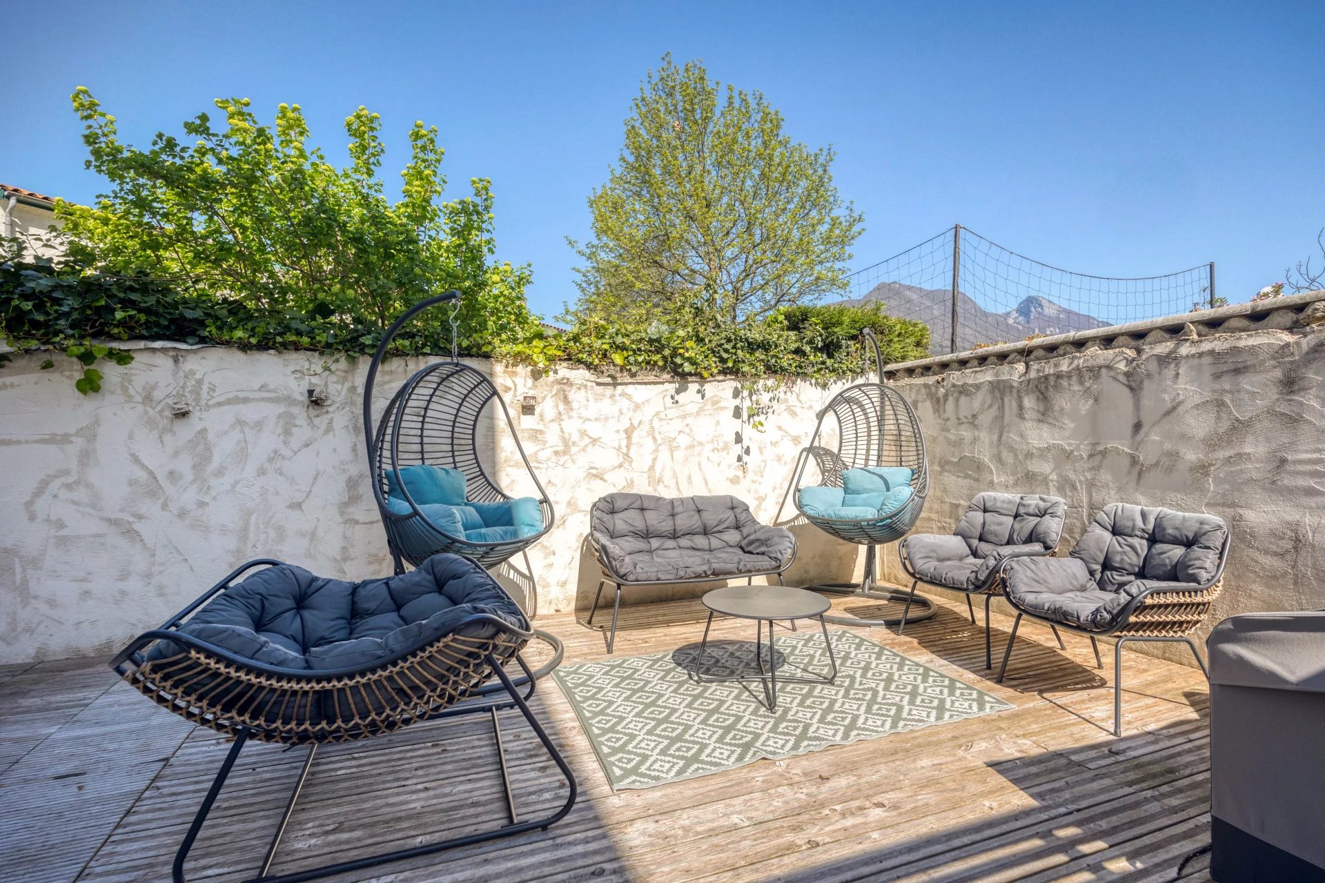 À l'extérieur, vous profiterez d'une belle terrasse exposée Sud accompagnée d'une piscine creusée neuve, d'un espace de jardinage et d'une seconde terrasse avec un salon de jardin pour profiter de moments de détente.