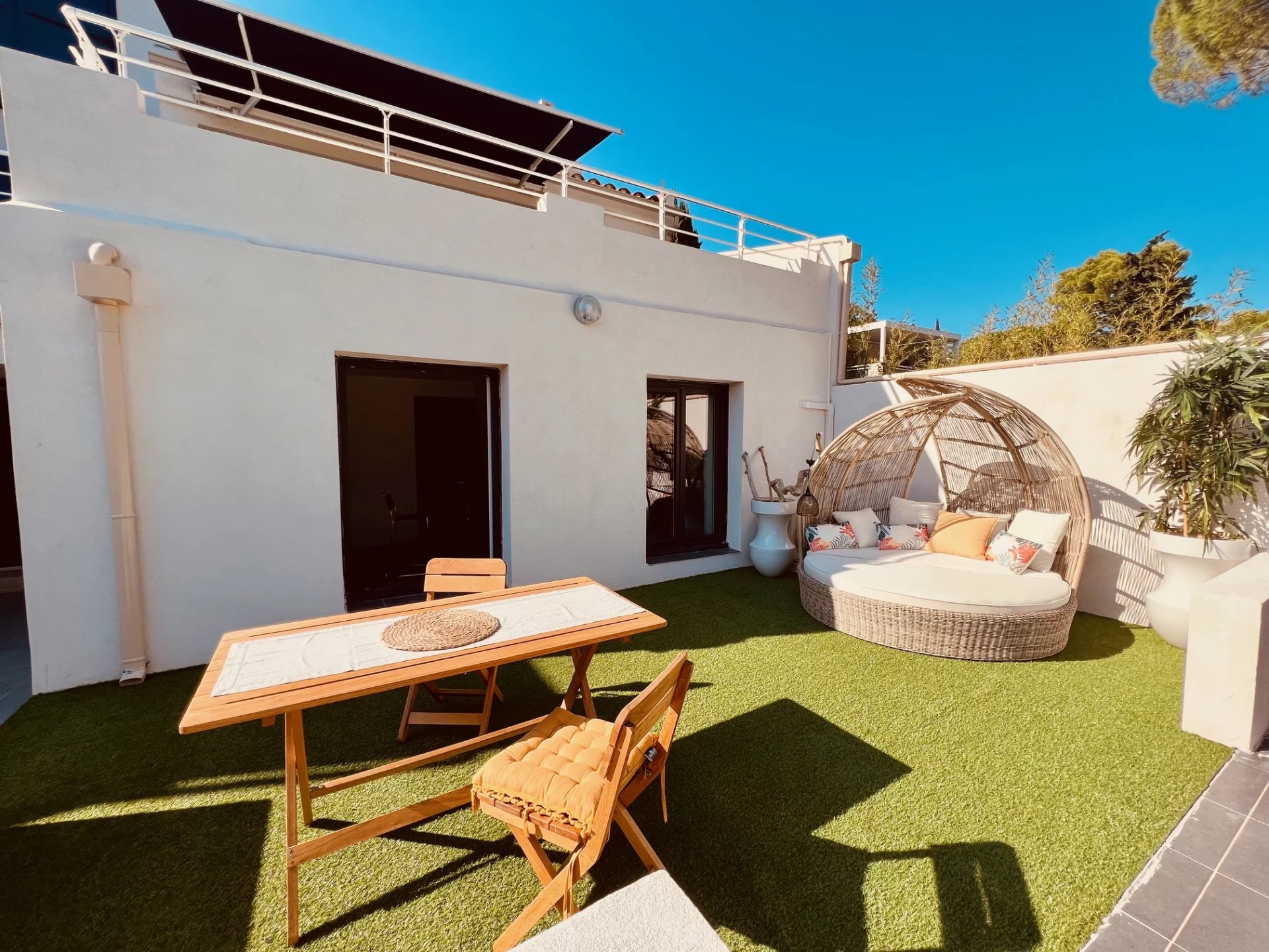 Bel appartement spacieux entièrement rénové avec gout, vous serez séduit par son espace extérieur sans vis à vis avec une petite vue mer. Entrée sur séjour, cuisine équipée séparée, une chambre, salle d'eau, toilettes, buanderie dressing. Petite copropriété de 4 lots (2 apparts et 2 garages) Peu de charges (eau et entretien portail). A 2 minutes de la plage à pieds, véritable coup de coeur. A visiter rapidement Mdt 1766 (honoraires charge vendeur)