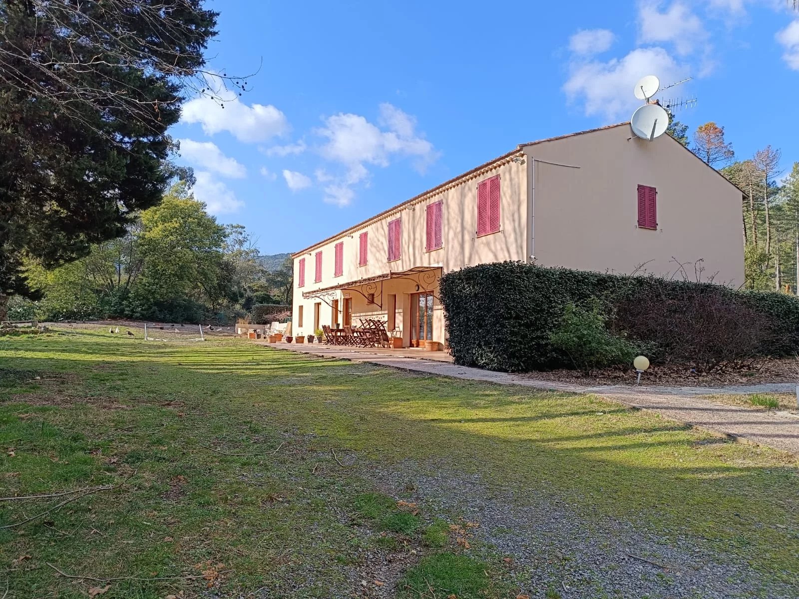 L'Agence ALL Immobilier - Charlotte Leblanc - vous propose, à 20 mn des plages du Lavandou, 30 mn du célèbre village de Saint-Tropez, au coeur de la forêt, une bâtisse de 396 m² ainsi qu'un authentique Relais de Poste datant du XVIIéme siècle de 553,28 m² à réhabiliter entièrement, le tout édifié sur un terrain de deux hectares avec nombreux arbres fruitiers et platanes centenaires. Cette propriété, située dans un cadre verdoyant, s'ouvre sur un vaste parking privatif permettant d'accueillir de nombreux véhicules. Idéal lors de réceptions. La première bâtisse se compose de deux niveaux. Au rez-de-chaussée: -Un appartement T3 d'environ 90 m² avec un séjour, une vaste cuisine aménagée, deux chambres, deux salles de douches avec toilettes, une salle de bains avec toilettes, une terrasse avec jardin privatif. Cet appartement, dont chaque pièce dispose de sa propre salle de bains/toilettes, peut être transformé en trois studios. -Un appartement T5 d'environ 100 m² avec une cuisine/salle à manger ouverte sur une terrasse et le jardin, un séjour, un cellier, trois chambres dont deux ayant accès à une terrasse privative, deux salles de douches avec toilettes. -Une réception donne accès au premier étage qui dessert: -Six studios lumineux de 30 m² environ avec kitchenette, salle de bains/douches et toilettes, -Deux chambres disposant pour chacune de leur salle de douches et toilettes, -Deux locaux et un local technique. Travaux d'isolation sont à prévoir pour cette bâtisse ainsi que pour la remettre au goût du jour. La seconde bâtisse est un ancien Relais de Poste du XVII ème siècle célèbre dans la région pour la gastronomie que son restaurant proposait. A ce jour, cette bâtisse nécessite d'importants travaux de rénovation. Les volumes généreux qu'elle propose permettent de se projeter dans de riches plans de distributions des sols et des espaces: -Un rez-de-chaussée de 226,39 m² composé de 4 pièces distinctes dont une réception de plus de 110 m2 où se sont organisés de nombreux mariages. -Un premier étage de 117,14 m dessert six vastes chambres, -Un second étage de 118,41 m² dessert sept chambres, -Accolée à la bâtisse, une dépendance de 91,34 m² sur deux niveaux: -Premier niveau : la cuisine du restaurant auparavant, -Second niveau : deux chambres. L'extérieur est composé: -D'une cuisine d'été de 54 m² environ avec sa terrasse, -Une piscine 5x10 sécurisée, -Petite structure au sommet du vaste terrain légèrement vallonné pouvant être utilisée comme boxe pour chevaux par exemple, -Enclos pour animaux en contre bas du terrain. Cadre idéal pour de la location, restauration, grace aux volumes exceptionnels que cette propriété offre dans cette région très prisée. Ces deux bâtisses, qui sont côte à côte, sont construites sur deux parcelles distinctes donnant la possibilité au future acquéreur de créer deux projets différents s'il le souhaite. Possibilité de créer une seconde piscine proche de la bâtisse du XVII ème siècle. Parcelles en zone Agricole. Forts potentiels. Les informations sur les risques auxquels ce bien est exposé sont disponibles sur le site géorisques www.georisques.gouv.fr Charlotte LEBLANC, 07.67.47.85.87 (RSAC 838 594 331 ) agent commercial & spécialiste du golfe de Saint-Tropez au sein de l'agence ALL Immobilier.