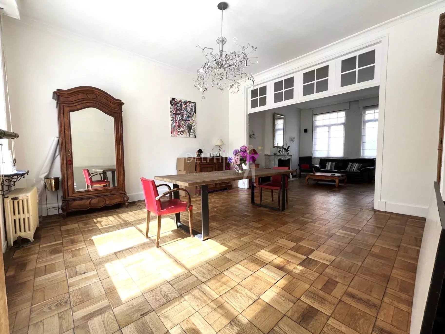 NOUVEAU BIEN D'EXCEPTION ! Au cœur de La Vallée de La Lys et à 5 mn de Quesnoy, Splendide maison de maître de 280 m² érigée sur une parcelle de 700 m², au cœur de ville et à proximité de toutes commodités. Cette demeure se compose en rez-de-chaussée d'un vaste hall d'entrée avec vestiaires, d'un bureau avec placard, d'une magnifique pièce de vie ultra lumineuse, avec une cheminée feu de bois, d'une cuisine équipée avec son espace repas journalier, le tout donnant accès direct sur la terrasse et le jardin arboré, exposé Sud/Ouest et sans aucun vis-à-vis. Au premier niveau, un large palier dessert 4 chambres spacieuses équipées de rangements, d'une salle de bain et d'une salle de douche. Au deuxième étage, le palier distribue une chambre de 27 m² avec point d'eau et d'un superbe espace de 40 m² pouvant faire office de suite parentale. Grand grenier aménageable. Cave de stockage et cave à vin. Buanderie. Dépendance. Possibilité de reprendre la location du garage à 50€/mois. " Nouveauté! Splendide Maison de Maître avec jardin! Bien d'exception à découvrir au plus vite!" PRIX FAI: 565 000€ DELPHINE IMMO 0695082 Consommation énergétique : 249 kWh/m²/an Emission de gaz à effet de serre : 49 CO2/m²/an Date de réalisation du diagnostic énergétique : 08/11/2024 Montant estimé des dépenses annuelles d'énergie pour un usage standard : entre 5690 € et 7750 € par an(abonnements compris) Prix moyens des énergies indexés sur l'année 2021e, 2022 et 2023. Le prix est indiqué frais d'agences compris pour 2.7% à la charge de l'acquéreur.