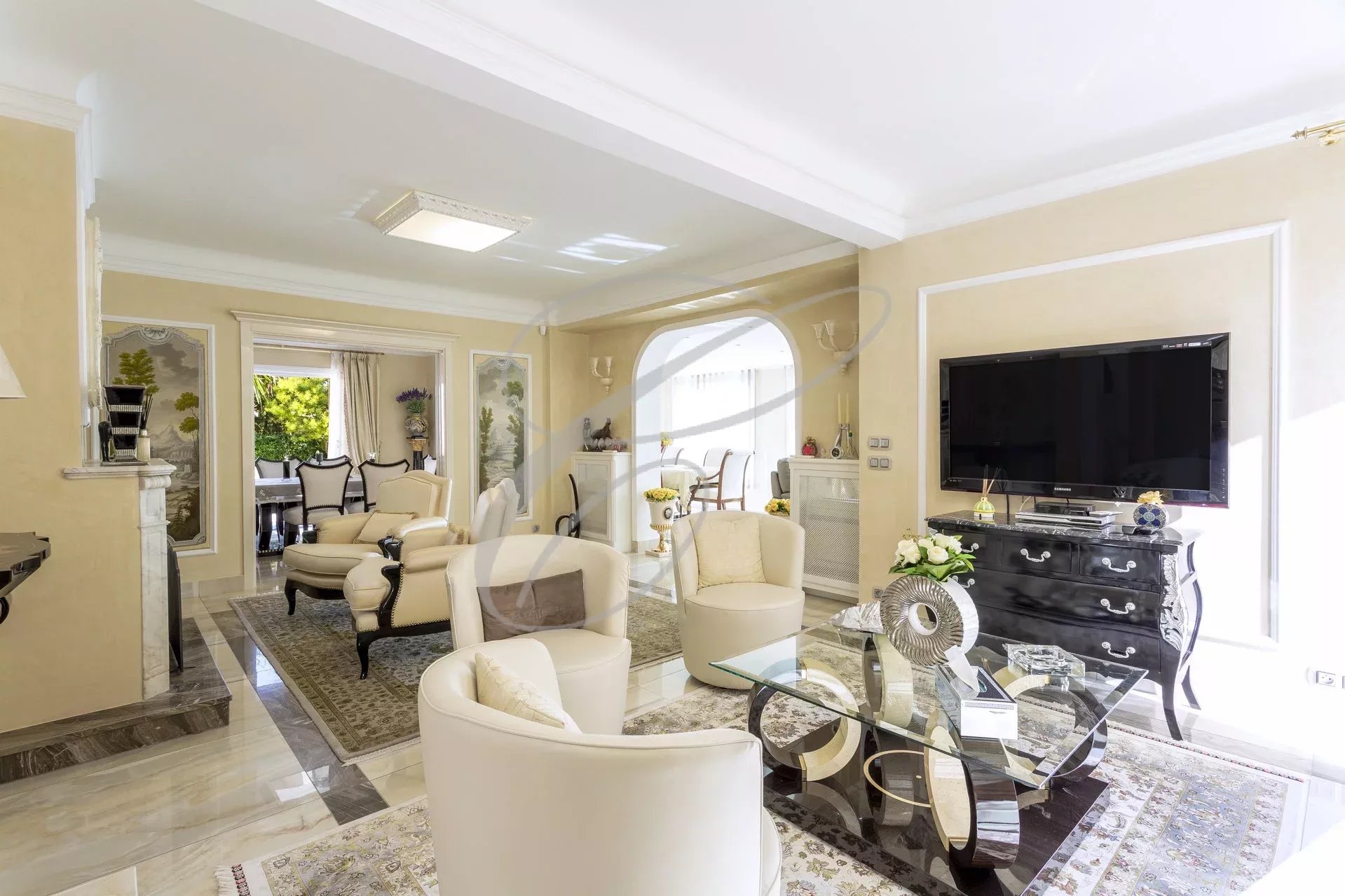 Secteur résidentiel du Hameau, magnifique villa luxueusement rénovée et décorée au cœur d'un jardin arboré avec piscine à débordement. Vue mer panoramique. Double réception, 4 chambres en suites. Appartement d'amis et un appartement pour le personnel. Garage pour de nombreuses voitures.