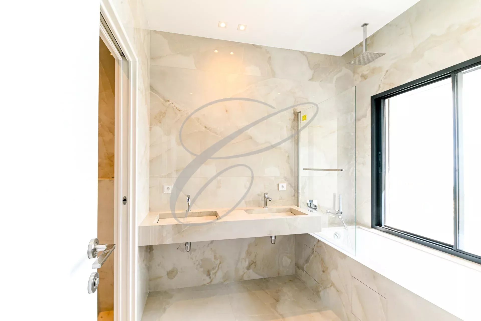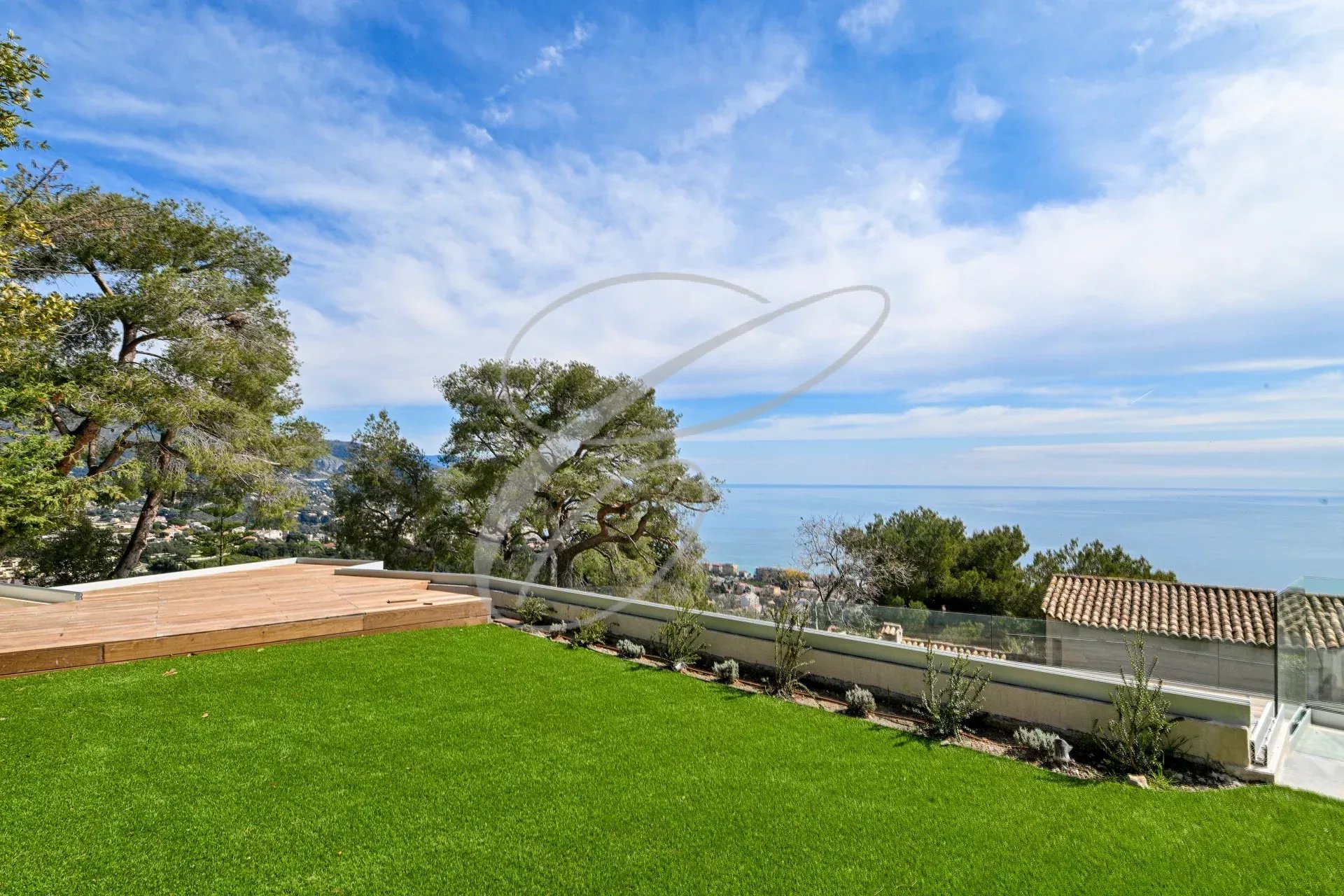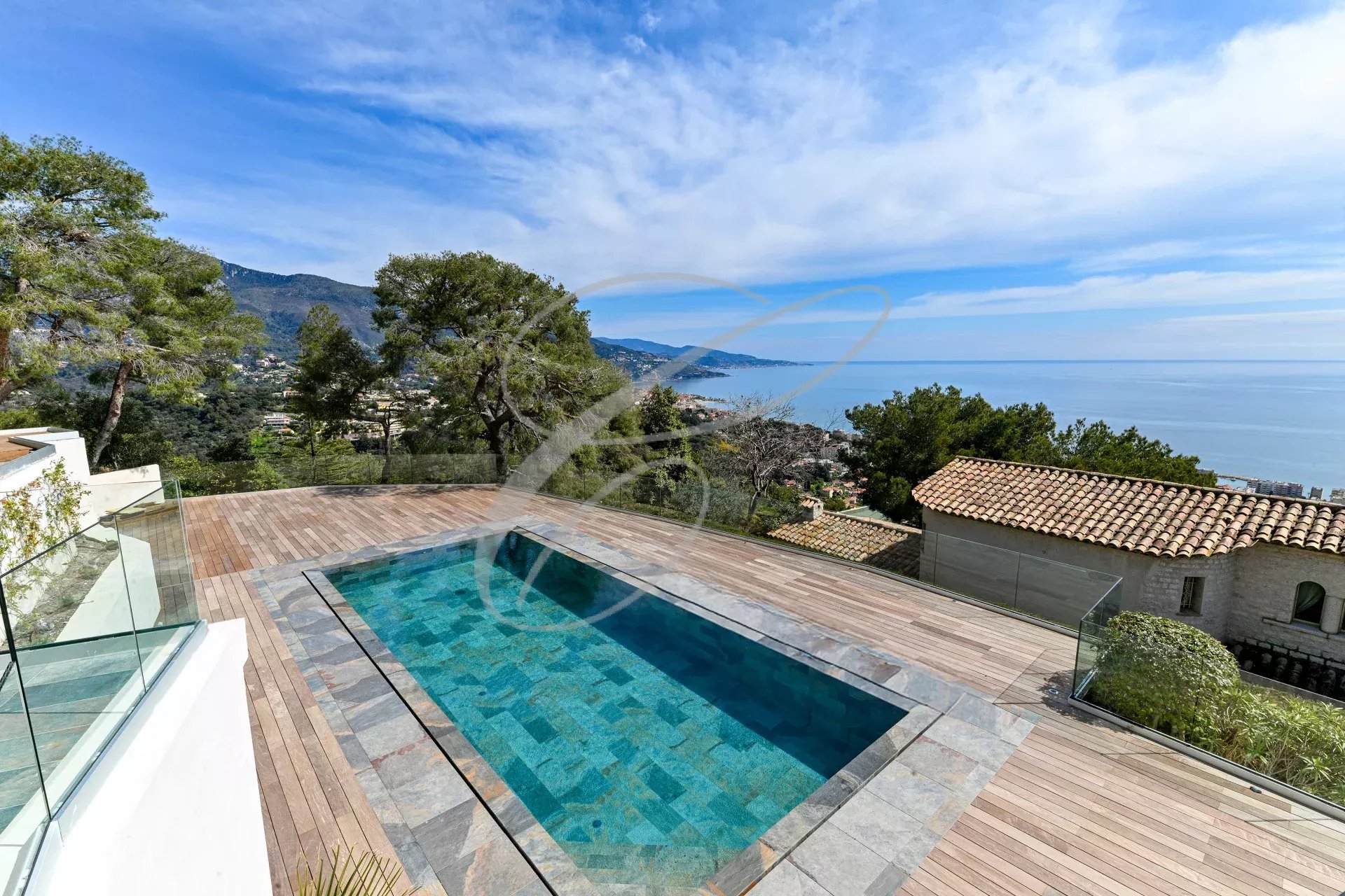 Hameau de Roquebrune, villa moderne neuve avec piscine. Vue mer panoramique. Secteur calme et résidentiel. Sur deux niveaux, la villa est composée d'une double réception, cuisine indépendante, 4 chambres en suite, dressings, buanderie. Un double garage complète ce bien.