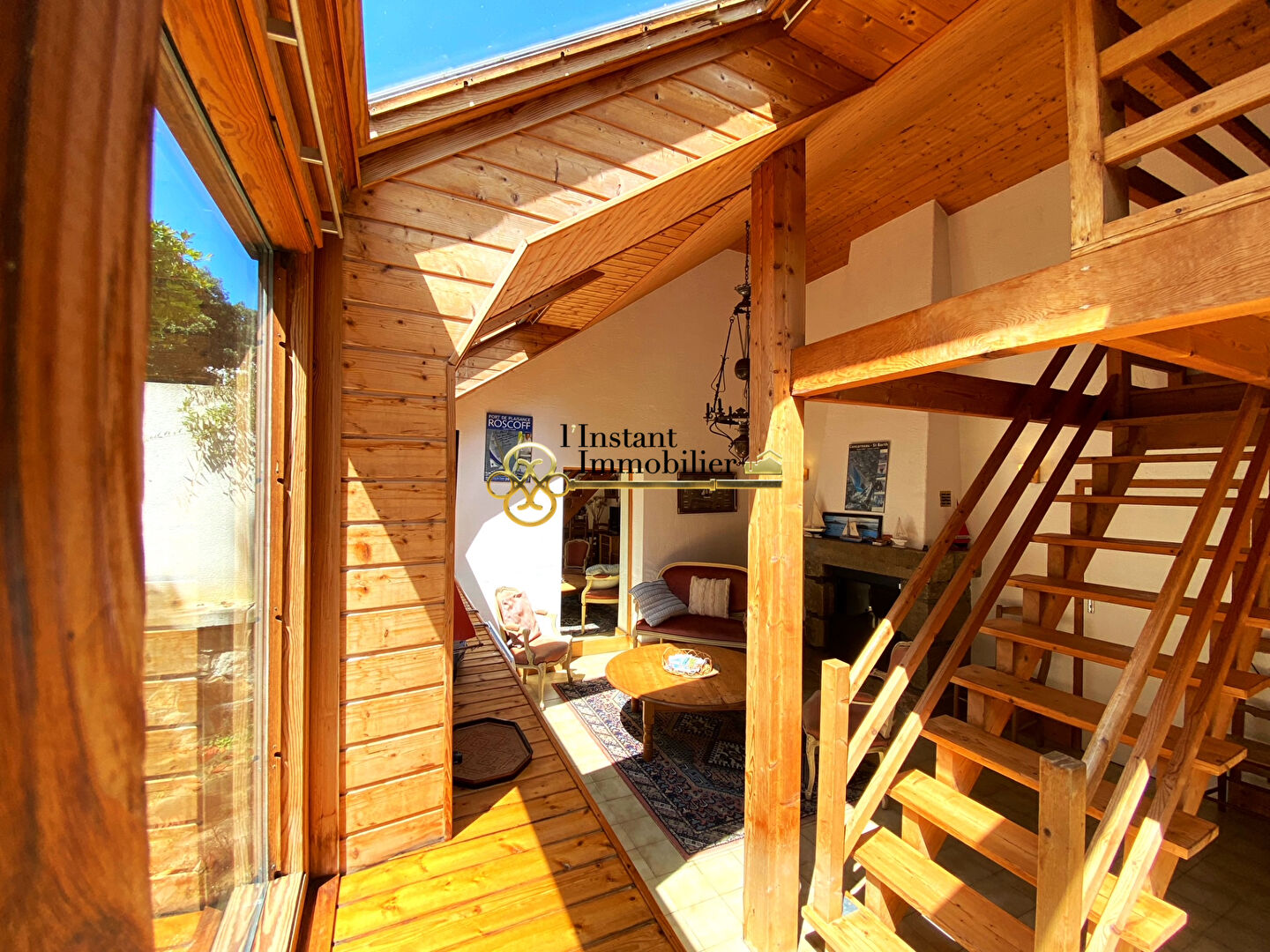 Vous êtes à la recherche d'une maison dans le secteur de Penn Al Lann. L'agence L'Instant Immobilier vous propose en exclusivité cette charmante maison en ossature bois de style cabane Tchanquée. Offrant une vue imprenable sur la mer, cette propriété unique est un véritable havre de paix. Située dans un environnement privilégié, calme et verdoyant, à l'abri de tout regard, elle vous charmera dès votre premier coup d'oeil. (Une extension vers le haut et un agrandissement possible vers l'avant de 4 mètres de large, et 13 de longueur). Une ambiance chaleureuse, un design atypique, un jardin sauvage et arboré. Cette maison très lumineuse, avec ses grandes ouvertures, se compose d'un grand vestibule d'entrée faisant aussi office de bureau, d'une grande pièce à vivre avec sa cuisine ouverte qui vous permettra de recevoir amis ou famille très confortablement. En complément, un espace de stockage et une grande salle d'eau. A l'étage, une mezzanine et une chambre avec toilettes et point d'eau. (5.50 % honoraires TTC à la charge de l'acquéreur.)