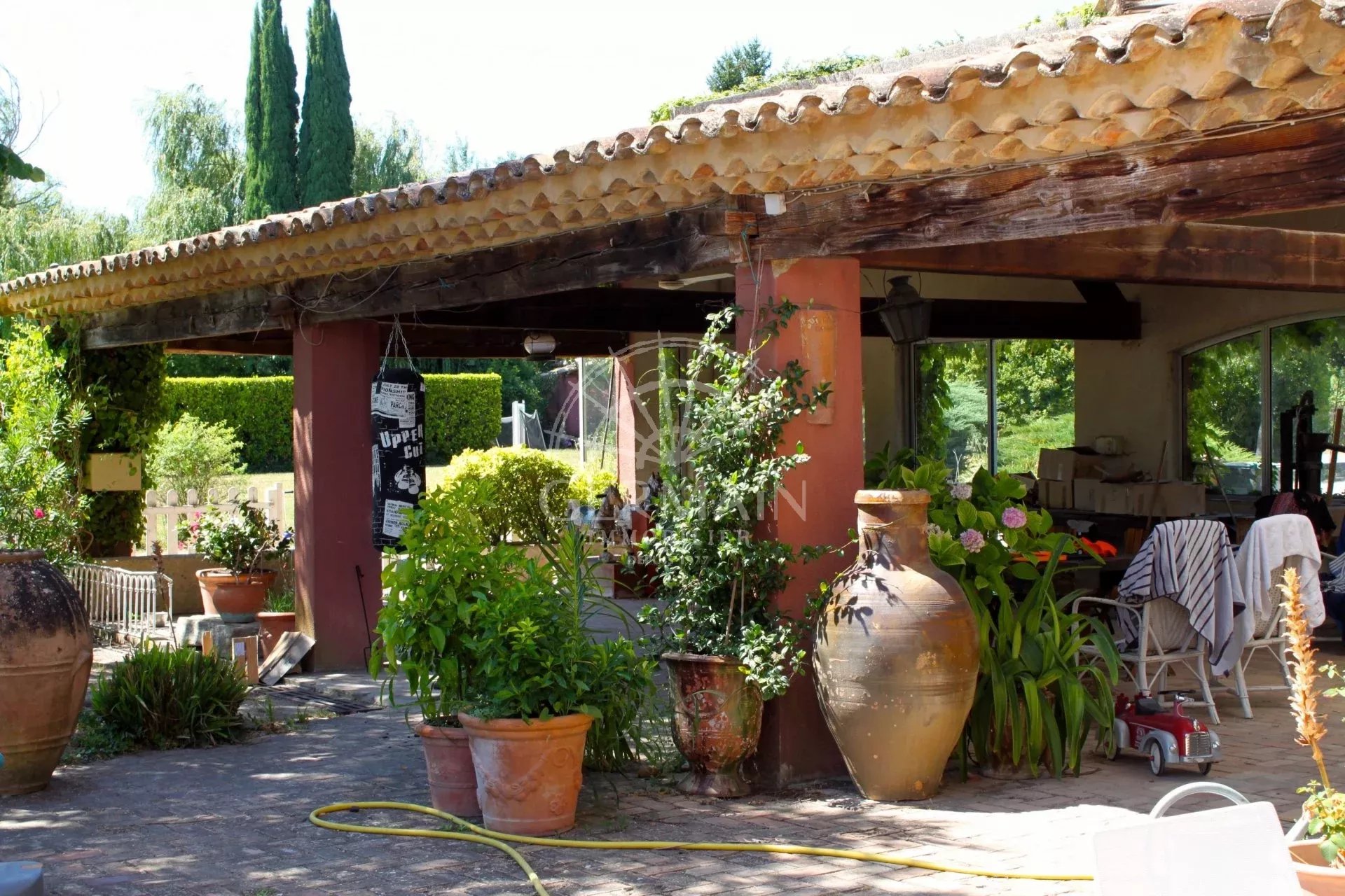 Le terrain de 1670 m2 entoure la maison, une partie de la terrasse est dallée et couverte
