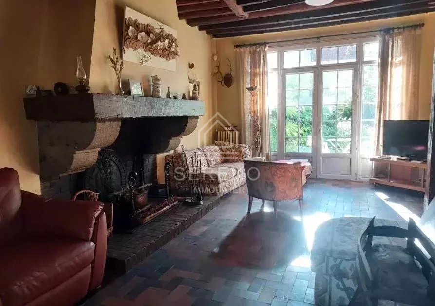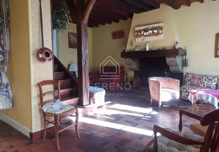 RDC : Une entrée, un grand salon d'environ 30 m² avec cheminée, accès aux 2 terrasses, une cuisine équipée indépendante, une vaste salle à manger, une salle d'eau, toilettes.