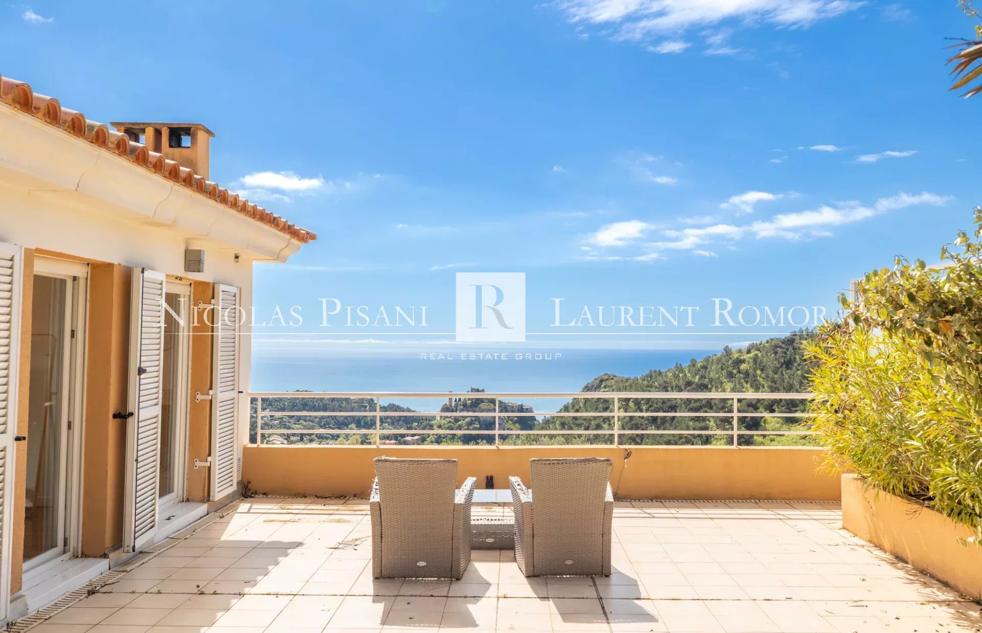 EZE - Située à proximité de Monaco et du village pittoresque d'Eze, appartement de 108m² de type duplex / penthouse en dernier étage d'une petite résidence, situé dans un domaine fermé à l'abris des regards, au calme absolu et bénéficiant d'une vue panoramique mer, montagne et village. Réparti sur deux niveaux avec de grands volumes, il dispose tout d'abord d'un espace salon cuisine équipée et ouverte, d'une chambre avec sa salle de bain, d'un toilette indépendant et d'une terrasse de 110m² avec une vue exceptionnelle. A l'étage, une grande suite parentale avec sa salle de douche et sa terrasse privative de 40m². Deux places de parking et un grand jardin privatif harmonieusement composé d'essences méditerranéennes sur 500m² complètent ce bien. Une cave peut être achetée en sus du prix. Les honoraires agence sont à la charge du vendeur.