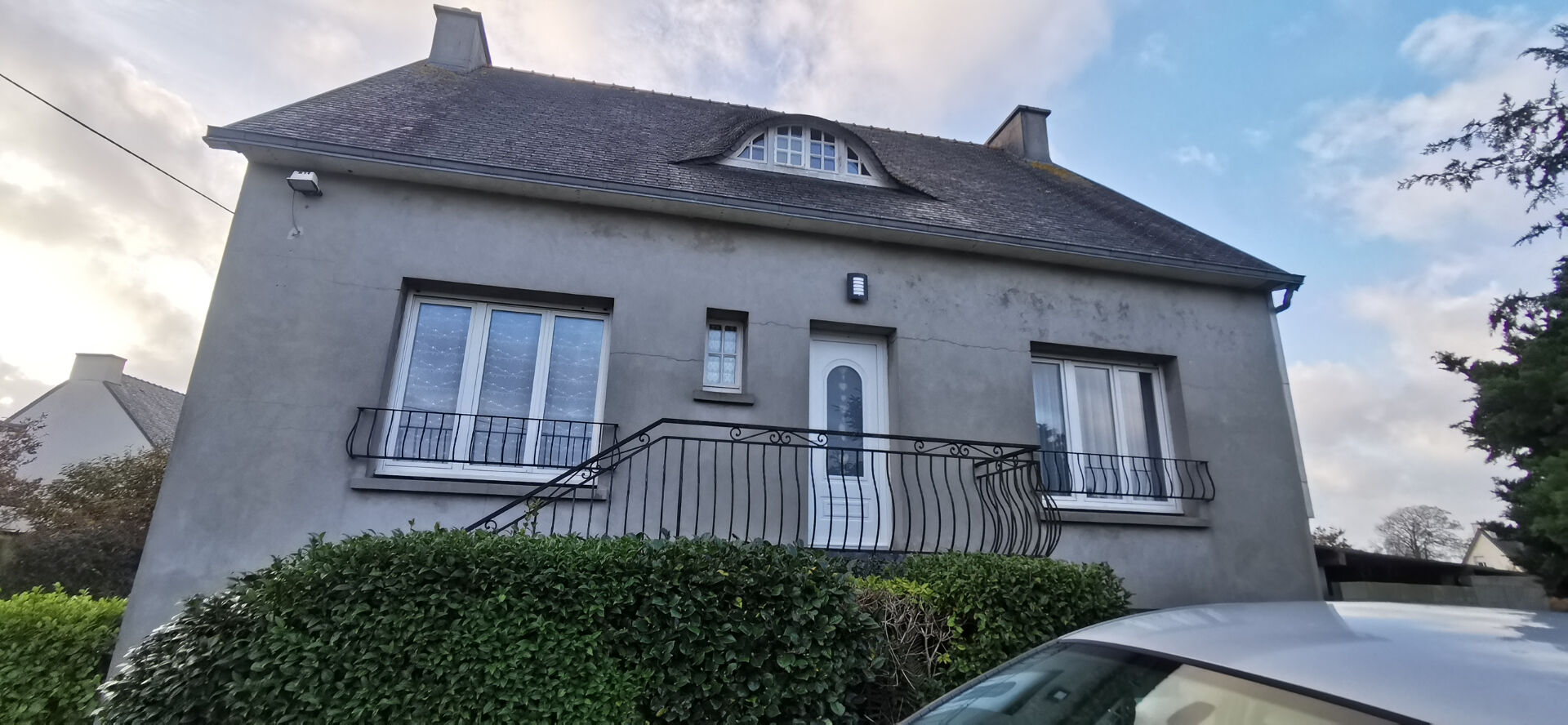 Maison néo bretonne édifiée sur un sous-sol complet. Elle se compose d'une entrée, d'une cuisine aménagée et équipée avec possibilité d'ouverture sur la pièce de vie, de deux chambres, d'une salle d'eau et d'un wc. A l'étage, un dégagement dessert 2 grandes chambres, une lingerie et une salle d'eau avec wc. Le tout sur un terrain d'environ 1057 m². Huisserie en double vitrage PVC avec volets roulets électriques, pompe à chaleur récente et isolation par l'extérieur. (3.64 % honoraires TTC à la charge de l'acquéreur.)
