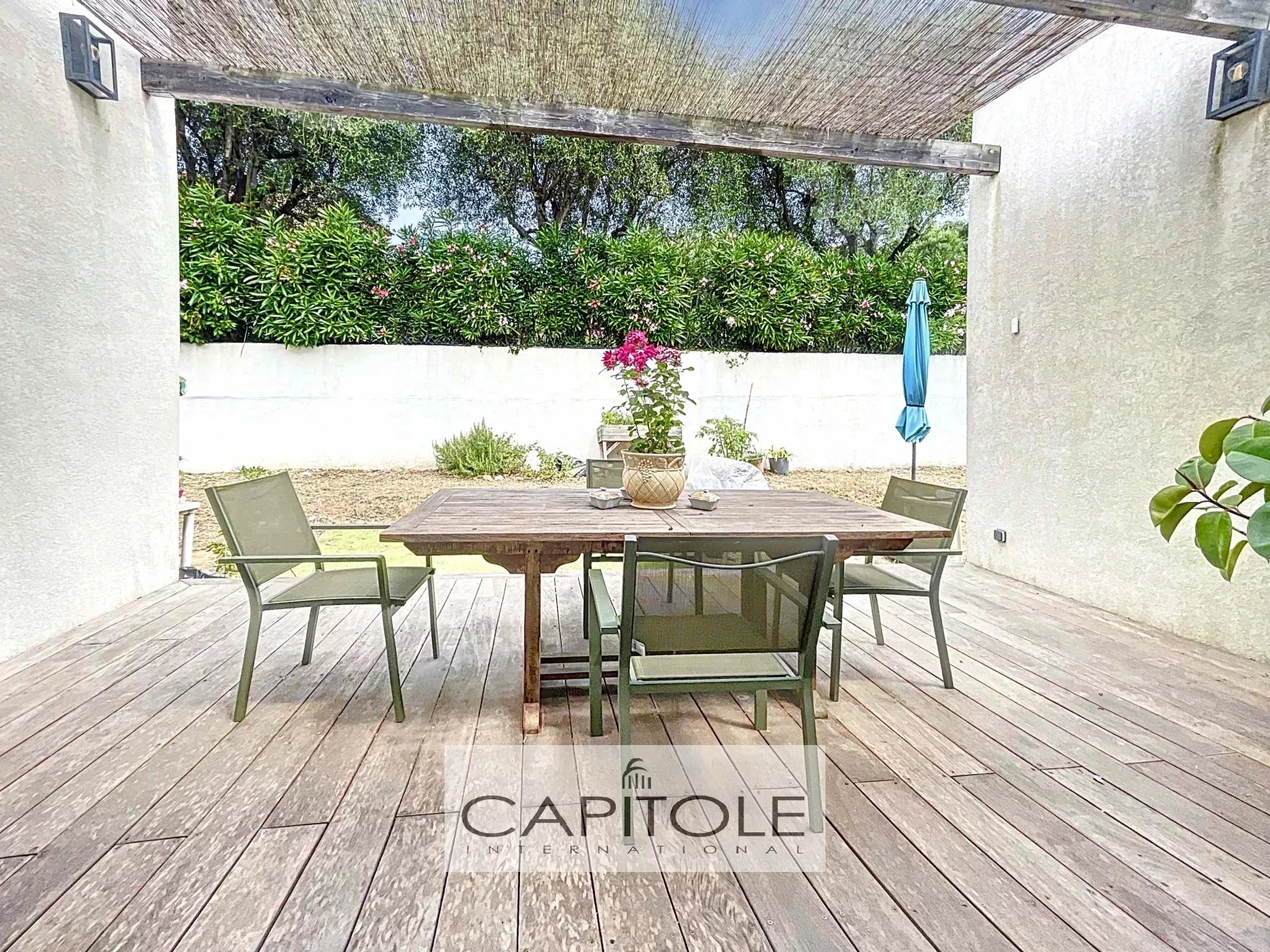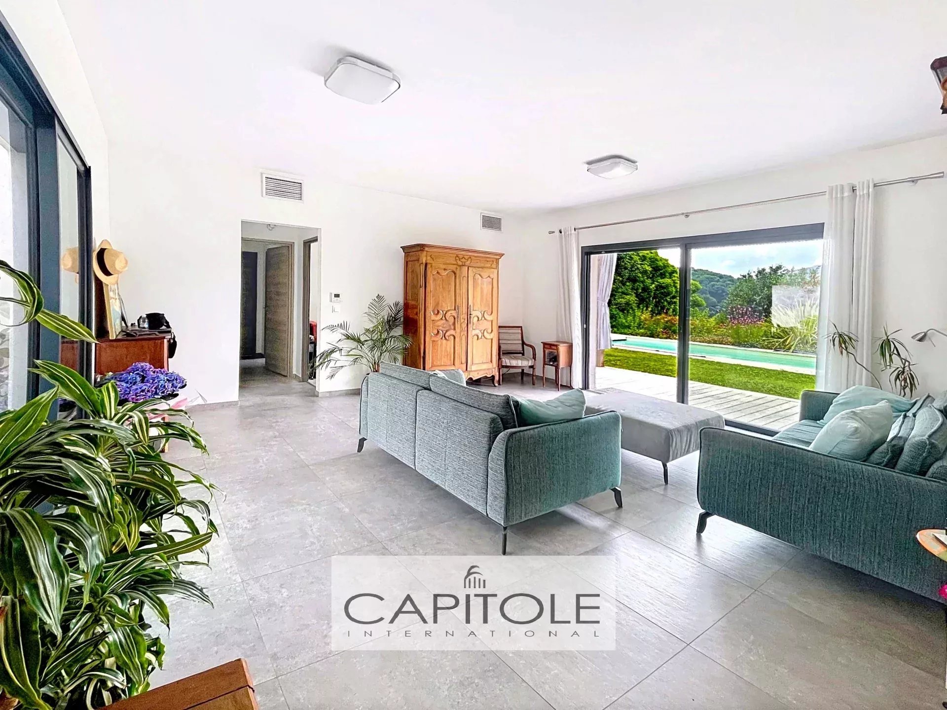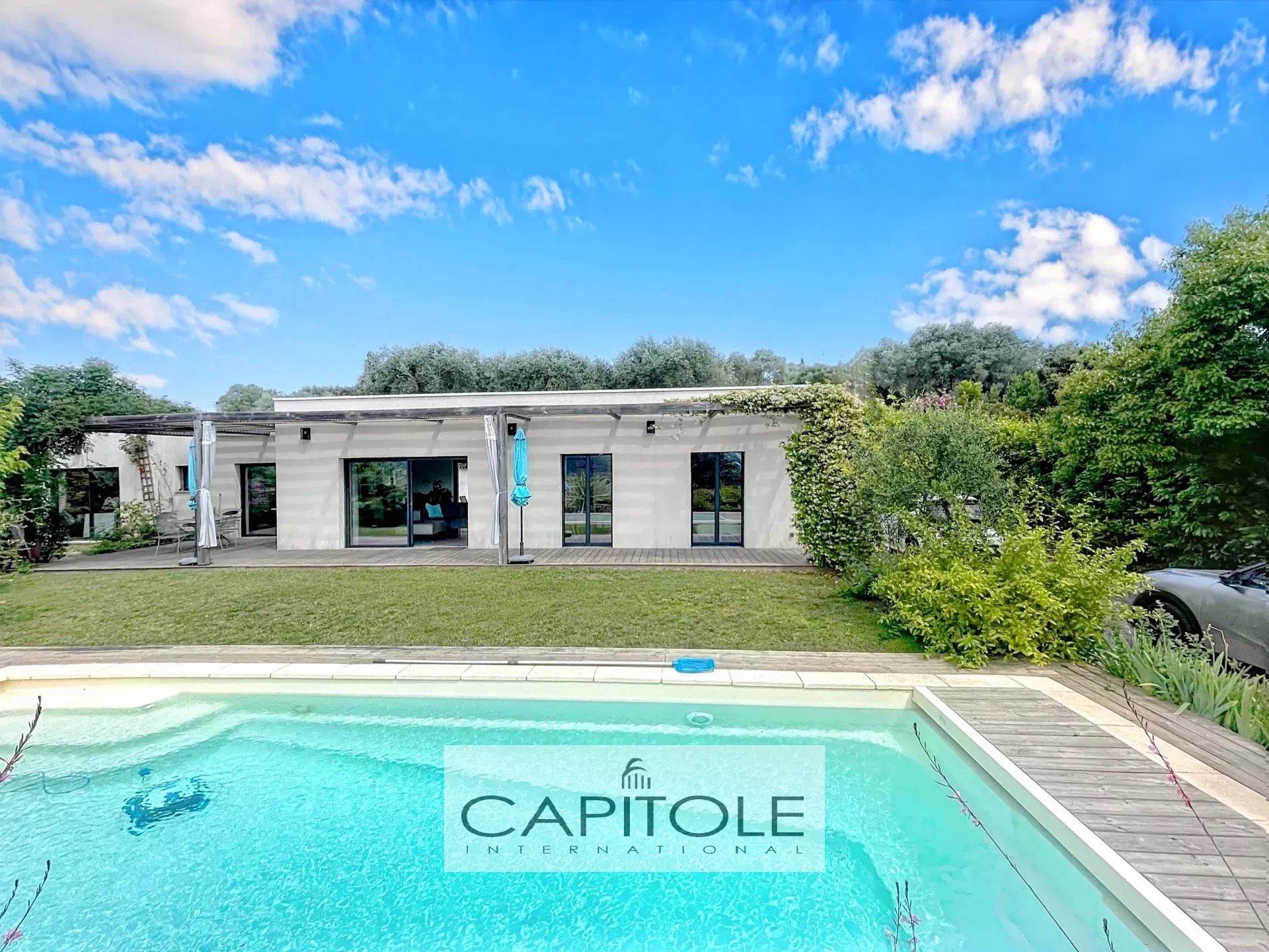 La villa affiche une excellente performance énergétique (classe A), grâce notamment à une pompe à chaleur réversible assurant confort été comme hiver.
