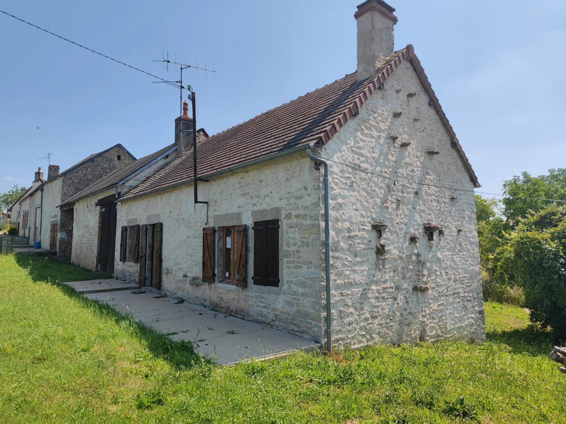 Longère mitoyenne à rénover sur la commune de Montapas, non loin de Châtillon en Bazois et de Saint-Saulge. D’une superficie habitable de 68m2, cette maison se compose d’une pièce principale de 30m2 avec coin cuisine, suivi d’une seconde pièce de 26m2 et d’une salle d’eau avec WC de 12m2. L’habitation est élevée sur 4 caves et vous disposez également d’une grange attenante de 48m2, d’un auvent ainsi que d’un grenier au dessus de la maison. La maison nécessite des travaux de rénovations importants, dont les sols de la maison (plancher en très mauvais état), des travaux de toiture ainsi que l’assainissement. L’ensemble est entouré d’un beau jardin de 1300m2. N’hésitez pas à nous contacter pour plus d’informations. Les honoraires sont à la charge du vendeur. Bien non soumis au DPE (absence de chauffage)