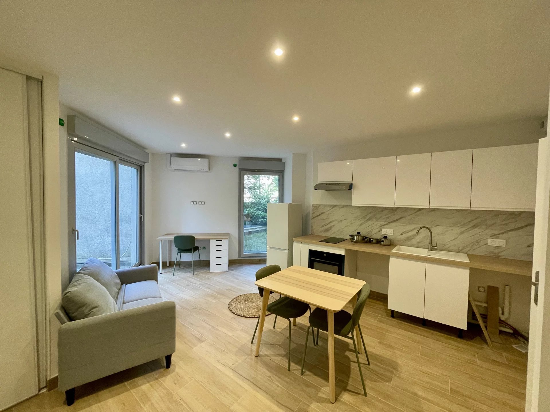 À louer : studio meublé de 31,28 m² situé en rez-de-jardin dans une résidence calme et bien entretenue du 7e arrondissement de Lyon. Proximité immédiate des commerces, des transports en commun (métro, tram, bus) et des établissements universitaires. Le logement a été entièrement rénové en 2025 avec des matériaux de qualité. Il est équipé d'une climatisation réversible, d'un mobilier complet et fonctionnel, et offre un cadre de vie confortable. Une laverie est également accessible au sein de la résidence. Loyer mensuel : Loyer hors charges : 760 € (plafonné à 24,40 €/m²) Provisions pour charges : 65 € / mois (incluant l'eau froide, l'entretien des parties communes, le nettoyage des locaux et les équipements communs) Loyer charges comprises : 825 € / mois Conditions de location : Dépôt de garantie : 1 520 € (équivalent à deux mois de loyer hors charges) Honoraires de location : 403 € TTC (13 €/m²) Disponibilité : immédiate Pour tout renseignement complémentaire ou pour organiser une visite, merci de nous contacter via la messagerie Le Bon Coin, par mail ou par téléphone. CABINET PERON PATRIMOINE