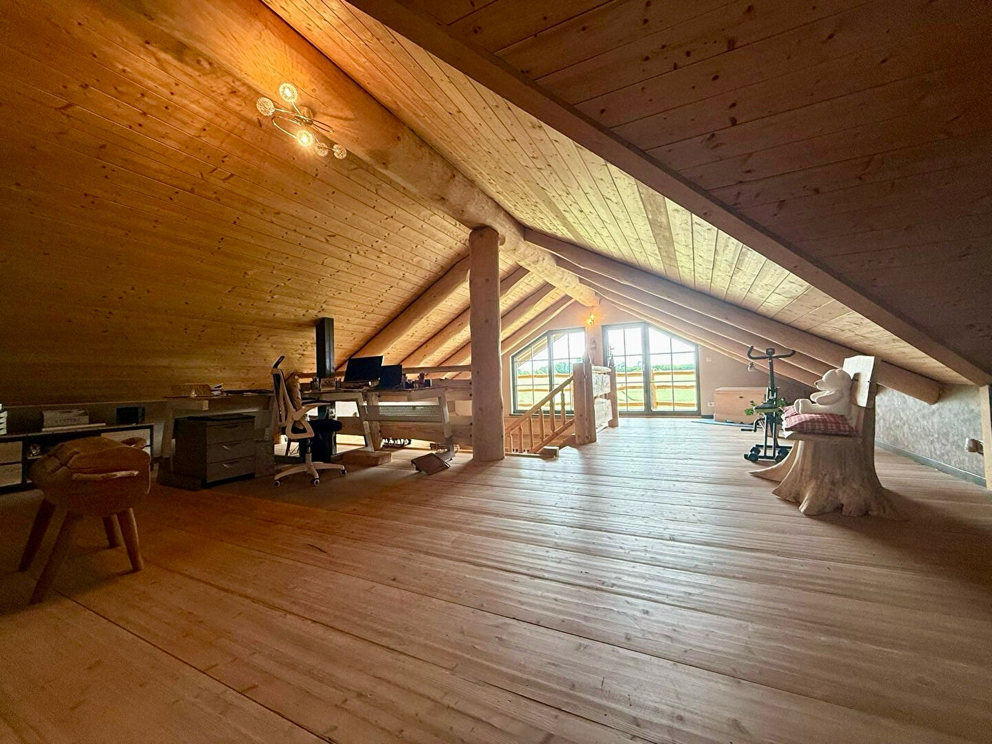 A VENDRE - AFTER Immobilier vous fait découvrir ce magnifique chalet en fuste construit en 2014 avec du Red Cedar du Canada, un bois noble et durable reconnu pour ses performances thermiques et son charme naturel. Situé au calme absolu, en bout d'impasse et sans vis-à-vis, ce bien rare offre 164 m² habitables sur un terrain arboré de 3227 m². Au RDC : entrée, grande salle à manger ouverte sur cuisine équipée, séjour avec accès à une 1ère terrasse. Suite parentale avec dressing et salle d'eau. WC indépendant. A l'étage : vaste mezzanine avec accès balcon, chambre avec salle d'eau privative, et une pièce supplémentaire aménageable (actuellement grenier). Sous-sol complet avec double garage, buanderie, cuisine d'été et rangements. Matériaux de qualité : triple vitrage, chauffage au sol, poêle à pellets performant, bois haut de gamme. Vous bénéficierez d'un garage/atelier indépendant adapté pour camping-car, réalisé dans le même esprit que la maison. Un bien rare, à visiter sans tarder ! Contact exclusif : Valentin COQUIN 06.71.02.46.00 - valentin.c@afterimmobilier.fr Les informations sur les risques auxquels ce bien est exposé sont disponibles sur le site Géorisques : www.georisques.gouv.fr.