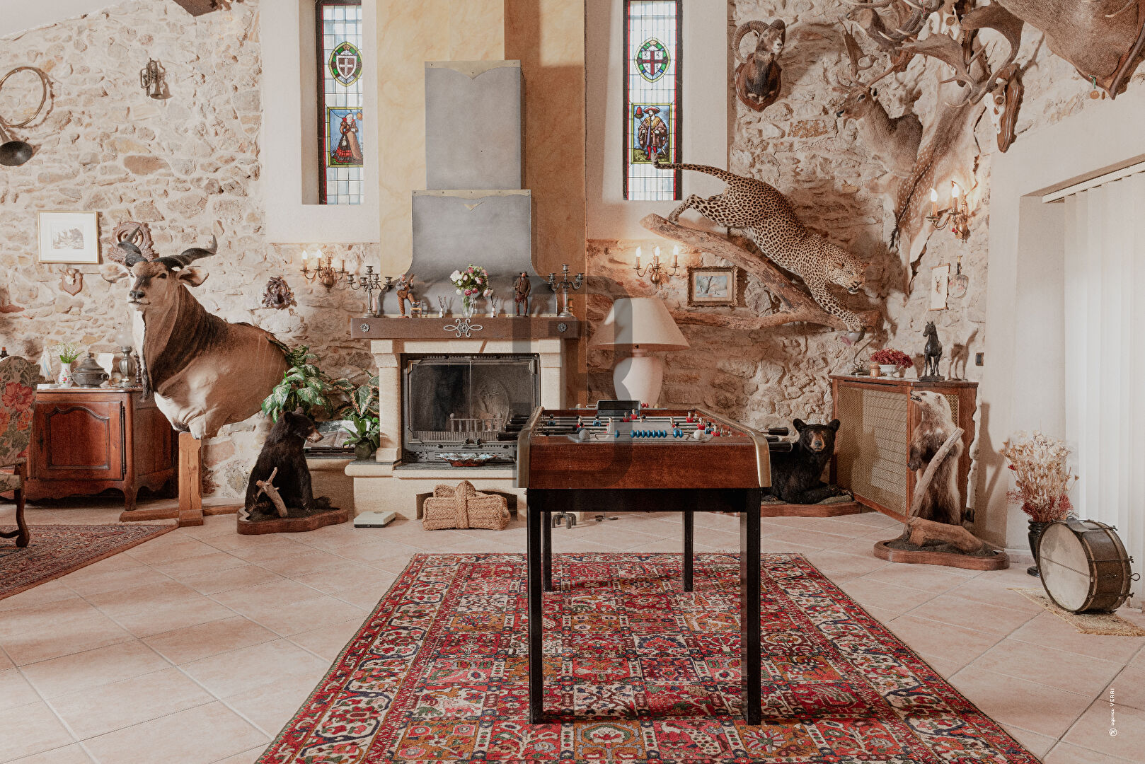L'ATYPIQUE PROPRIETE située a 30 minutes de LIMOUX A seulement 30 minutes de LIMOUX, cette propriété datant 1828 d'environ 425m2 et ses dépendances d'environ 150m2, sont édifiées sur un parc paysager de plus de 53ha. Avec son architecture épurée, une exposition plein Sud, cette demeure se distingue comme un bien unique, assurant une confidentialité et un cadre paisible et prestigieux, aux portes de la vie urbaine. Cette demeure insoupçonnable des regards, est magnifiée par des prestations hautes de gamme, de beaux volumes, une vue dégagée sur les vallons environnants et bénéficie d'une fluidité totale entre l'intérieur et l'extérieur qui lui confère une luminosité et un panorama remarquable. Dès l'entrée, vous serez séduits par le hall d'accueil avec un prestigieux escalier qui ouvre le pas sur le salon de 53m2 illuminé par de magnifiques vitro datant du 19eme siècle (copie du 13eme et 16eme siècles) Ce bien offre un confort inégalé, la pièce de vie d'environ 85m2environ regroupe salon, bar, espace dinatoire et cuisine entièrement équipée combinant harmonieusement le confort moderne. Les espaces nuits disposent de 3 suites parentales avec chacune leur salle d'eau ou salle de bain ainsi qu'un bureau semi ouvert. Une seconde maison de plain-pied totalement indépendante avec son parc agrémenté permettant un accueil pour loger du personnel ou des membres supplémentaires de la famille. Cela dévoile un espace d'opportunités infinies telles qu'une création d'activités libérales, atelier d'artiste, salle d'exposition ou totalement aménageable en habitation résidentielle ou projet d'investissement locatif. La propriété procède différentes dépendances qui viennent enrichir les prestations de la maison Le bien vous offre un potentiel qui ouvre le champ des possibles. Ce petit coin de paradis idyllique suggère la possibilité d'un aménagement pour hébergement en nuit insolite, pour qui recherche le dépaysement et la quiétude dans un havre de paix. Un environnement verdoyant et enchanteur, le développement d'opportunités professionnelles ou résidentielles, la possibilité d'apporter votre empreinte créative sont les atouts de cet ensemble immobilier atypique, promettant un joli cadre de vie pittoresque et inspirant. Pour découvrir ce bien vous pouvez contacter Carla au 06.37.69.29.20 ou Sandrine au 06.81.34.80.80