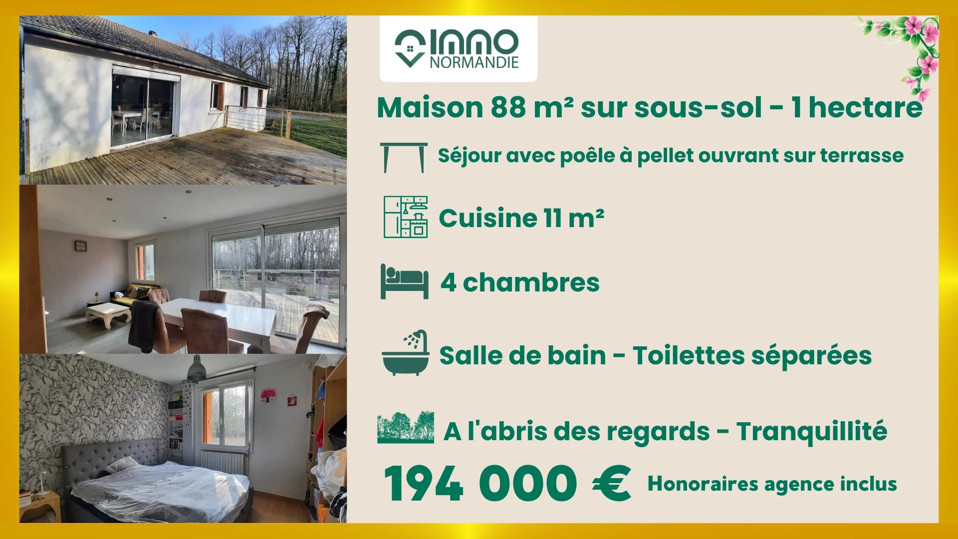 Pour amoureux de nature avec commerces et commodités à proximité Nichée dans un cadre boisé, cette maison chaleureuse construite sur sous-sol complet vous propose une entrée, cuisine ouverte sur séjour avec poèle à pellets et belle terrasse de 30 m². 4 chambres - salle de bain - toilettes séparées Accès au sous-sol par intérieur A l'abris des regards - Tranquillité Contact : Benjamin ROMUALD - 06.33.72.85.24 - entrepreneur individuel (E.I.) agissant en sa qualité d'Agent Commercial, inscrit au Registre Spécial des Agents Commerciaux sous le numéro RSAC 812 264 455 00013