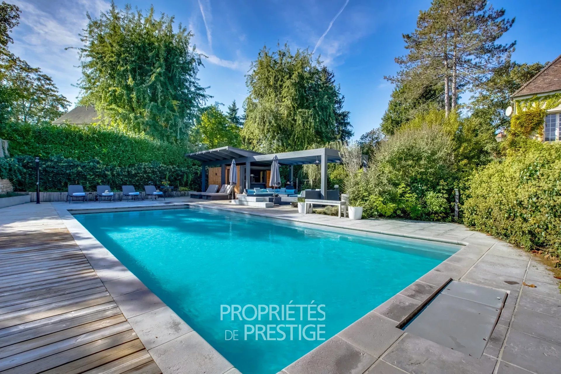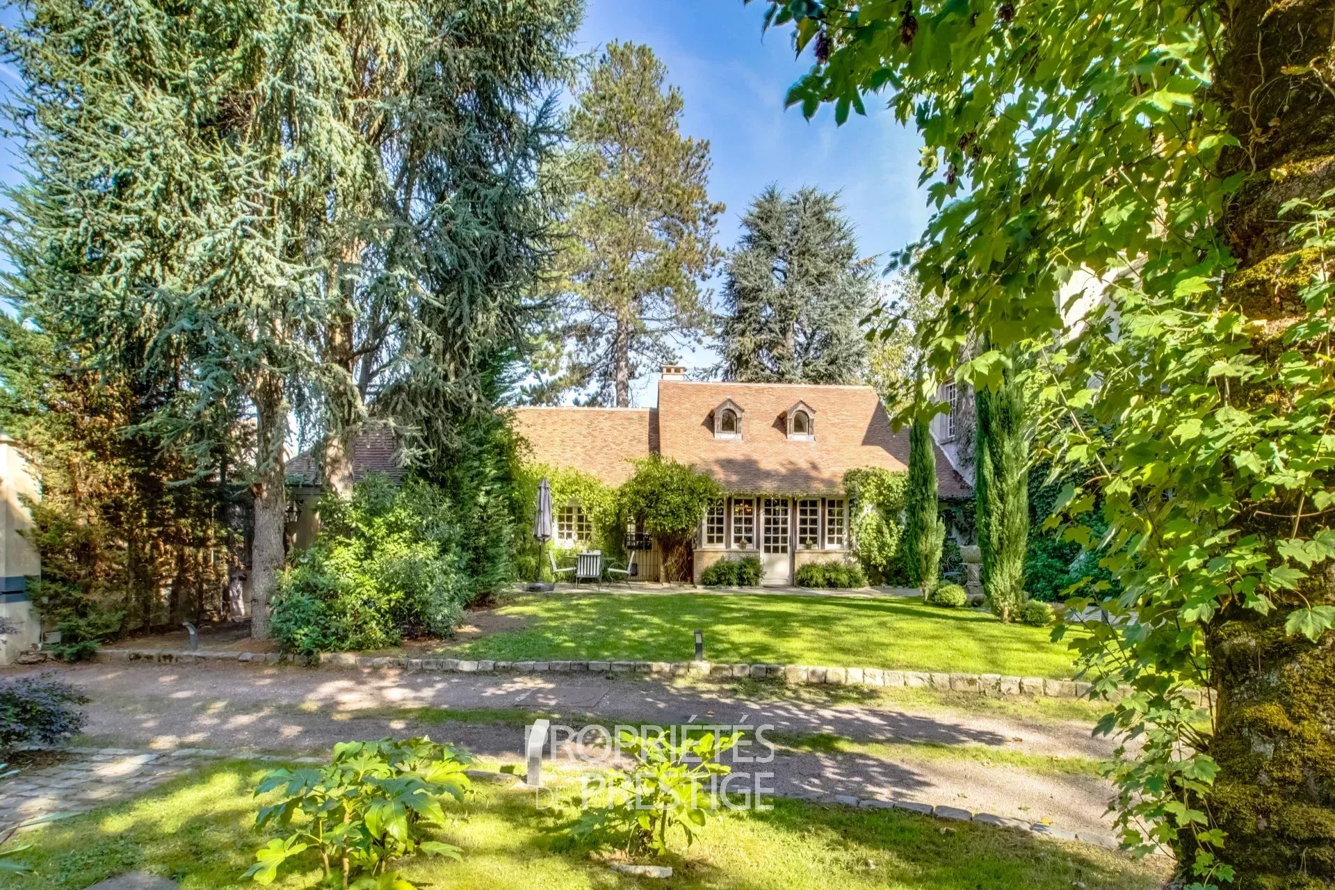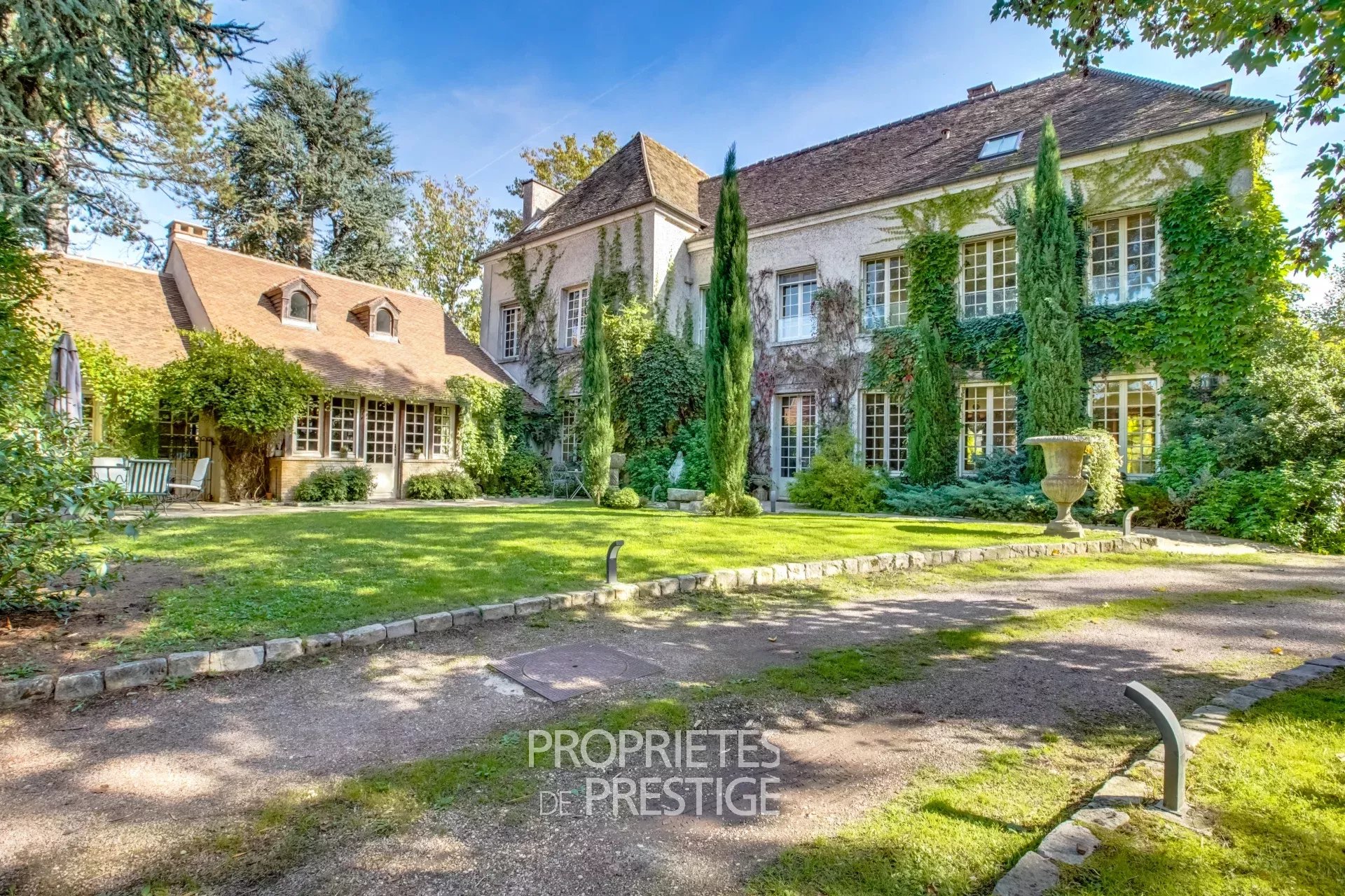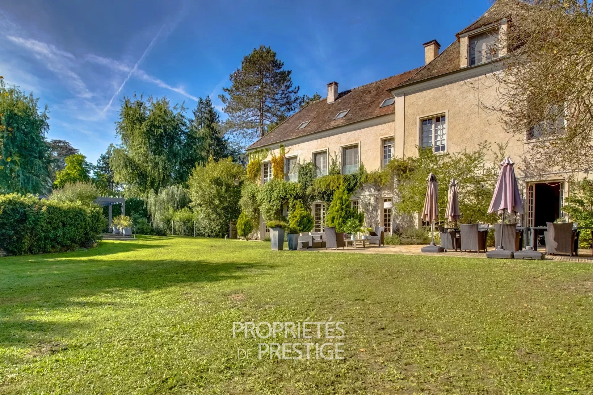 Rare, au centre de Montfort-L'Amaury, ancien prieuré transformé en grande demeure familiale de 600m² édifiée sur un beau terrain arboré et paysagé de près de 3000 m2. Les travaux de rénovation réalisés par les propriétaires ont permis de conserver la charme de l'ancien avec une organisation des espaces correspondant aux besoins d'une grande famille. Au rez-de-chaussée, l'entrée côté cour distribue vers un vaste salon avec cheminée et une grande salle à manger avec bureau attenant, l'ensemble de ces pièces offrant un accès de plain pied vers la terrasse côté jardin. Dans l'aile de la bâtisse se trouve une très grande cuisine avec espace dinatoire, une chambre avec salle de bain en RDC, un espace détente avec sauna une buanderie à l'étage, cet espace pouvant être à usage de bureau avec accès indépendant ou d'appartement de gardien. Au premier étage, côté jardin, vaste suite parentale avec salle de bain, salle de douche et dressing. Dans cette partie de la bâtisse, également quatre autres chambres toutes avec salle de bain ou douche; dans l'aile côté cuisine, une cinquième grande chambre avec salle de bain. Au deuxième étage, deux chambres avec salle de bain, un salon de lecture, deux grandes salles de jeu avec des couchages supplémentaires. Les espaces extérieurs sont agrémentés d'une vase terrasse, d'un espace barbecue avec cuisine d'été et surtout d'un grand espace aménagé autour de la piscine avec solarium, terrasses, bar, pool house (réalisation 2017). La propriété est situé à 300m de l'hyper-centre de Montfort et du marché (le dimanche), 3 km de la gare pour Montparnasse en 35 min, 40 km de Paris.