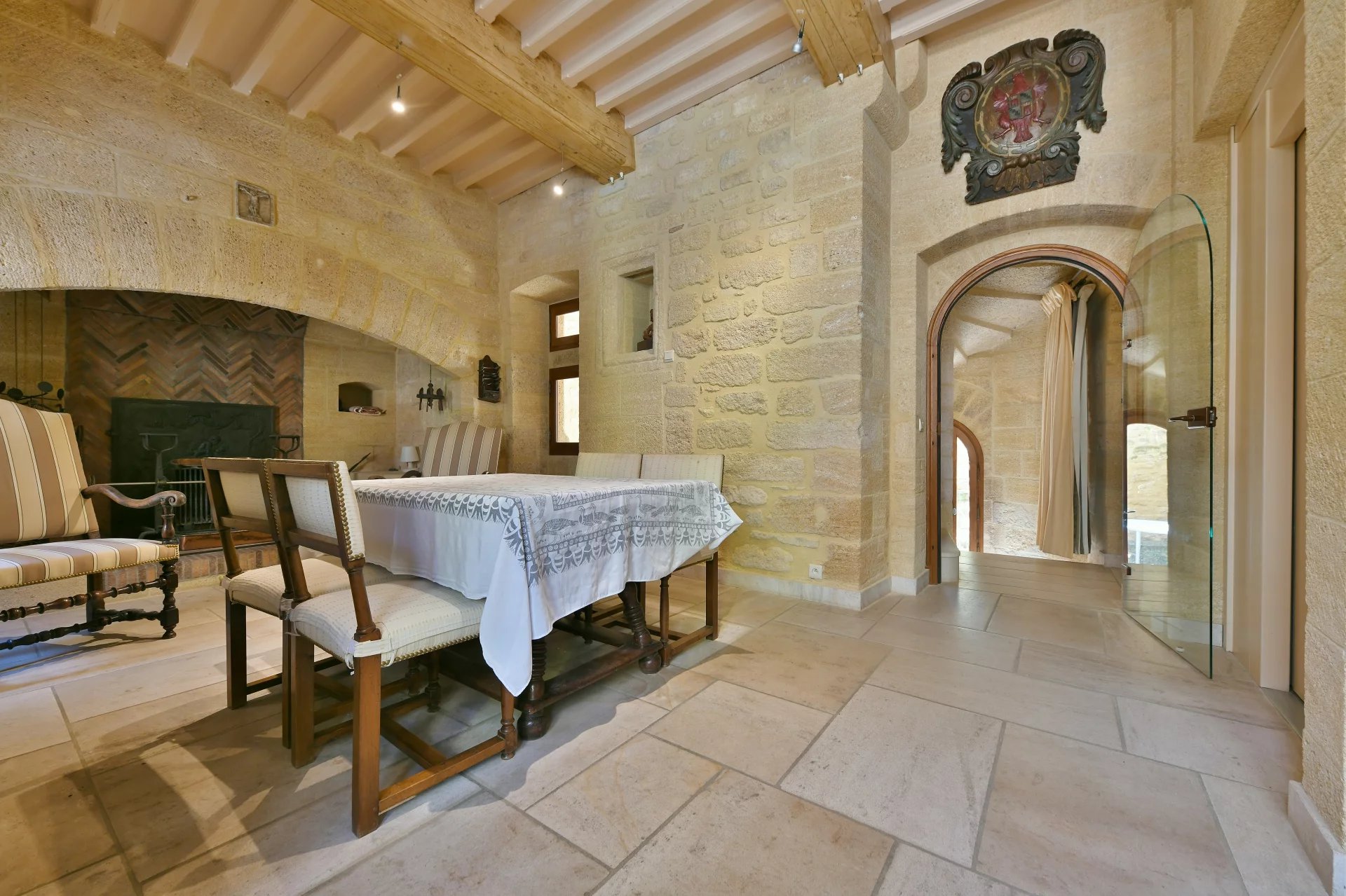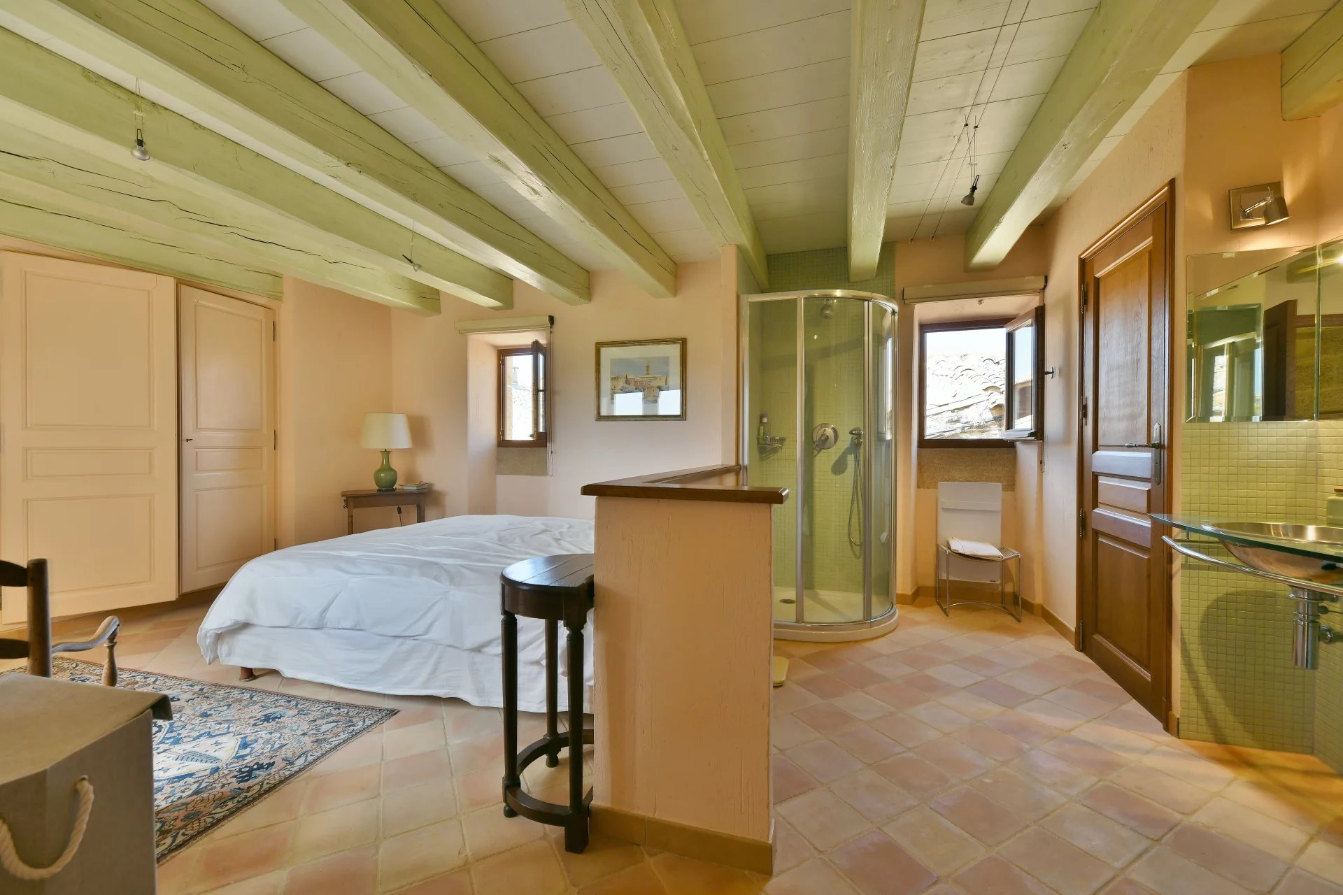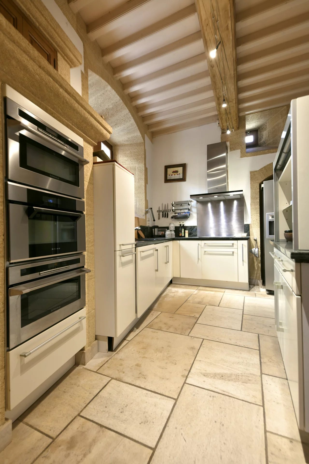La propriété de village sur plusieurs niveaux est desservie par un ascenseur Unique ensemble de réception totalisant 105 m² (Rez-de-chaussée et 1er étage) 3 chambres, 2 salles de bains et dressing (suite principale accessible en ascenseur) Cour et terrasses, dont une sur les toits. Prestations de grande qualité.