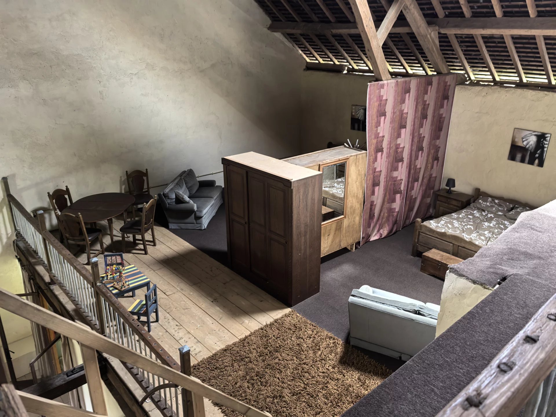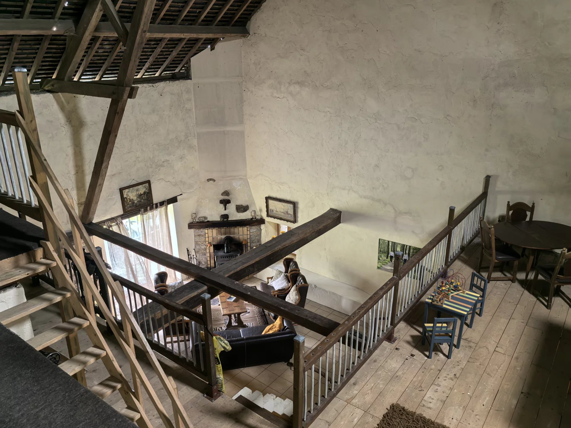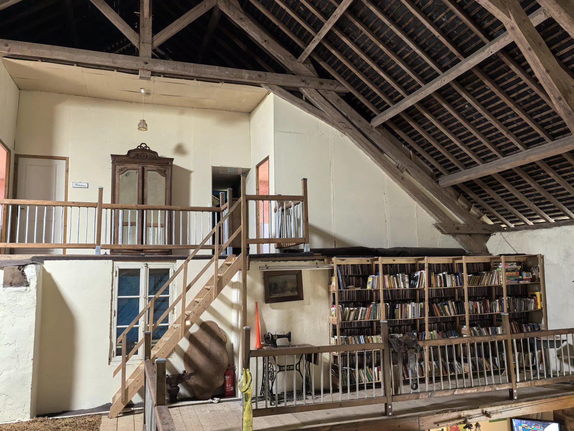 La partie habitation se compose au rez-de-chaussée d’une grande pièce de vie en cathédrale avec près de 11m de hauteur sous plafond, suivie d’une cuisine avec salle à manger et d’une salle de bain avec WC. Au premier étage, un grand palier accueille un espace dortoir ainsi qu’une bibliothèque et le deuxième étage se compose de trois chambres.