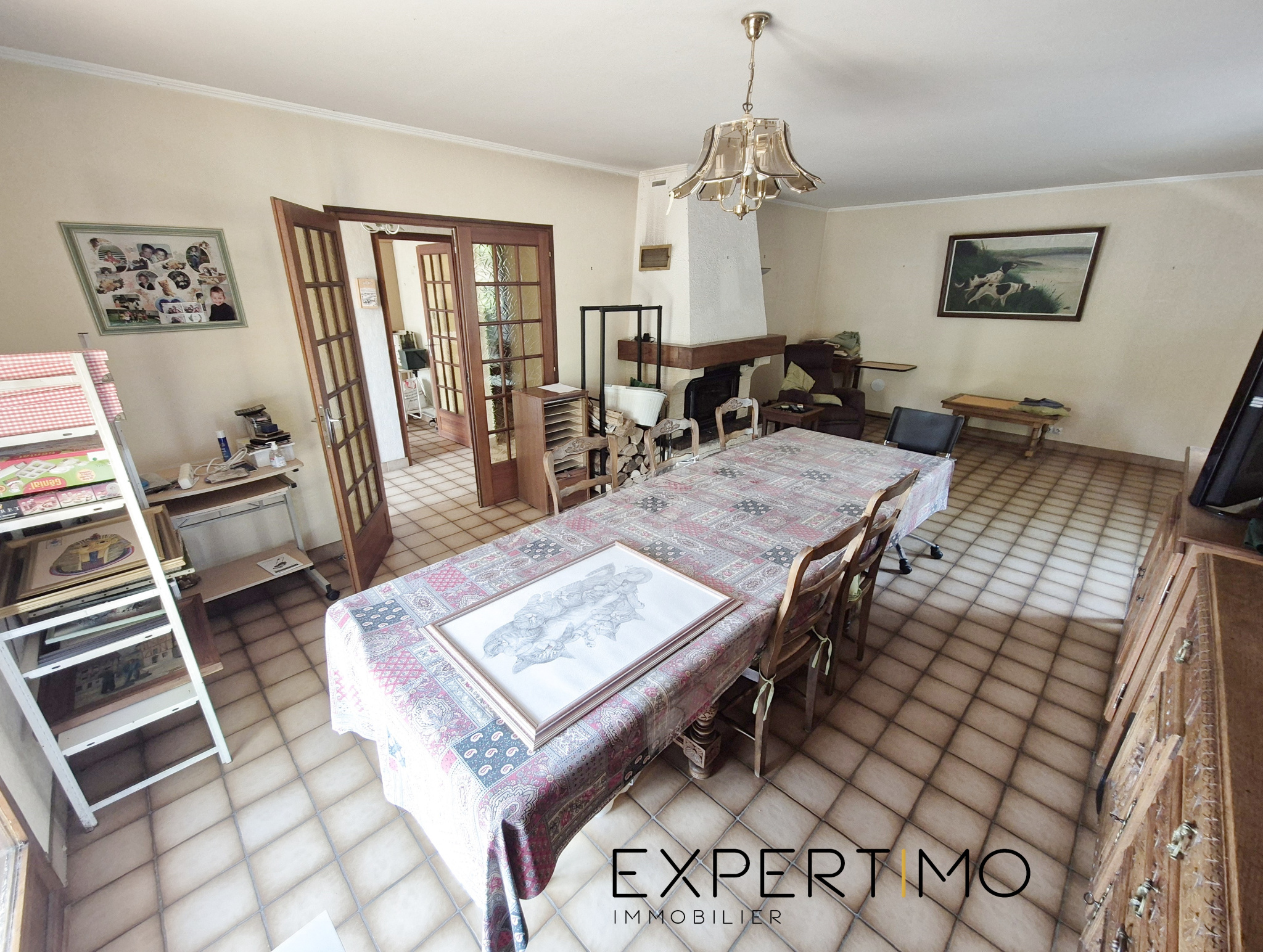 Composée d'une entrée avec placard, un séjour salon / salle à manger avec cheminée insert qui dispose d'un accès direct sur le jardin et la terrasse.