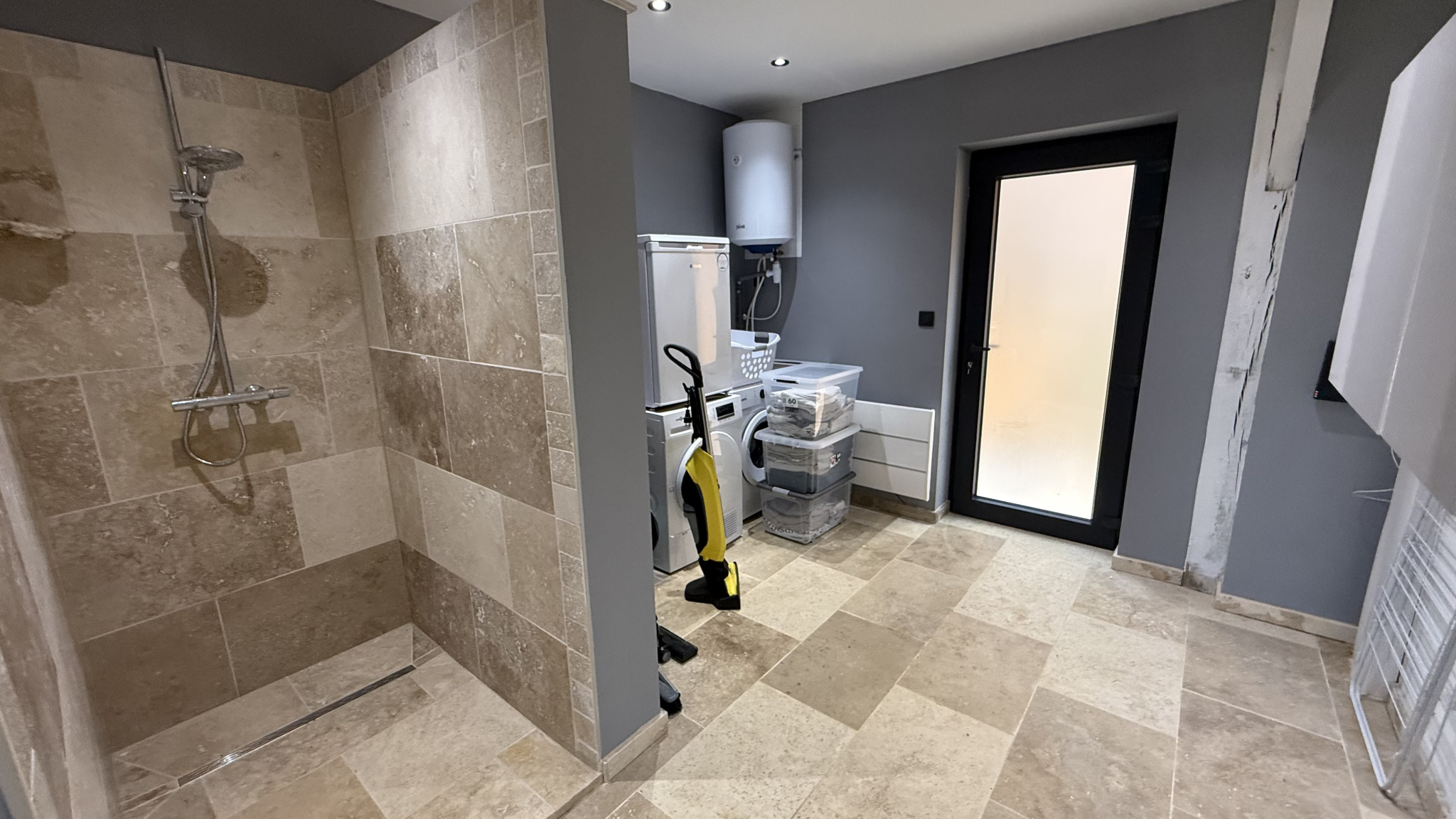 o Une vaste entrée ouvre sur la buanderie avec douche, les toilettes, et sur la pièce de vie de 85 m2, salon avec poêle à granulés, salle à manger et cuisine équipée avec îlot central.