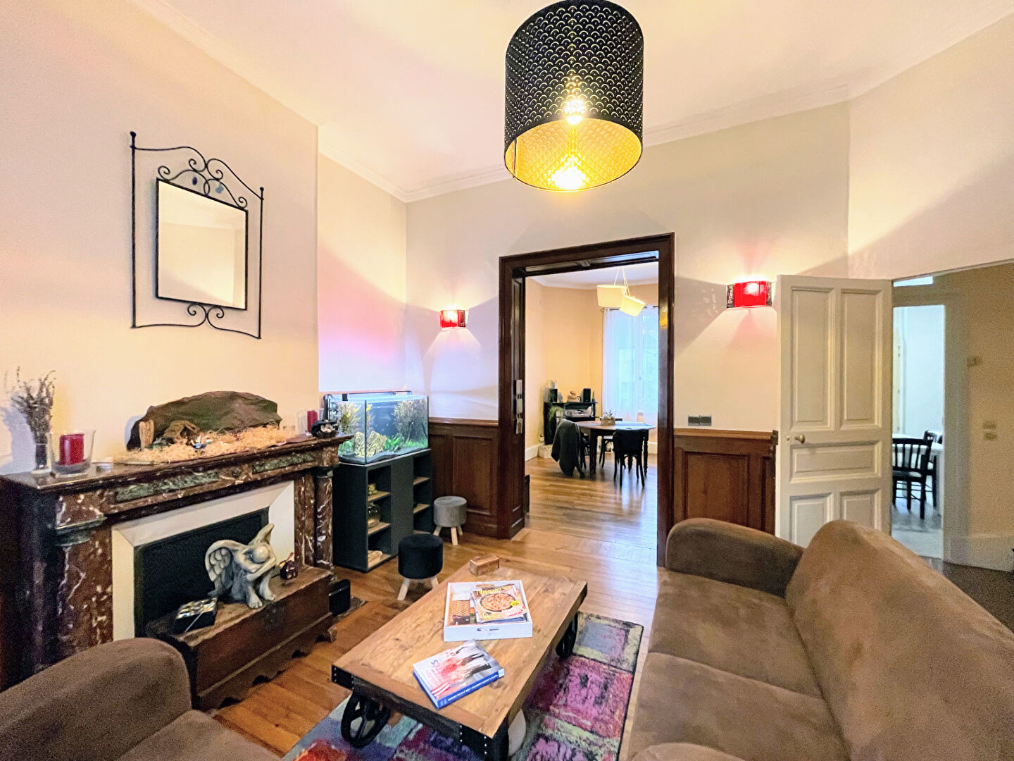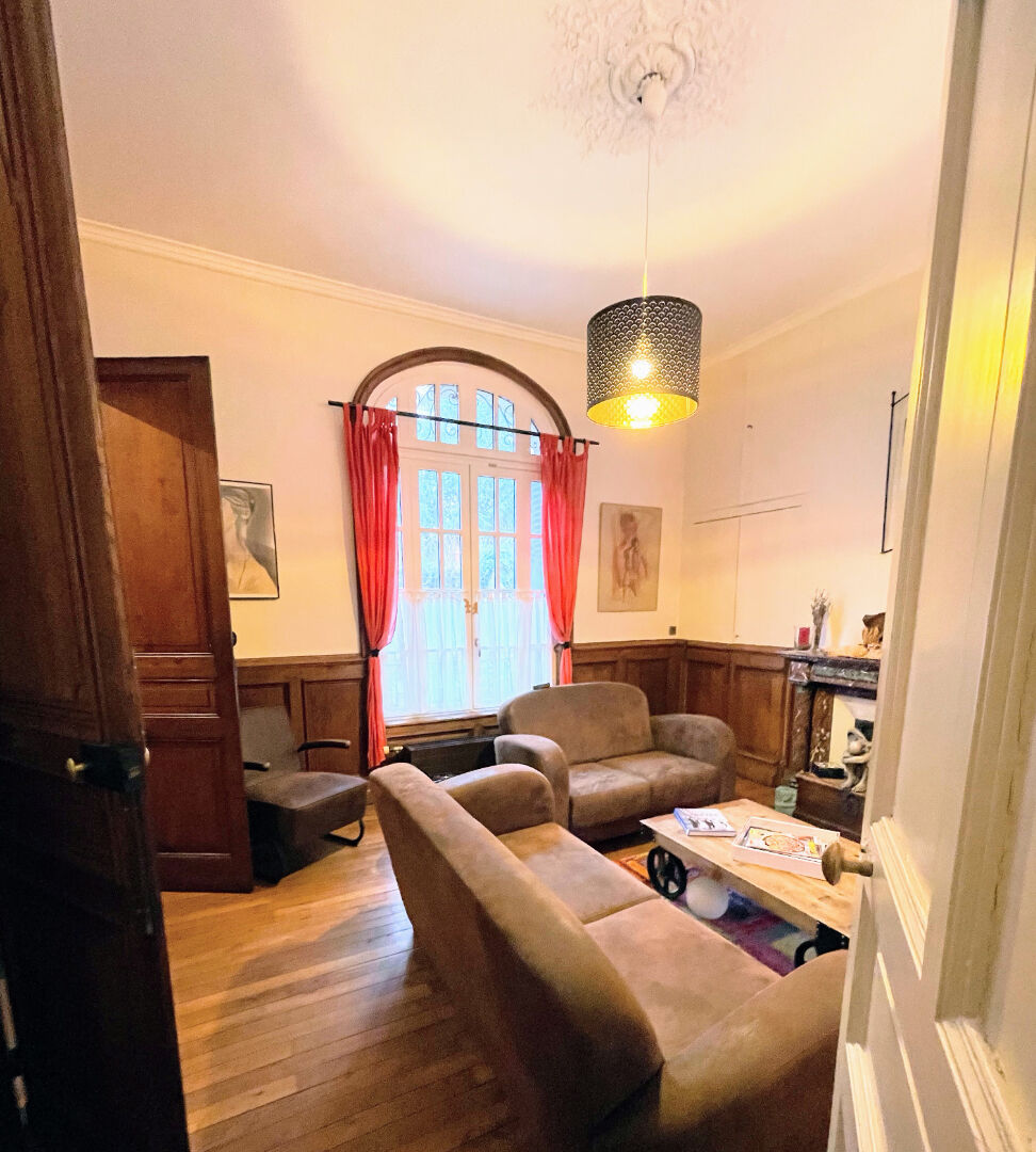 Amateurs de maisons de charme, cette belle bâtisse du début du siècle ne pourra que vous séduire. Entièrement réhabilitée en toiture, elle allie cachet ancien et fonctionnalité moderne. Elle offre au rez-de-chaussée : une entrée accueillante ouvrant sur un salon lumineux, une salle à manger attenante, une cuisine donnant directement sur la terrasse, ainsi qu'un WC et un accès au sous-sol. Aux étages : 4 chambres, 2 salles de bains, un second WC indépendant et un bureau confortable pour le télétravail ou les devoirs. Le sous-sol, complet, comprend une buanderie, une cave et une grande pièce polyvalente idéale pour une salle de jeux, de sport ou de musique, avec accès direct au jardin et à sa seconde terrasse. Vous apprécierez également son stationnement privatif et son agréable jardin clos, rare en centre-ville. (5.77 % honoraires TTC à la charge de l'acquéreur.)