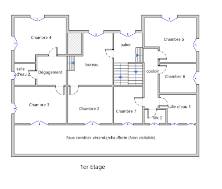 Maison familiale avec 8 chambres, deux salons, cuisine, salle à manger, 3 salles d'eau / salles de bain, buanderie, chaufferie, une belle véranda ouverte sur une cour intimiste, et de généreuses hauteurs sous plafond.
