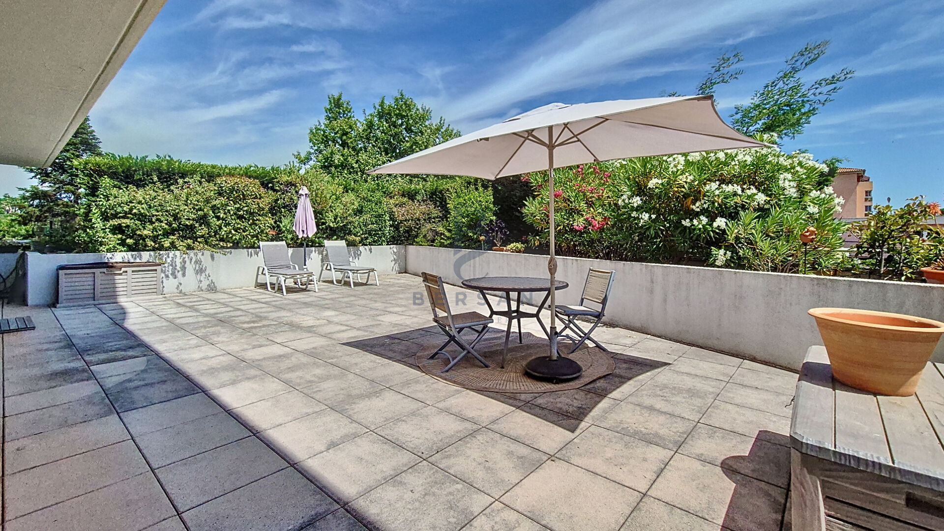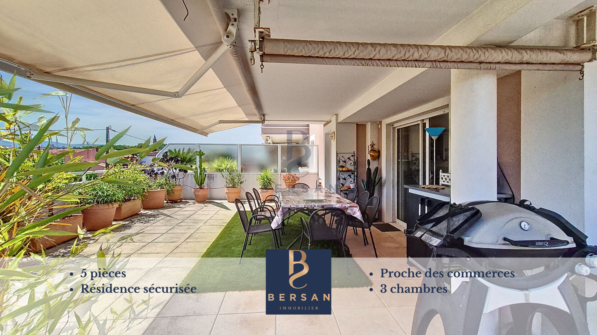 ** VENDU PAR VOTRE AGENCE BERSAN Immobilier** EXCLUSIVITÉ BERSAN Immobilier, à deux pas des commerces et des commodités, venez découvrir ce spacieux appartement 5 pièces situé au sein d'une résidence sécurisée de bon standing, offrant de belles prestations. Dès l'entrée, un hall avec WC invités et lave-mains vous accueille et vous mène vers un vaste espace de vie baigné de lumière, composé d'un séjour double et d'une grande cuisine ouverte, aménagée et équipée avec soin. Ce bel ensemble forme un lieu de vie convivial et chaleureux, idéal pour les moments en famille ou entre amis. Le véritable atout de ce bien se révèle dès l'ouverture des baies vitrées : une terrasse d'exception de plus de 150 m², orientée de façon optimale pour profiter d'une exposition idéale tout au long de la journée. Un espace de vie extérieur à part entière, parfaitement adapté à la détente, aux repas en plein air, ou à la création de différents coins lounge. Côté nuit, l'appartement propose trois chambres climatisées, dont une suite parentale avec salle de bains et WC privatifs, garantissant confort et intimité. Une salle d'eau indépendante, une buanderie, un cellier et un second WC viennent compléter ce bien parfaitement fonctionnel. Pour votre confort au quotidien, l'appartement est vendu avec un stationnement extérieur privatif ainsi qu'un box fermé en sous-sol, facilement accessible. Cet appartement réunit tous les critères d'un véritable bien coup de coeur : de très beaux volumes intérieurs, une terrasse rare par ses dimensions, une situation pratique à proximité immédiate des commerces, et un cadre de vie sécurisé. Pour toute information complémentaire ou pour organiser une visite virtuelle "live", toute l'équipe BERSAN Immobilier se tient à votre disposition. Copropriété de 60 lots - dont 30 lots habitation. (Pas de procédure en cours). Charges annuelles : 2249 euros.