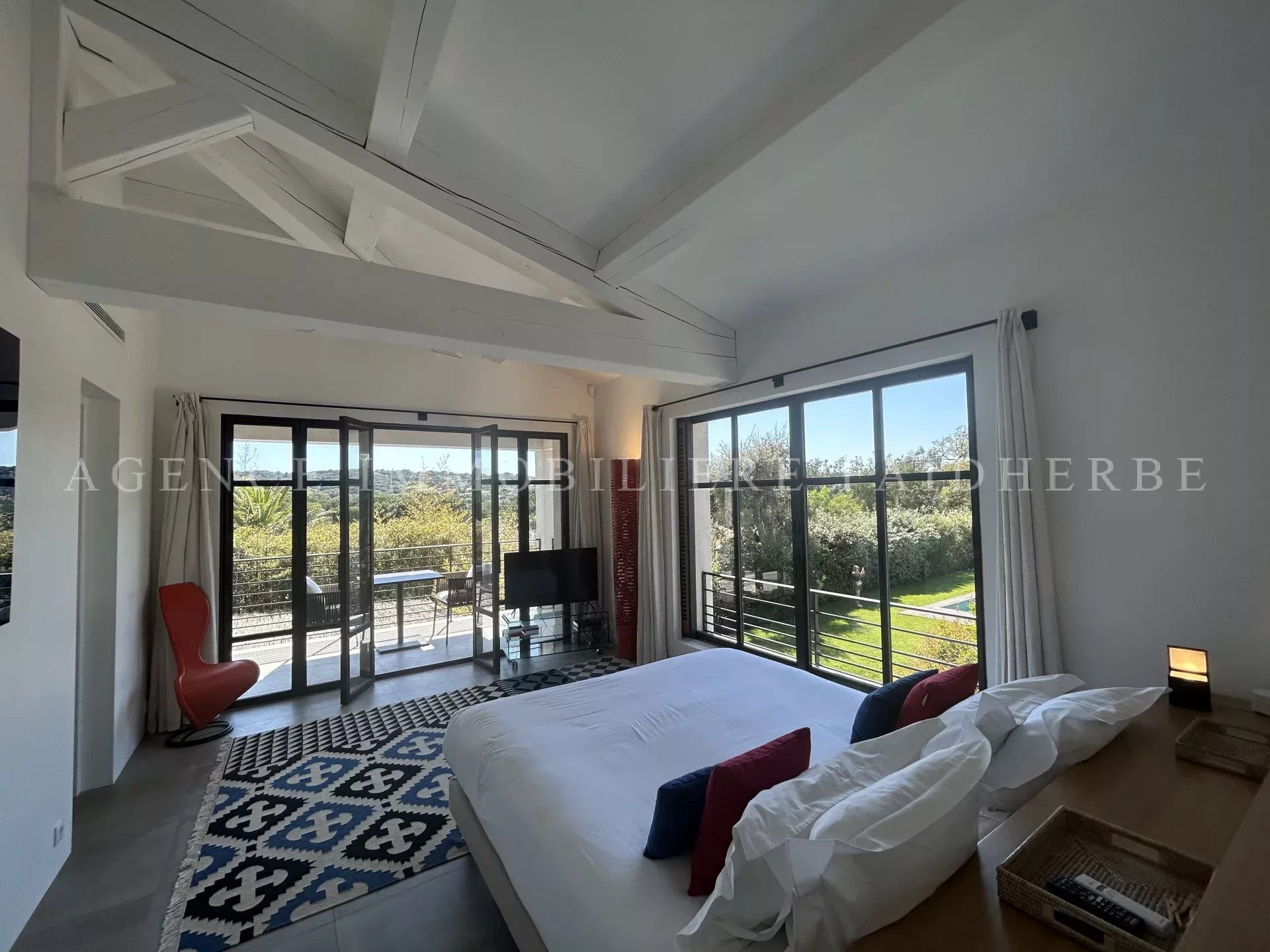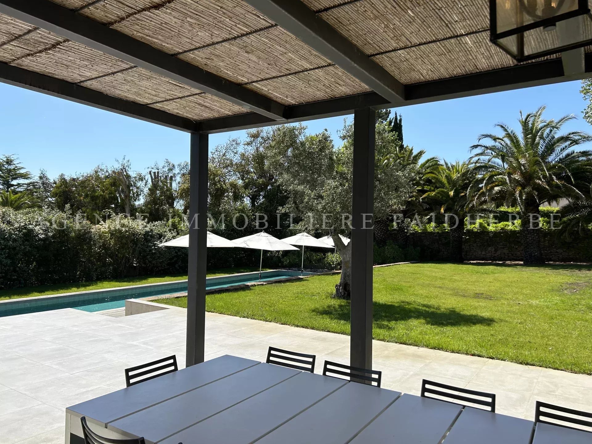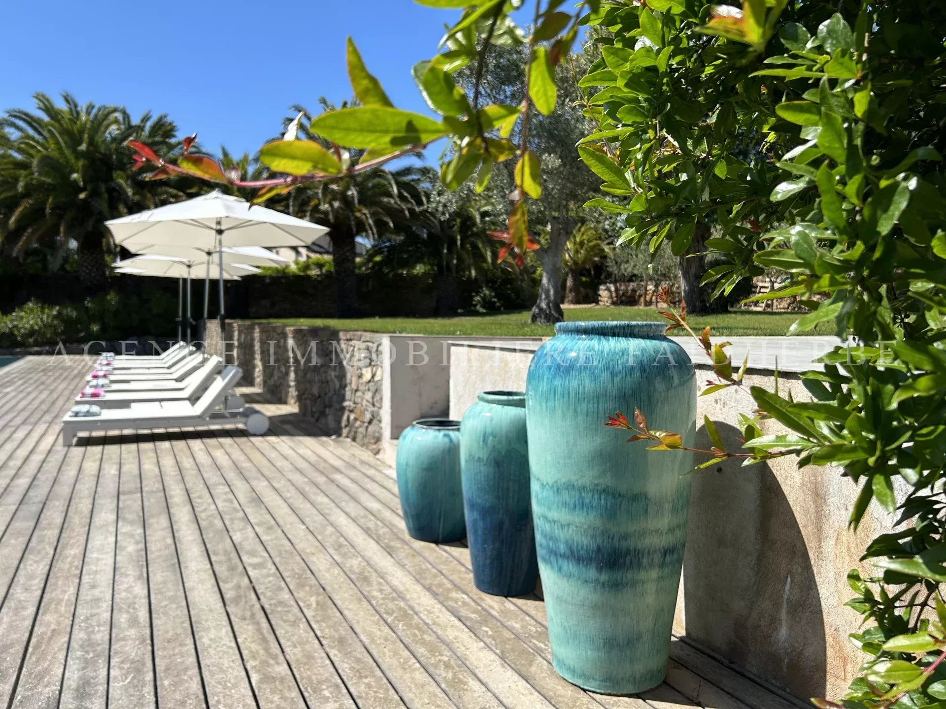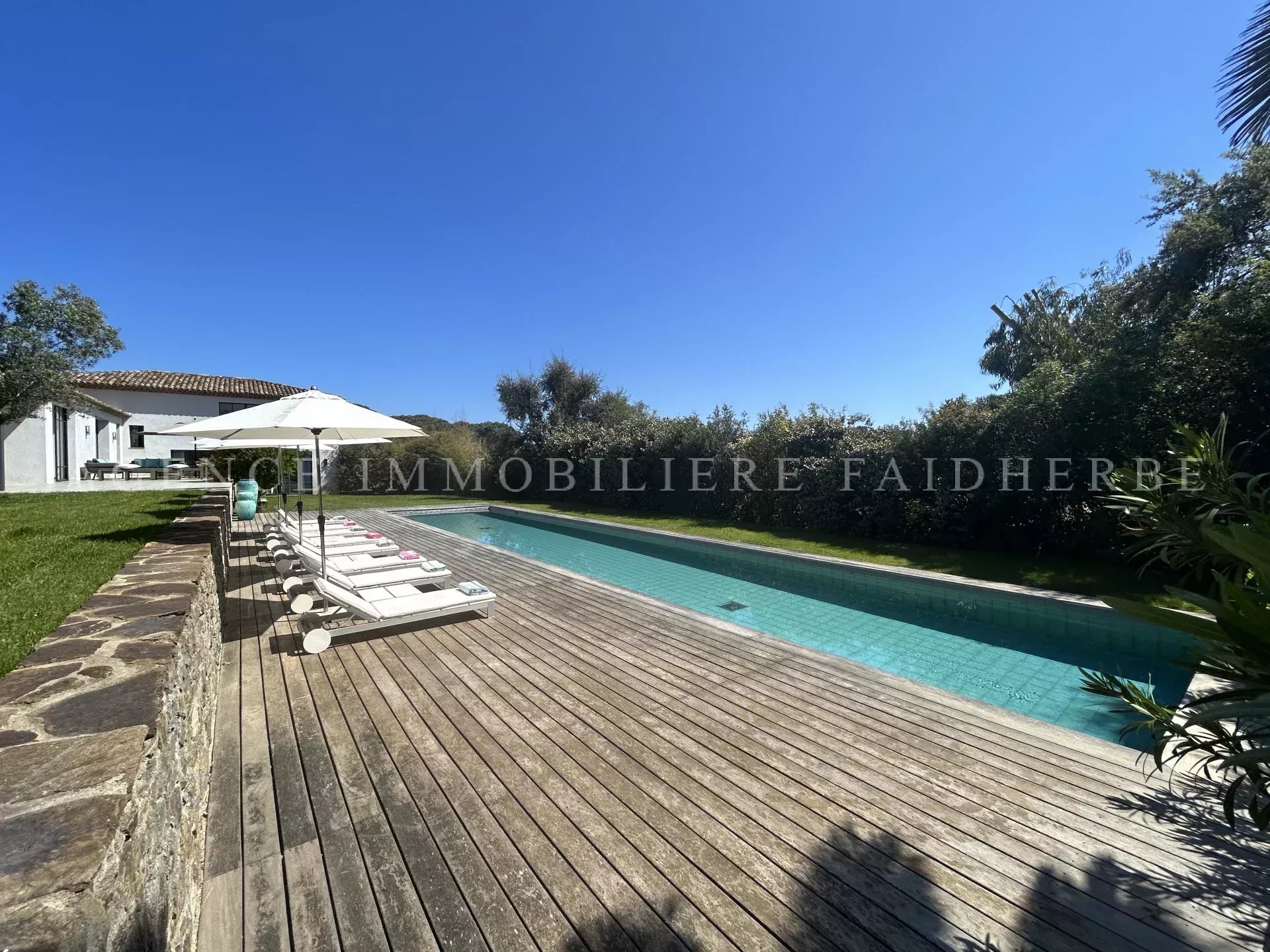 REF 166 Magnifica villa nuova et di stile contemporaneo situata in "Chemin des Treilles de la Moutte", composta da: Al piano terra: 2 camere con letti da 160 cm + bagno con doccia e wc 1 camera con 2 letti da 90 cm + bagno con doccia e wc 1 camera per bambini con 3 letti da 90 cm + bagno e wc Lavanderia con lavatrice, asciugatrice e congelatore Salone con Tv stellitare e WIFI Cucina con 2 lavastoviglie, forno, microonde, etc Al primo piano: 1 camera con letto da 180 cm + bagno con vasca, doccia, bidet et wc, et balcone 1 camera con letto da 160 cm 1 bagno con doccia e wc Piscina da 20x4 m Terreno da 2000 m2 Spese supplementari: pulizia, affitto biancheria da letto, tassa di soggiorno Biancheria da bagno inclusa