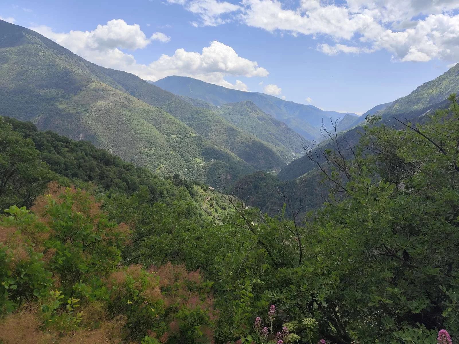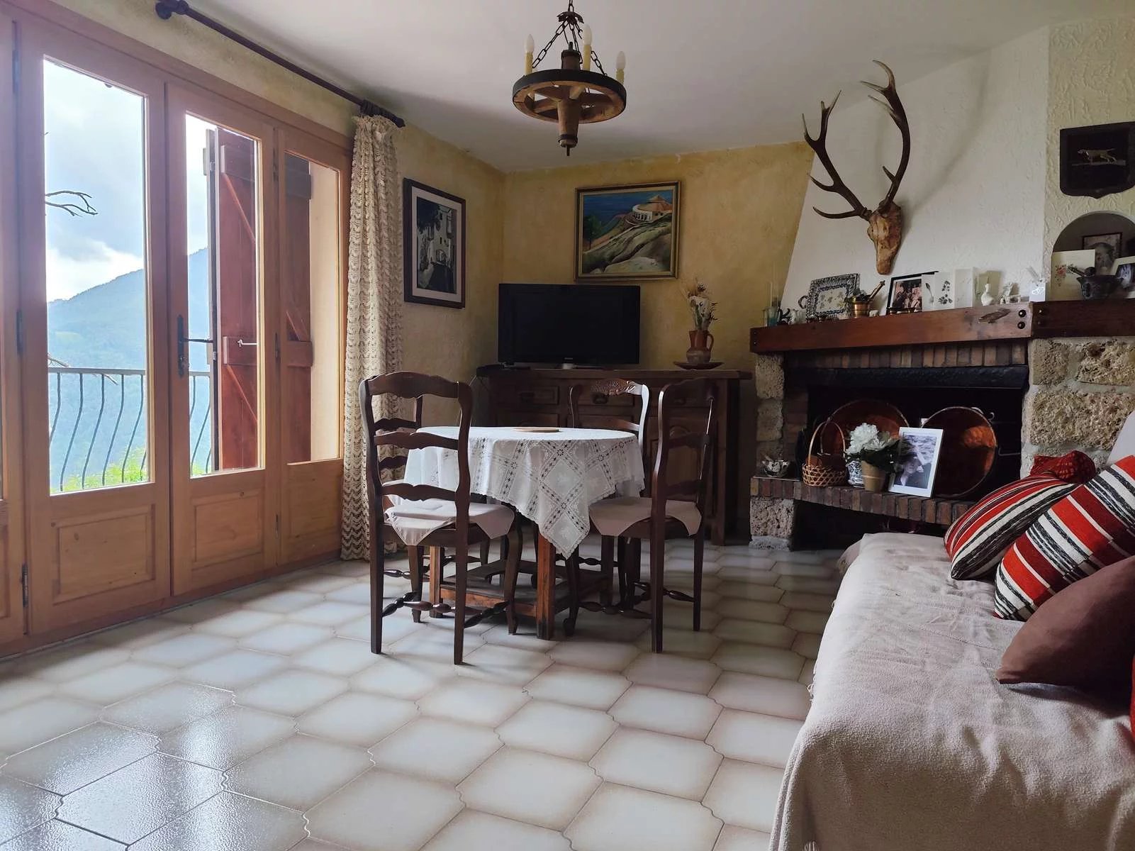 Vous découvrez au 1er étage : un trois pièces de 77 m² qui se compose, d'un hall d'entrée, cuisine aménagée équipée ouverte sur le séjour, terrasse, salon avec cheminée et balcon avec une vue dégagée sur la vallée, deux chambres, une salle de douche/wc, un wc séparé et l'accès intérieur pour se rendre au RDC.