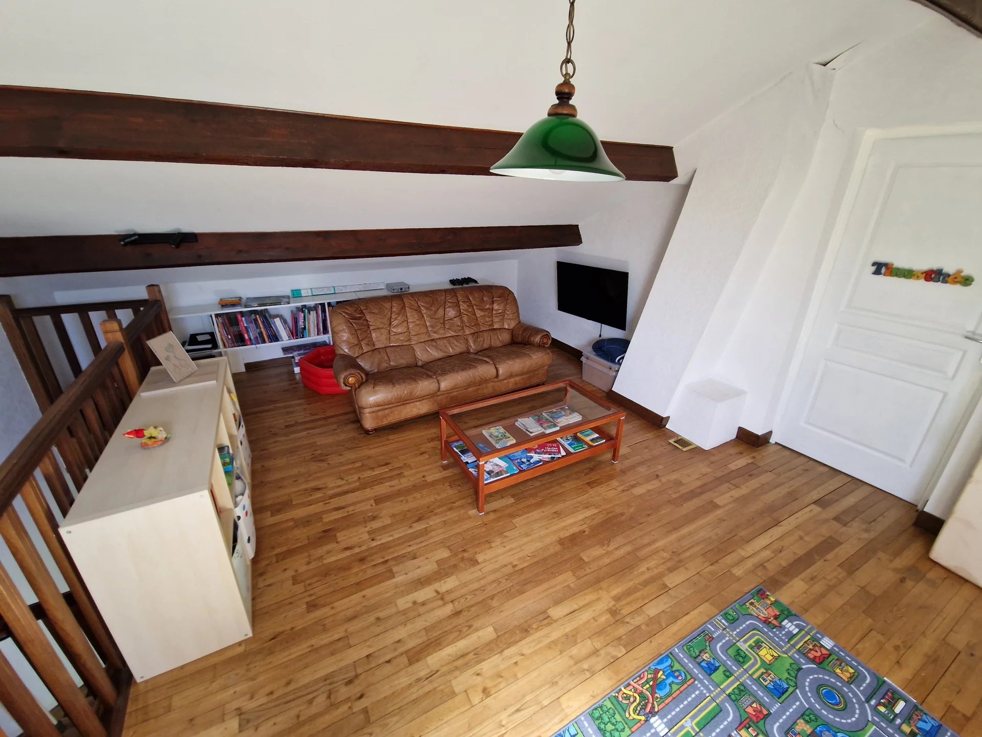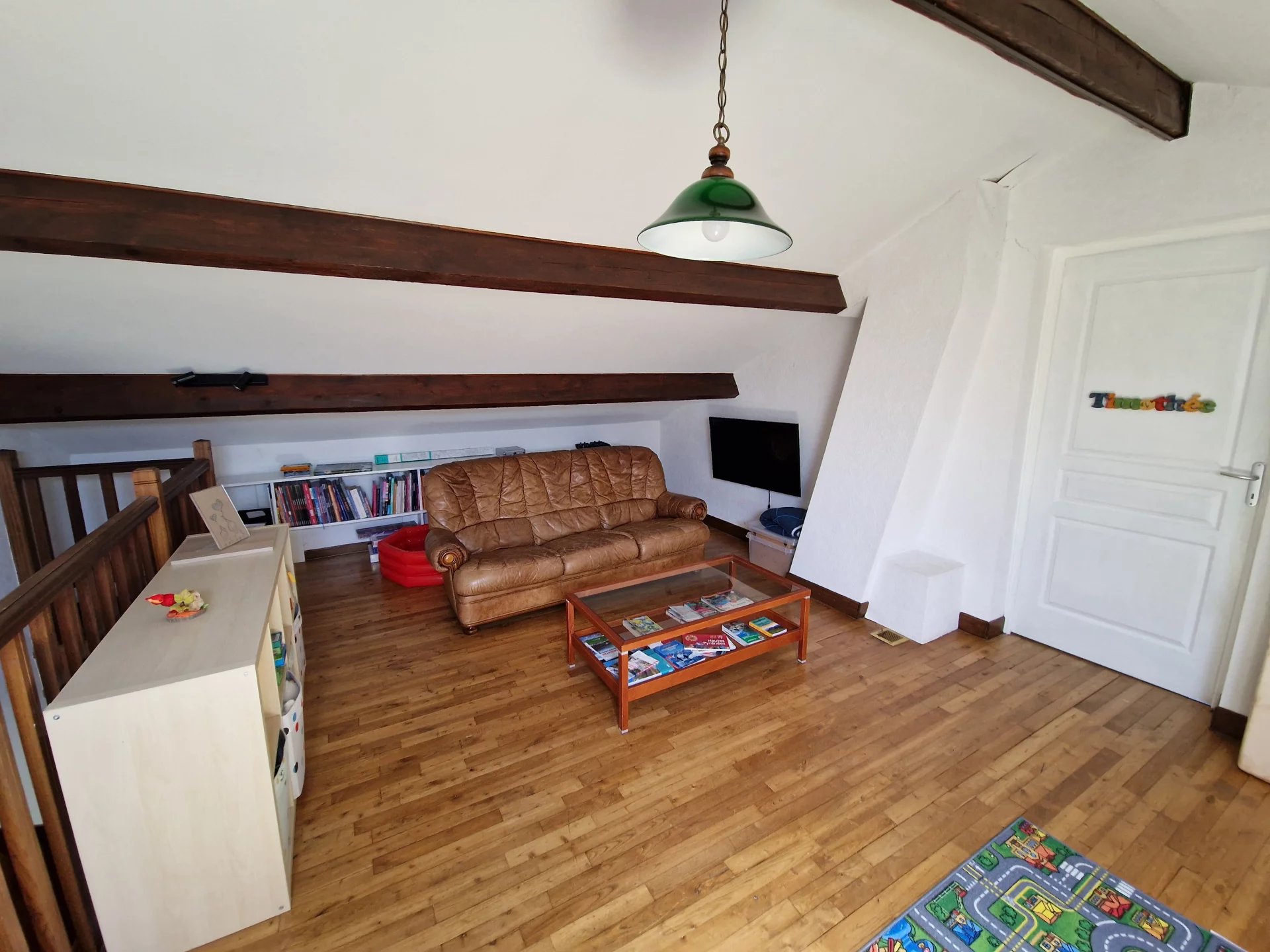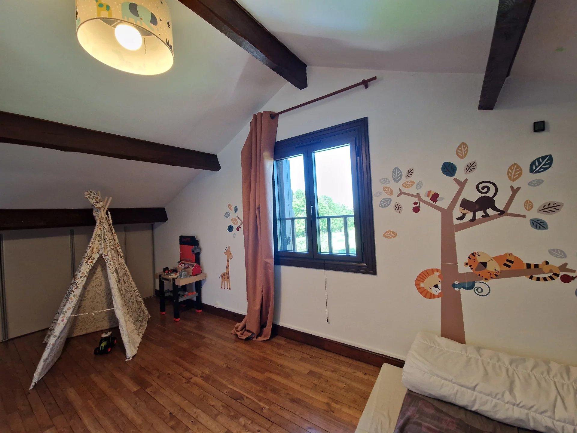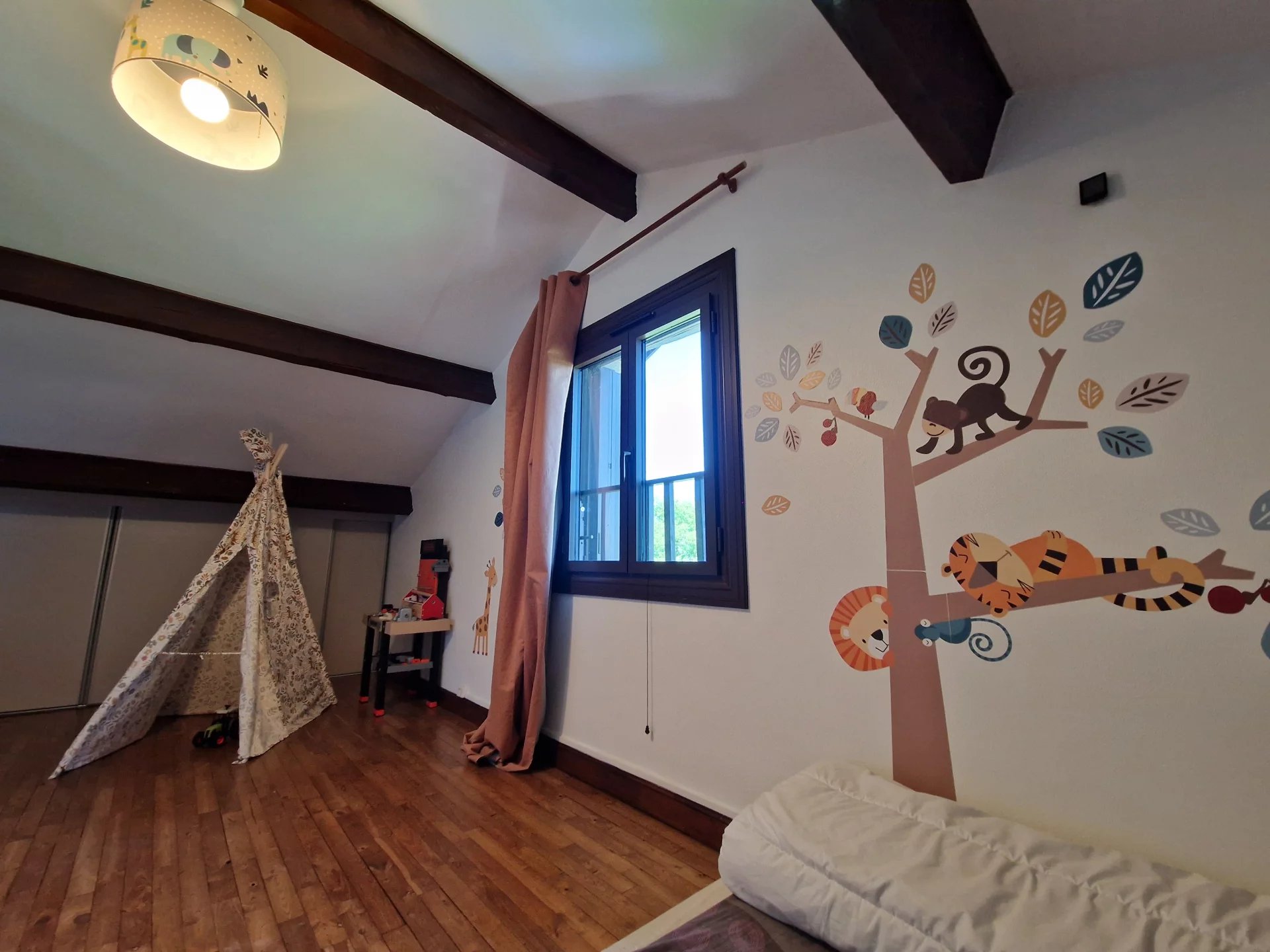 A l'étage palier mansardé de 29m² au sol, idéal pour créer un coin bibliothèque ou salle de jeux pour les enfants, 3 chambres, une salle d'eau et un wc indépendant. Garage attenant.