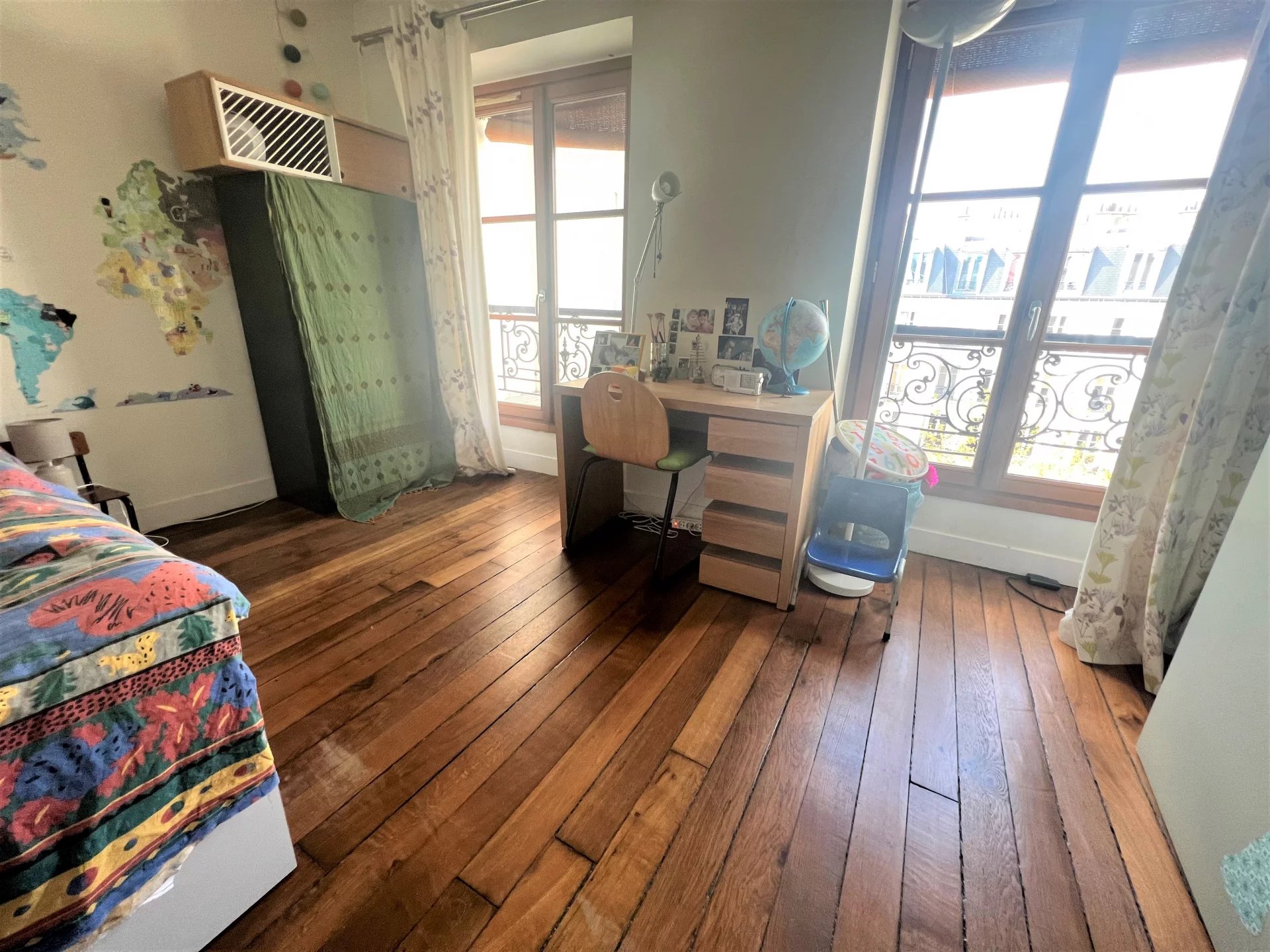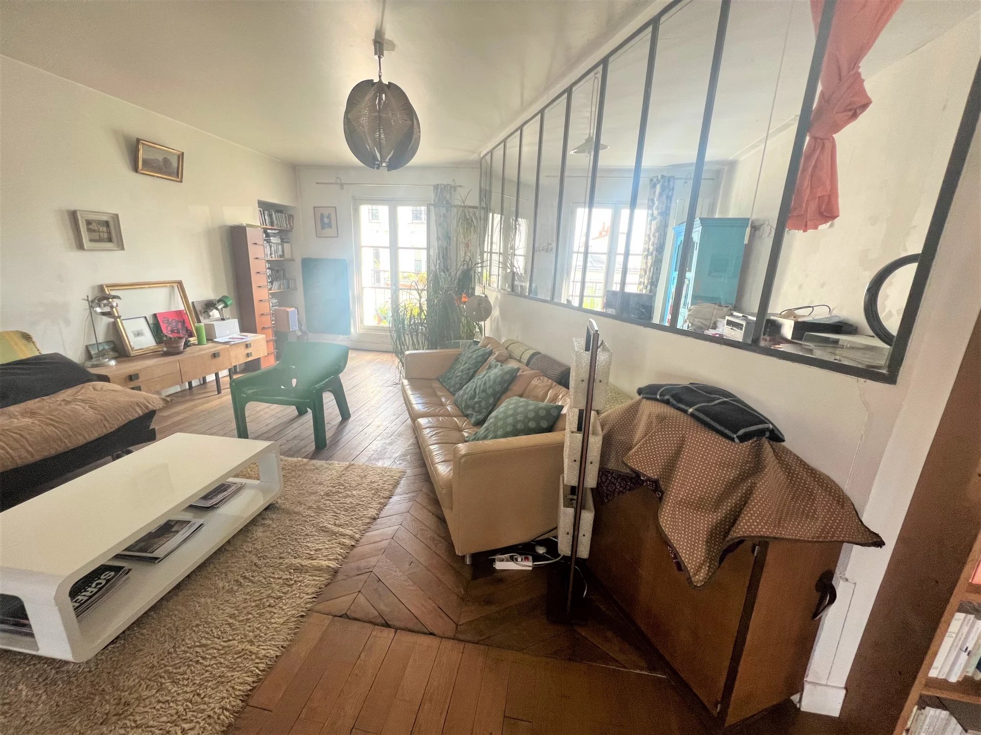 Entre Belleville et le parc des Buttes Chaumont, au 4eme étage sans ascenseur dans un immeuble ancien, un appartement traversant de 98m², exposé sud est et nord ouest, composé d'un grand séjour traversant avec cuisine ouverte, deux grandes chambres et une troisième derrière une jolie verrière, balcon filant, une grande salle de bains avec WC, une batterie de rangements intégrés et une grande cave de 18m². Bon état général. Isolation phonique dans les chambres. Charme de l'ancien.