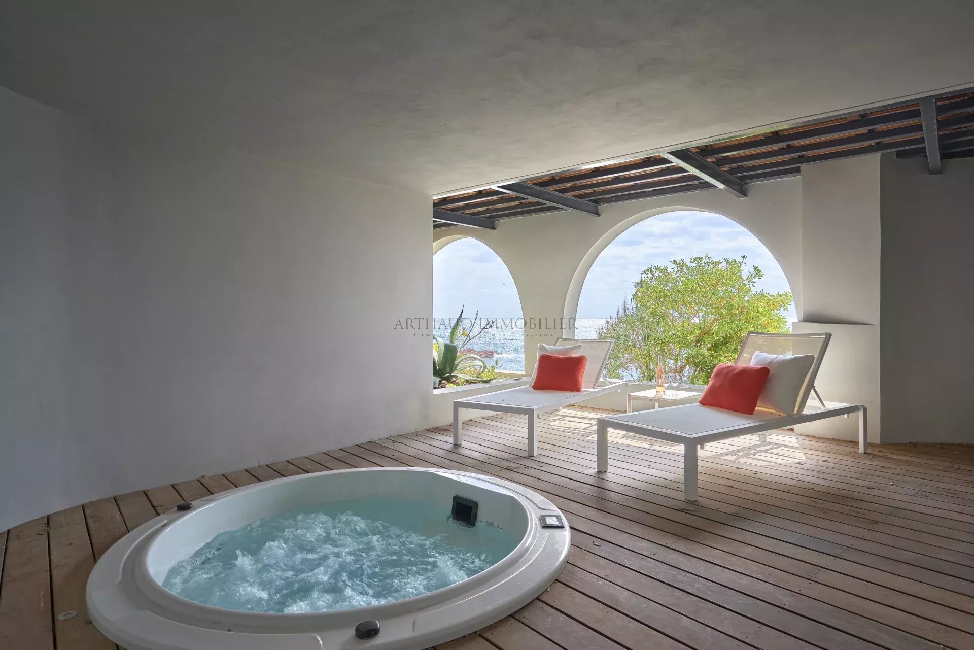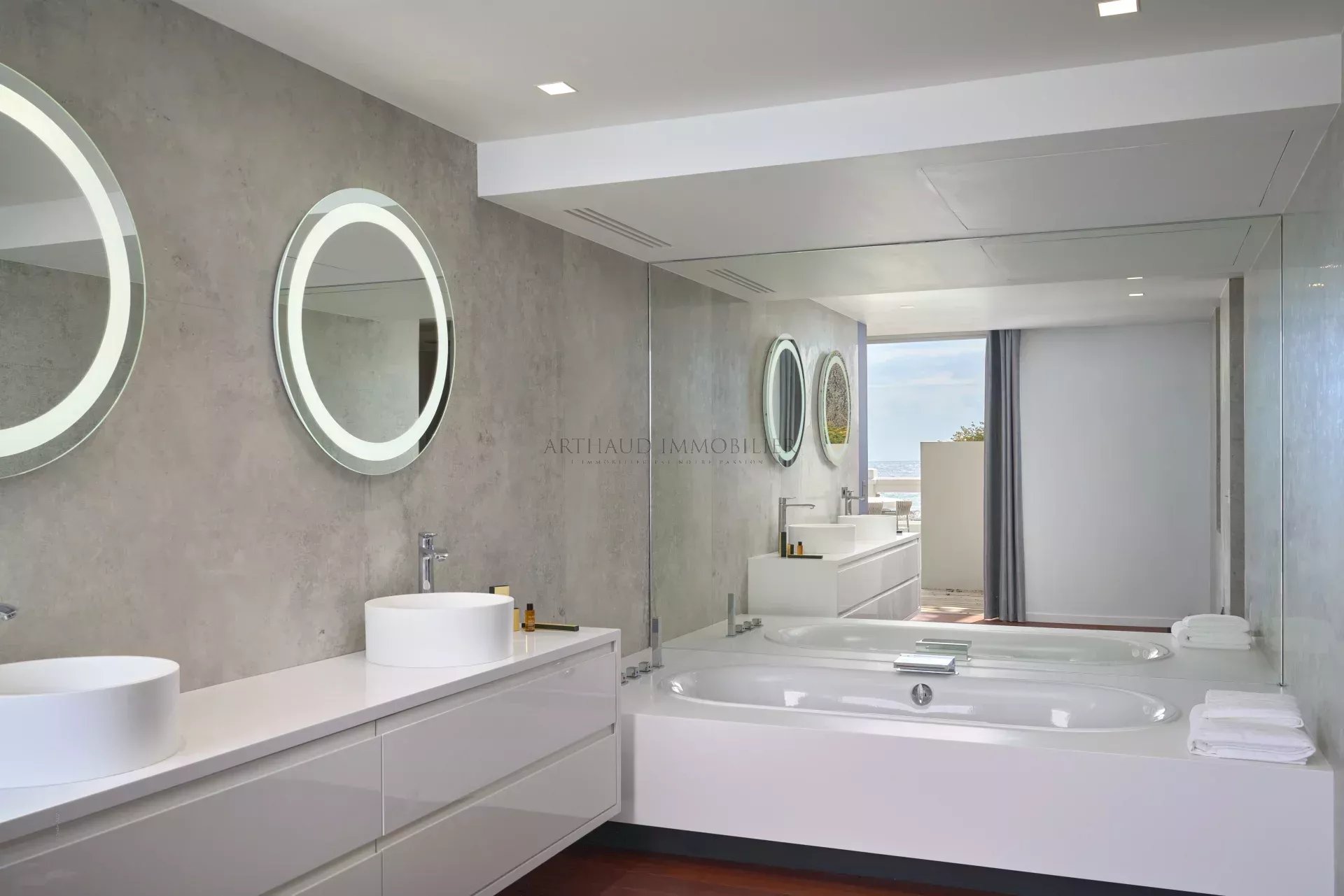 Cette propriété en première ligne se dresse sur un terrain superbement paysager, exposé Sud, avec piscine et accès directs à la mer.