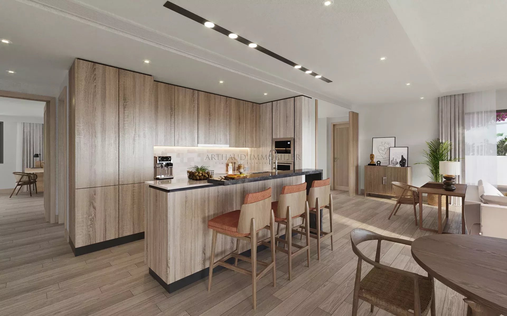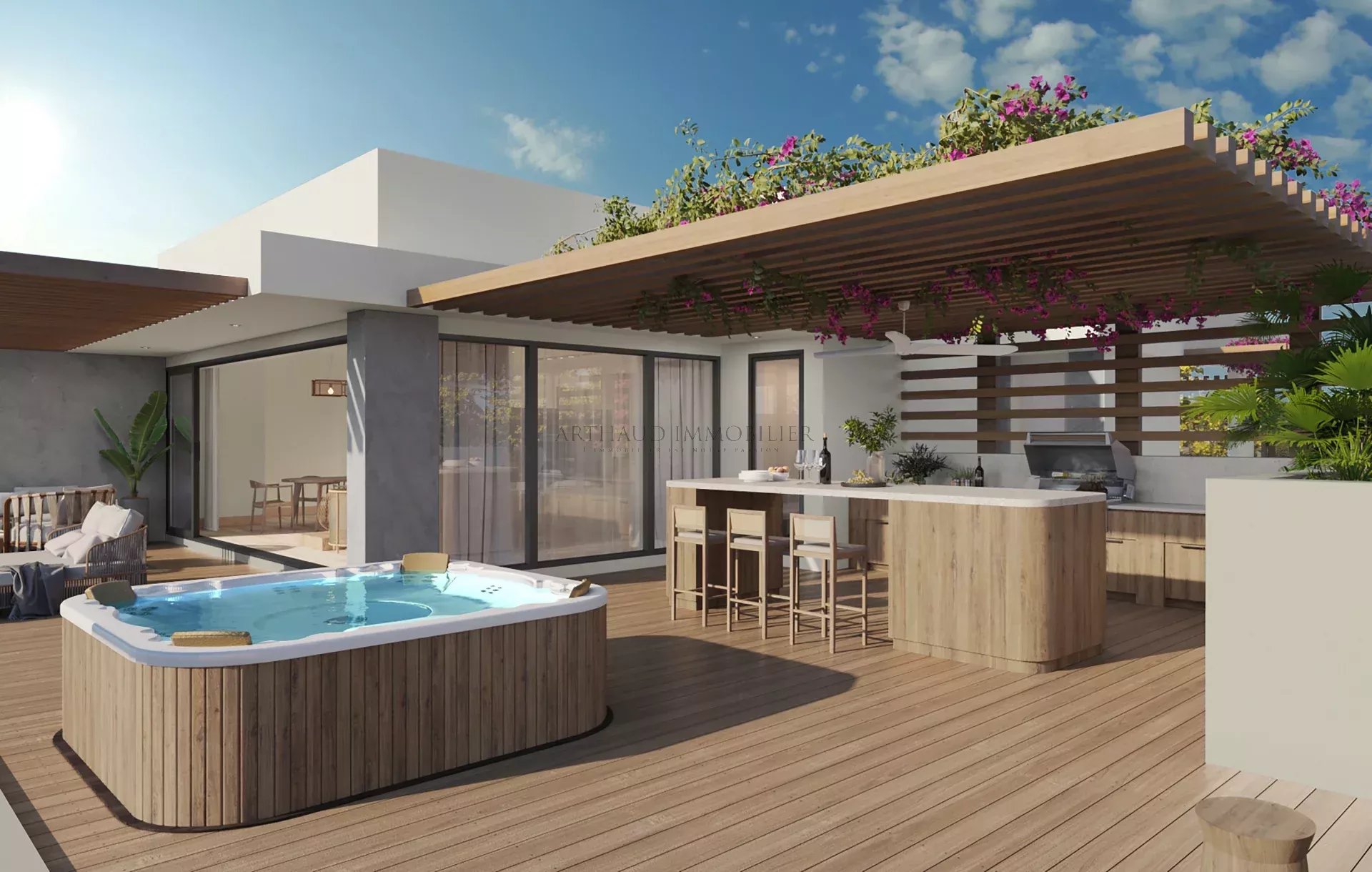 L'appartement vous offre une spacieuse pièce de vie avec cuisine équipée à la décoration soignée et s'ouvrant sur un terrasse de 121m2 (possibilité d'y installer un jacuzzi ou piscine privative).