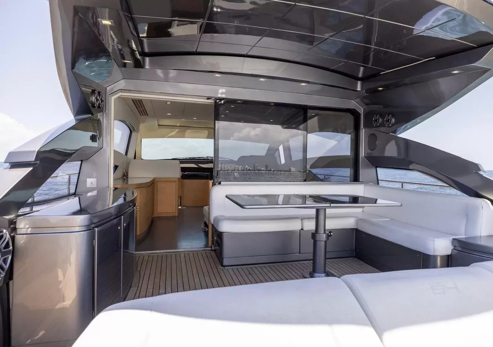 À l’extérieur, vous profitez d’un carré avec table pour 12 personnes, plancha, frigo et ice maker. Des bains de soleil sont aménagés à l’avant et à l’arrière. L’annexe et les équipements nautiques sont à disposition. Le système audio est diffusé à l’intérieur comme à l’extérieur.