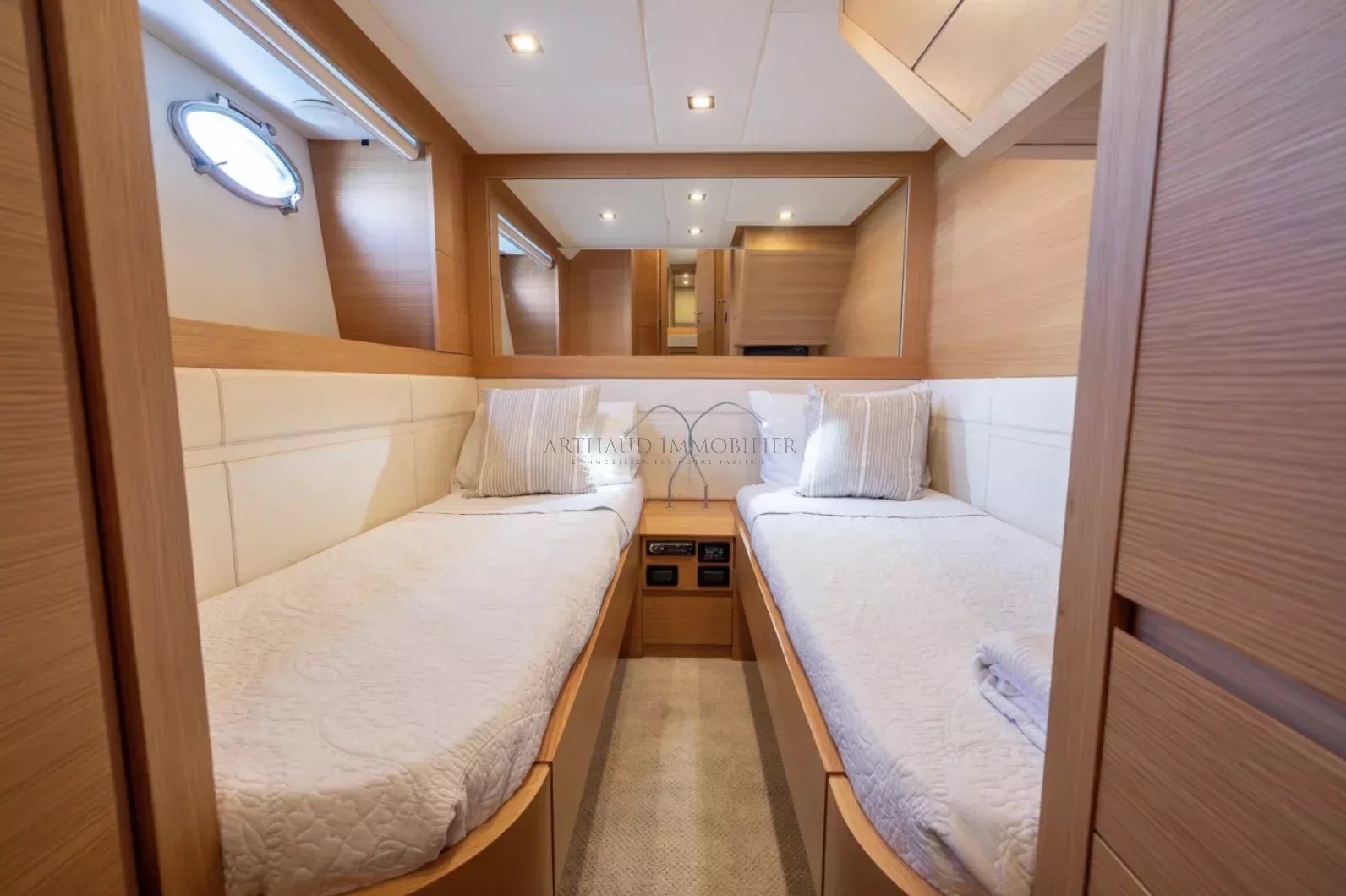 Il dispose de trois cabines (deux doubles et une twin), chacune avec sa propre salle d’eau. Le salon est lumineux, équipé d’une table à manger, d’un système audio, d’une télévision et de la climatisation. La cuisine comprend tout le nécessaire : réfrigérateur, plaques de cuisson, micro-ondes et lave-vaisselle. Une cabine séparée est réservée à l’équipage. La connexion Internet est assurée par le système Starlink.