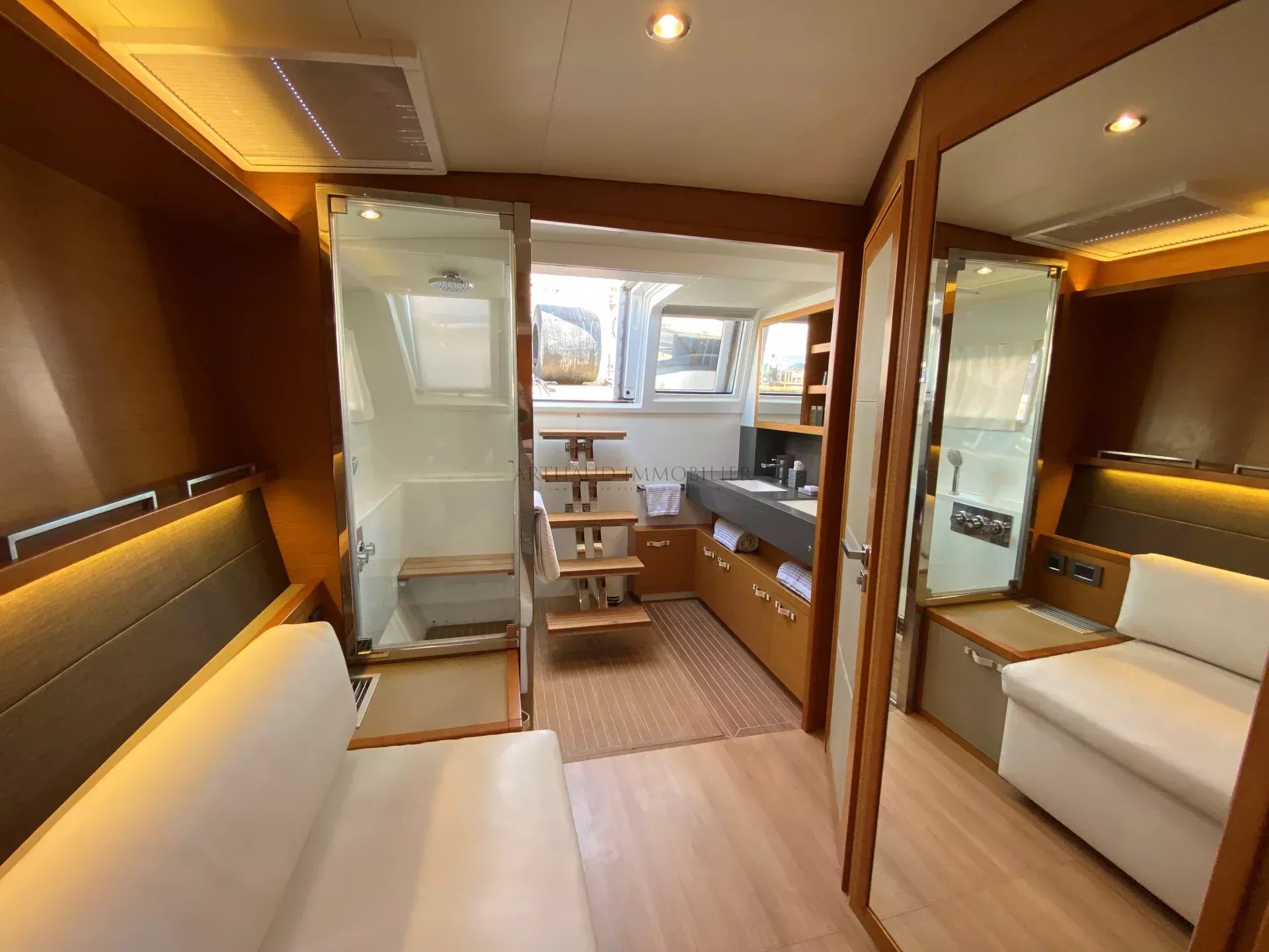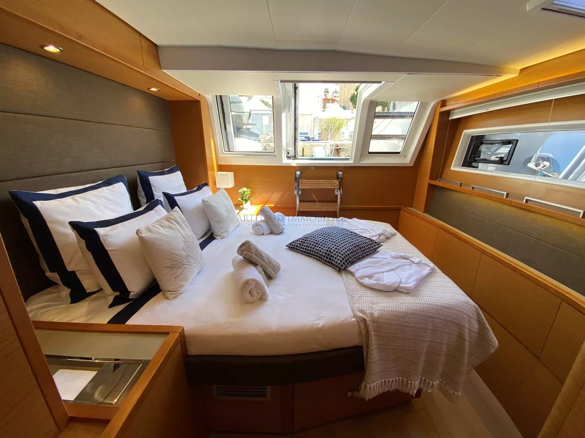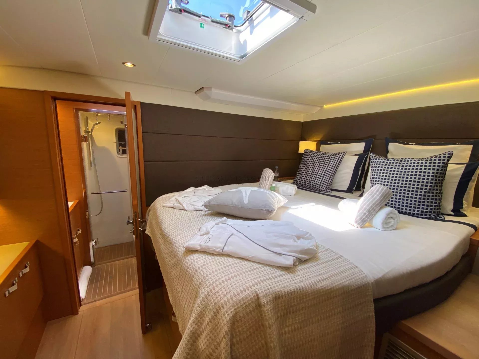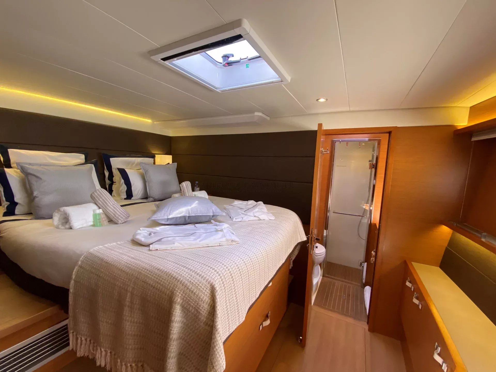Le yacht LA FREGATE dispose de 4 cabines doubles, chacune avec sa propre salle de bain privative, offrant à bord un confort optimal. Une grande cabine propriétaire bénéficie d’un accès direct au pont, pour plus d’intimité et de praticité.