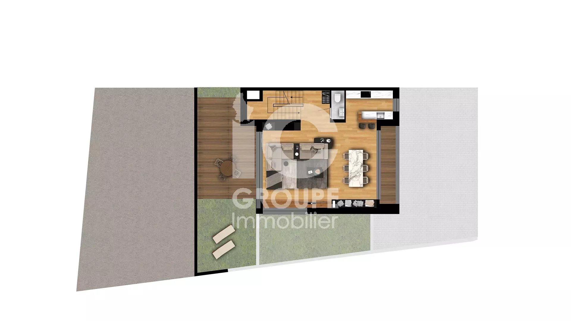 Une terrasse au deuxième et au troisième étage, un ascenseur privatif (supplément), un grand jardin de trois niveau à l'arrière de la maison complètent le tout.