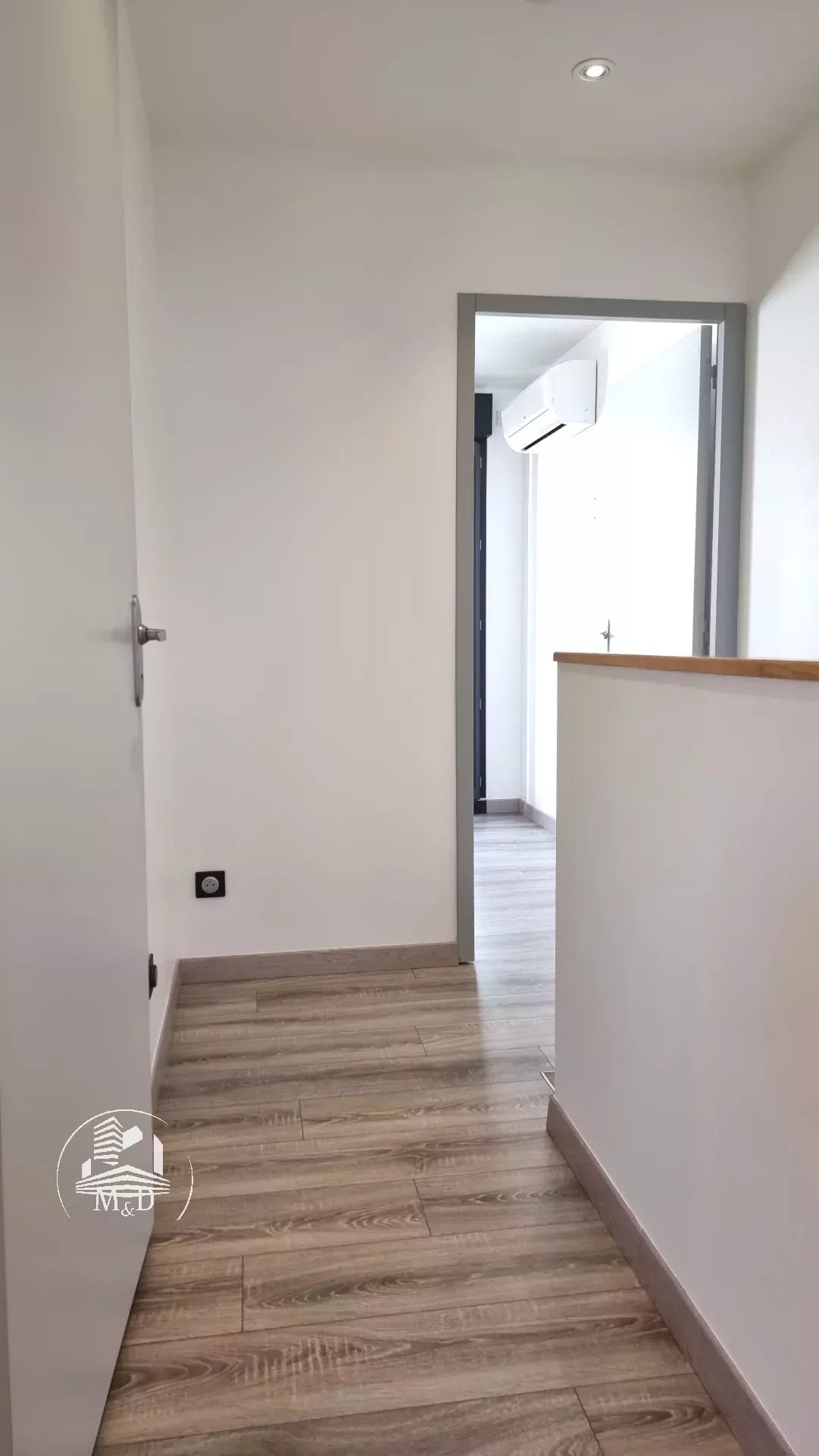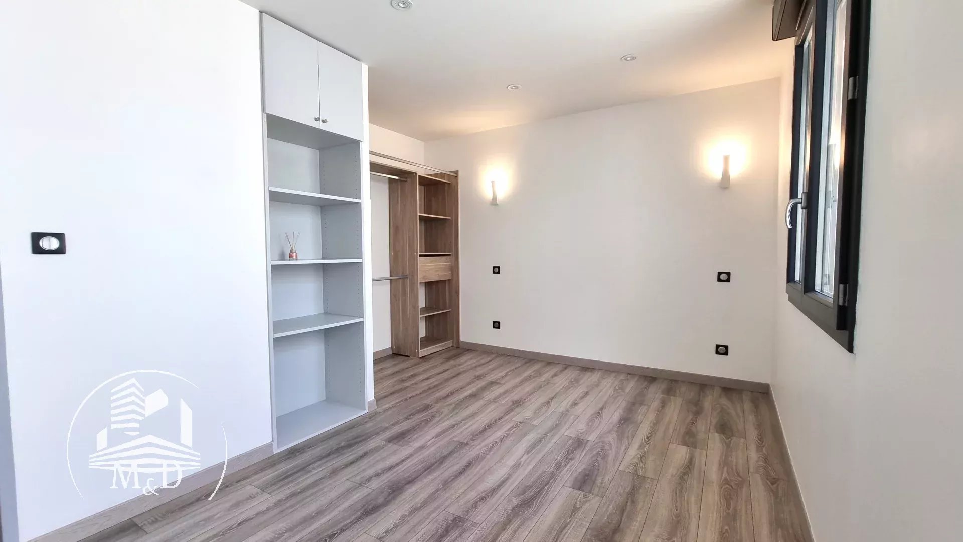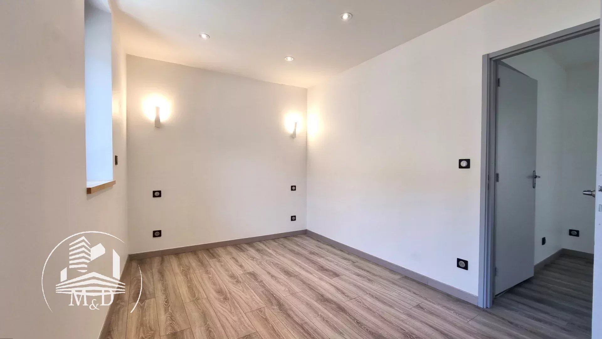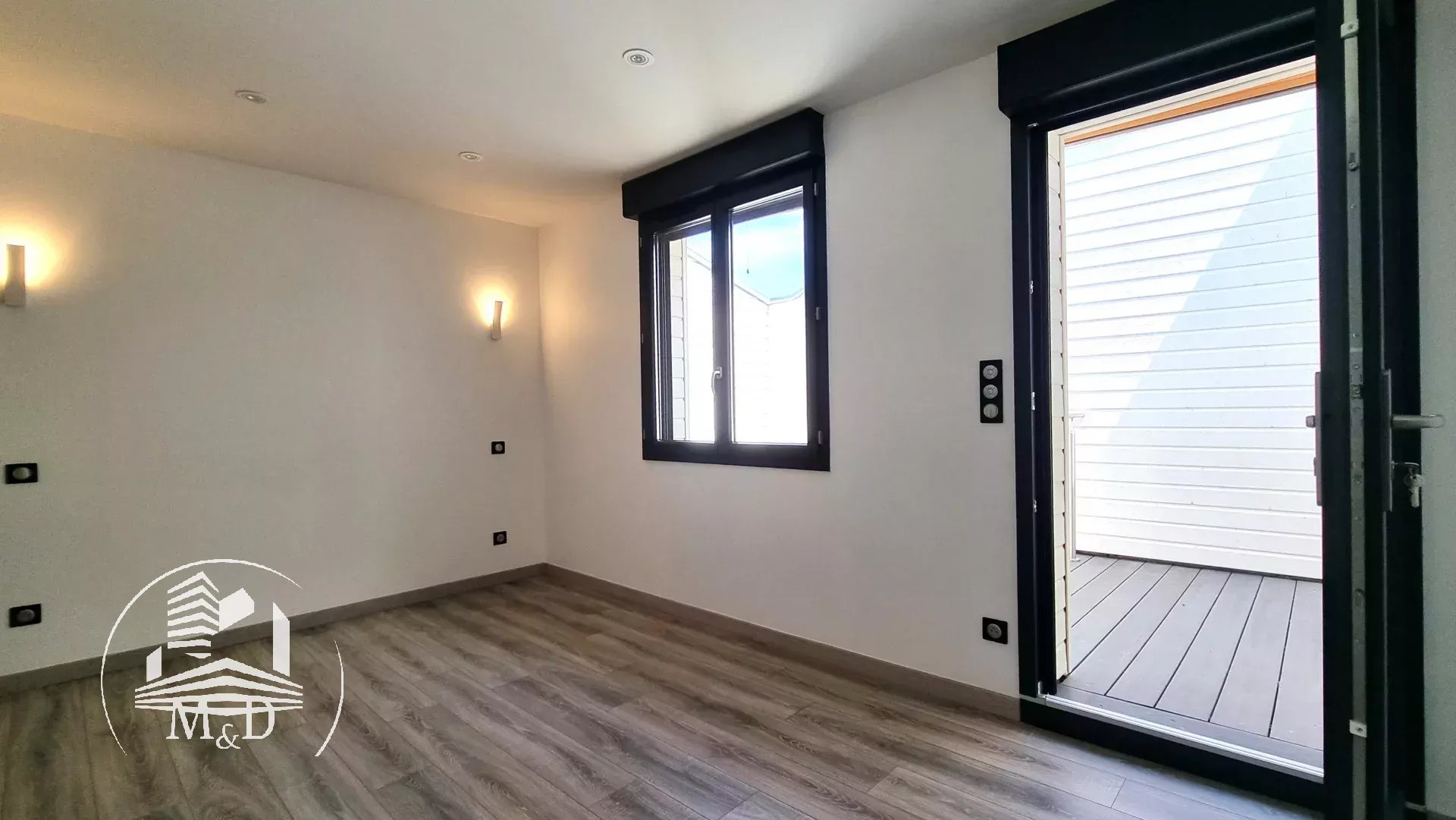 À l'étage, un palier dessert deux belles chambres, chacune dotée d'un placard aménagé, et l'une d'entre elles offre un petit balcon donnant sur la terrasse extérieure. Une élégante salle d'eau avec une belle douche à l'italienne, un meuble vasque et des toilettes suspendus complètent ce niveau.