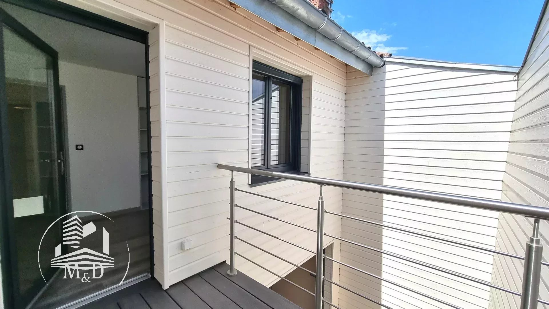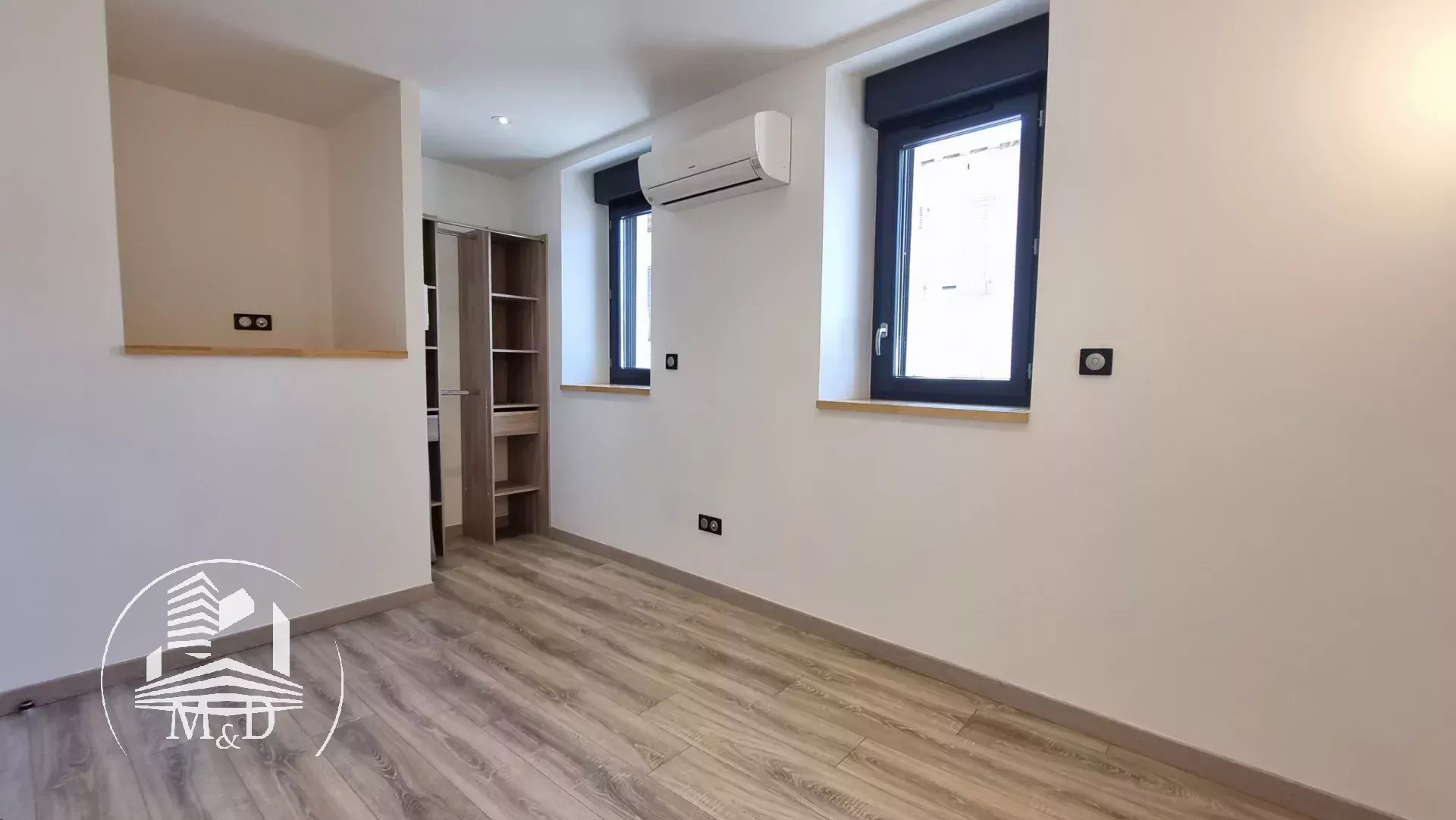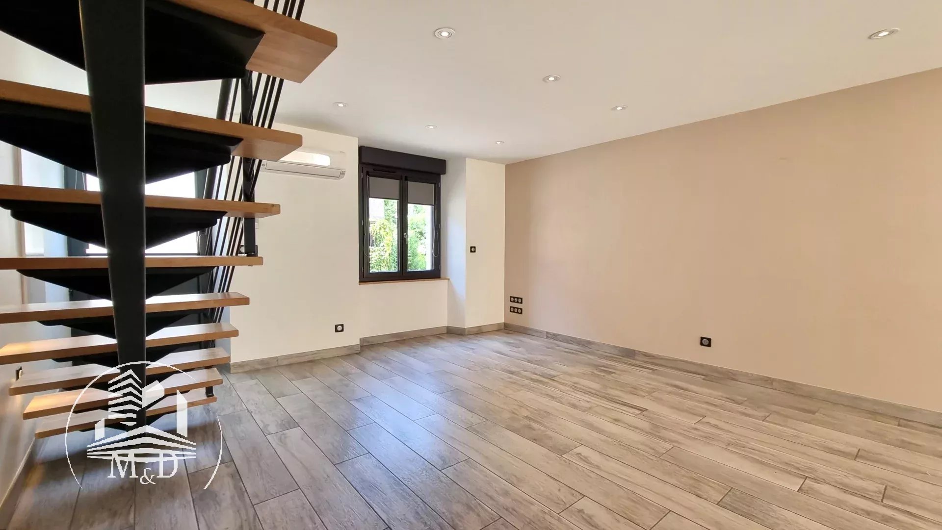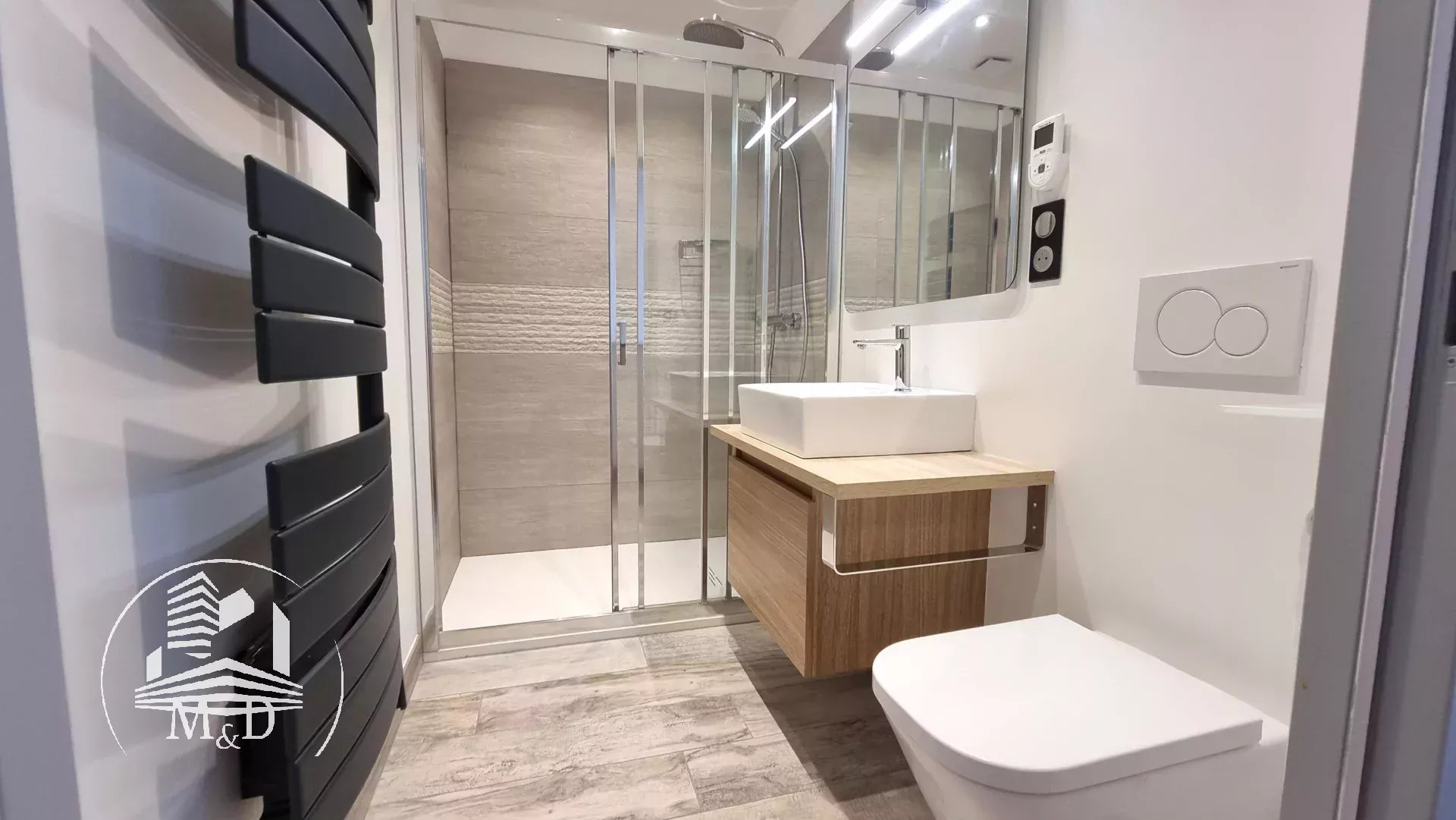 À l'étage, un palier dessert deux belles chambres, chacune dotée d'un placard aménagé, et l'une d'entre elles offre un petit balcon donnant sur la terrasse extérieure. Une élégante salle d'eau avec une belle douche à l'italienne, un meuble vasque et des toilettes suspendus complètent ce niveau.