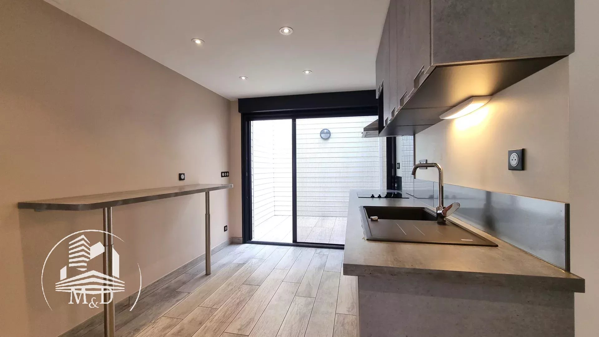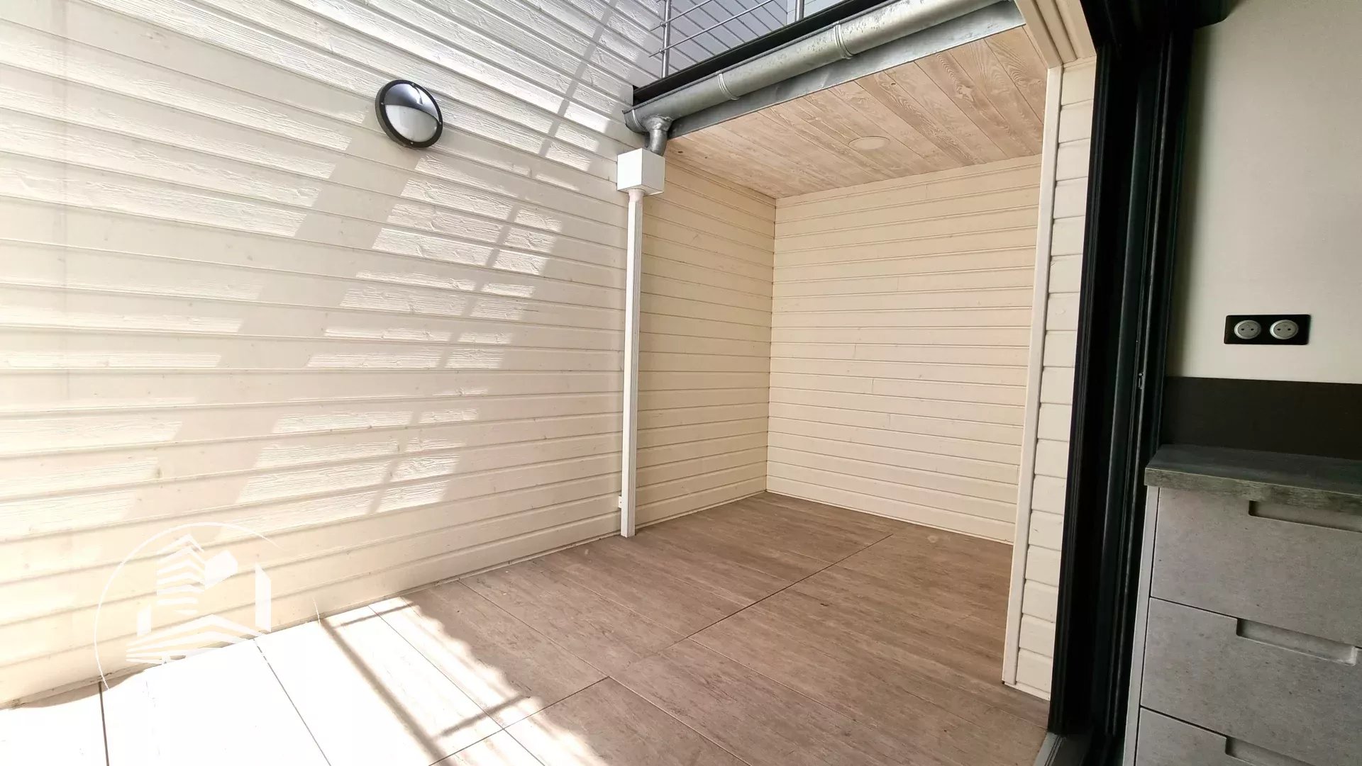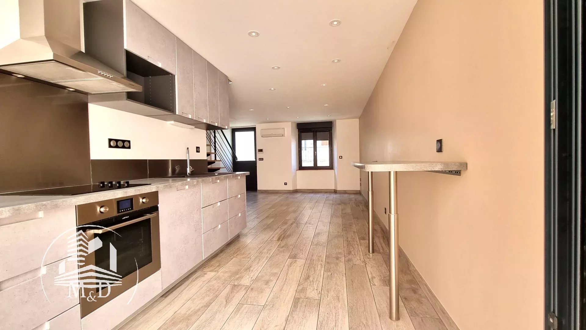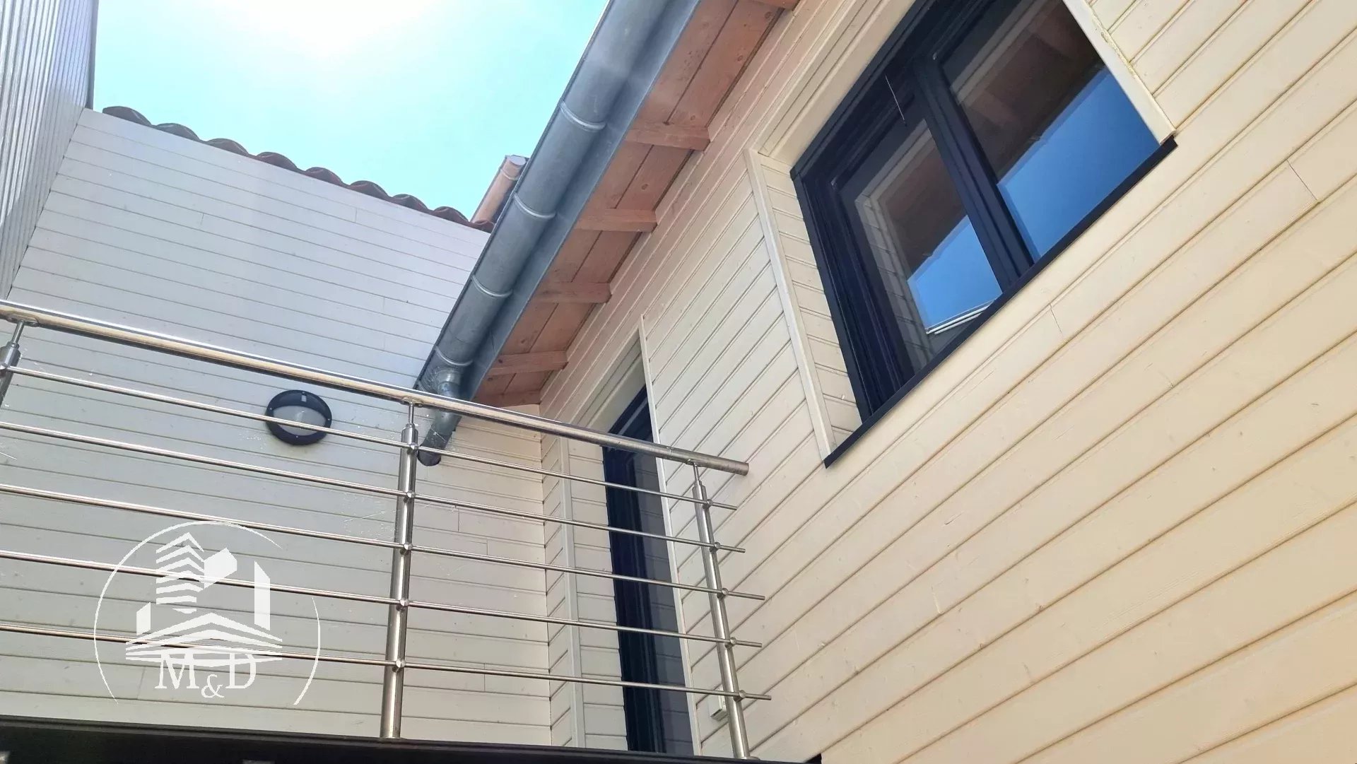 À l'étage, un palier dessert deux belles chambres, chacune dotée d'un placard aménagé, et l'une d'entre elles offre un petit balcon donnant sur la terrasse extérieure. Une élégante salle d'eau avec une belle douche à l'italienne, un meuble vasque et des toilettes suspendus complètent ce niveau.