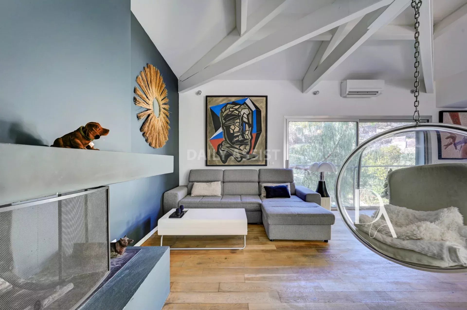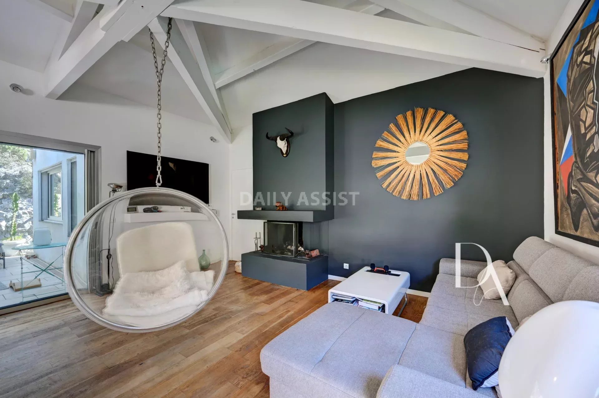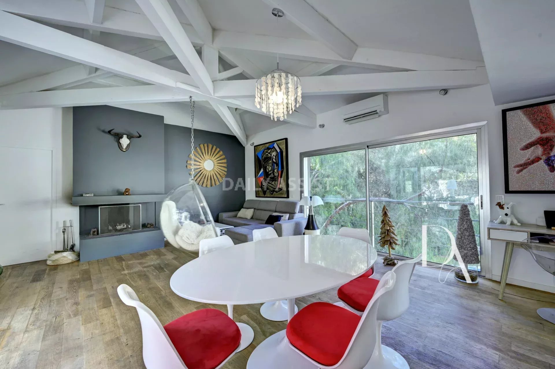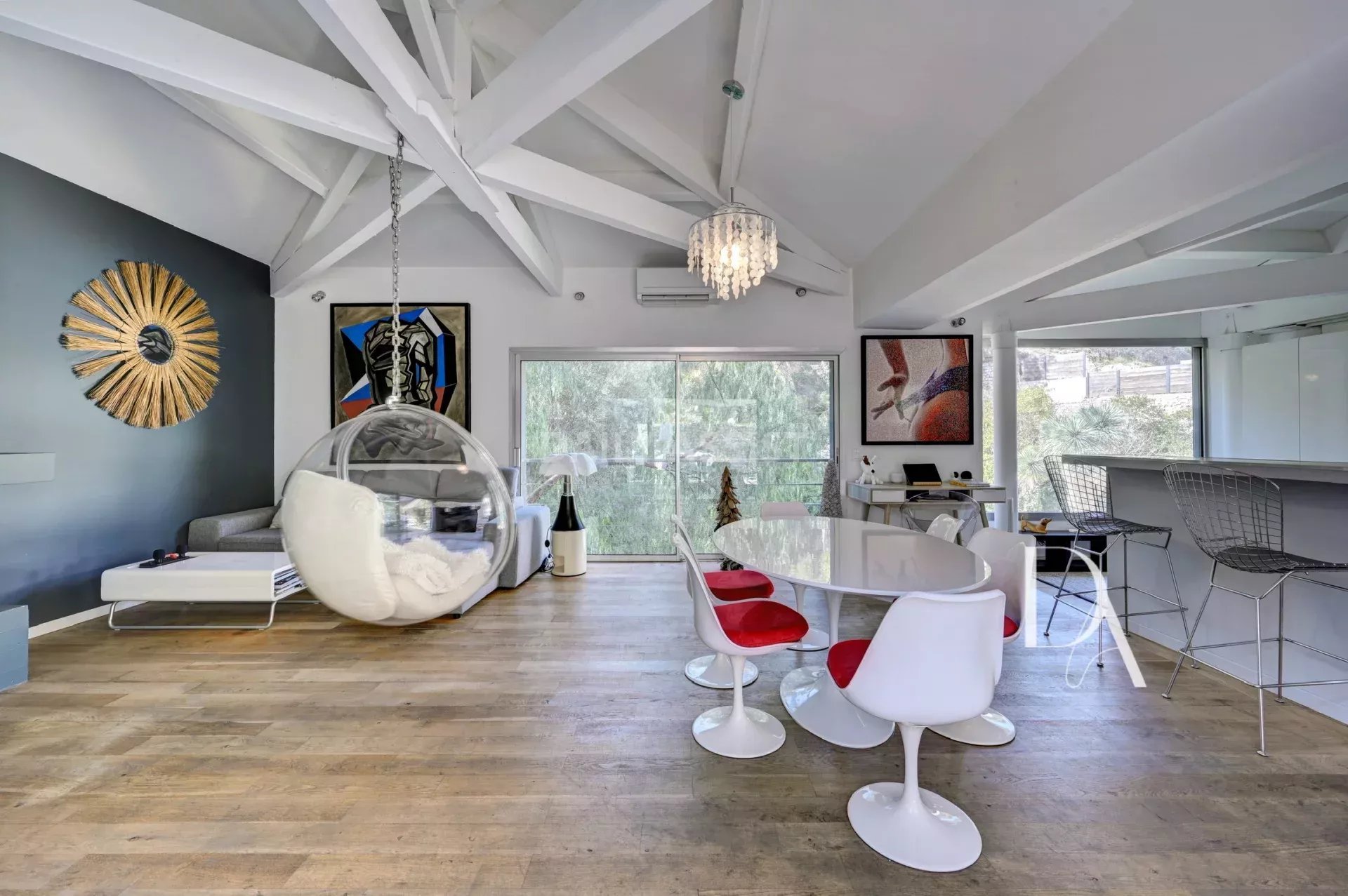 Vous serez charmés par la charpente apparente et le plafond cathédrale de l'espace séjour.