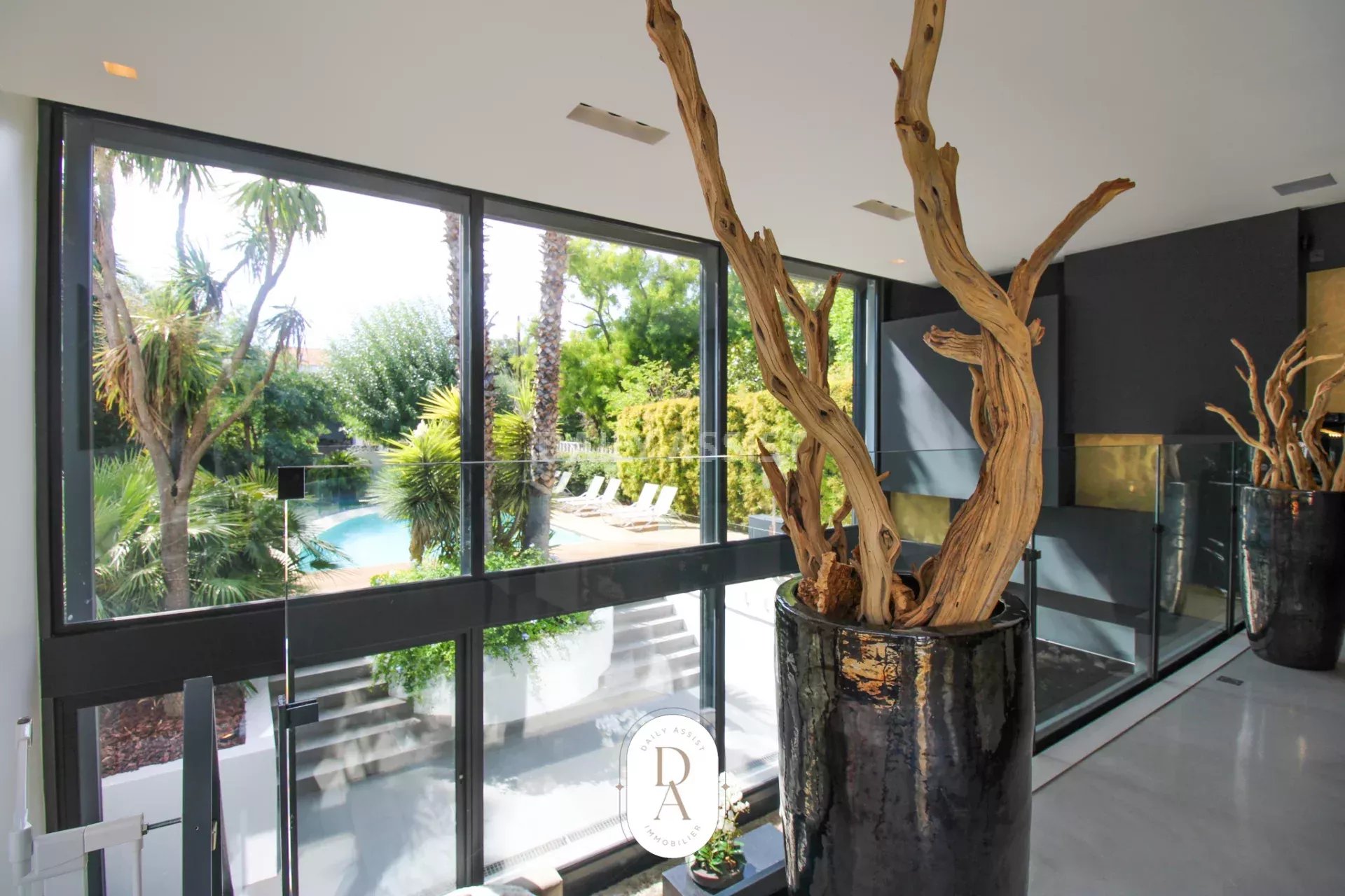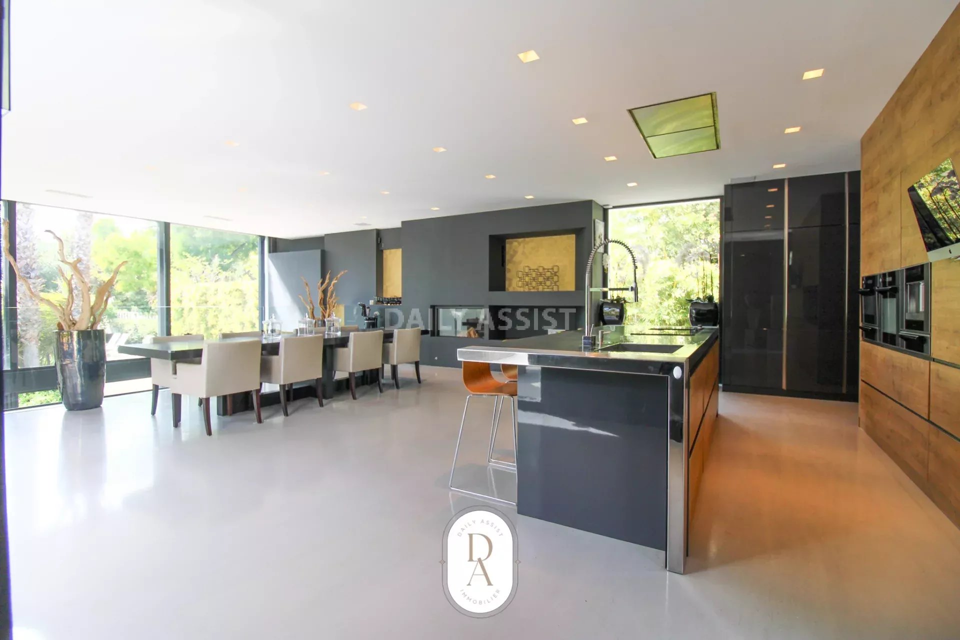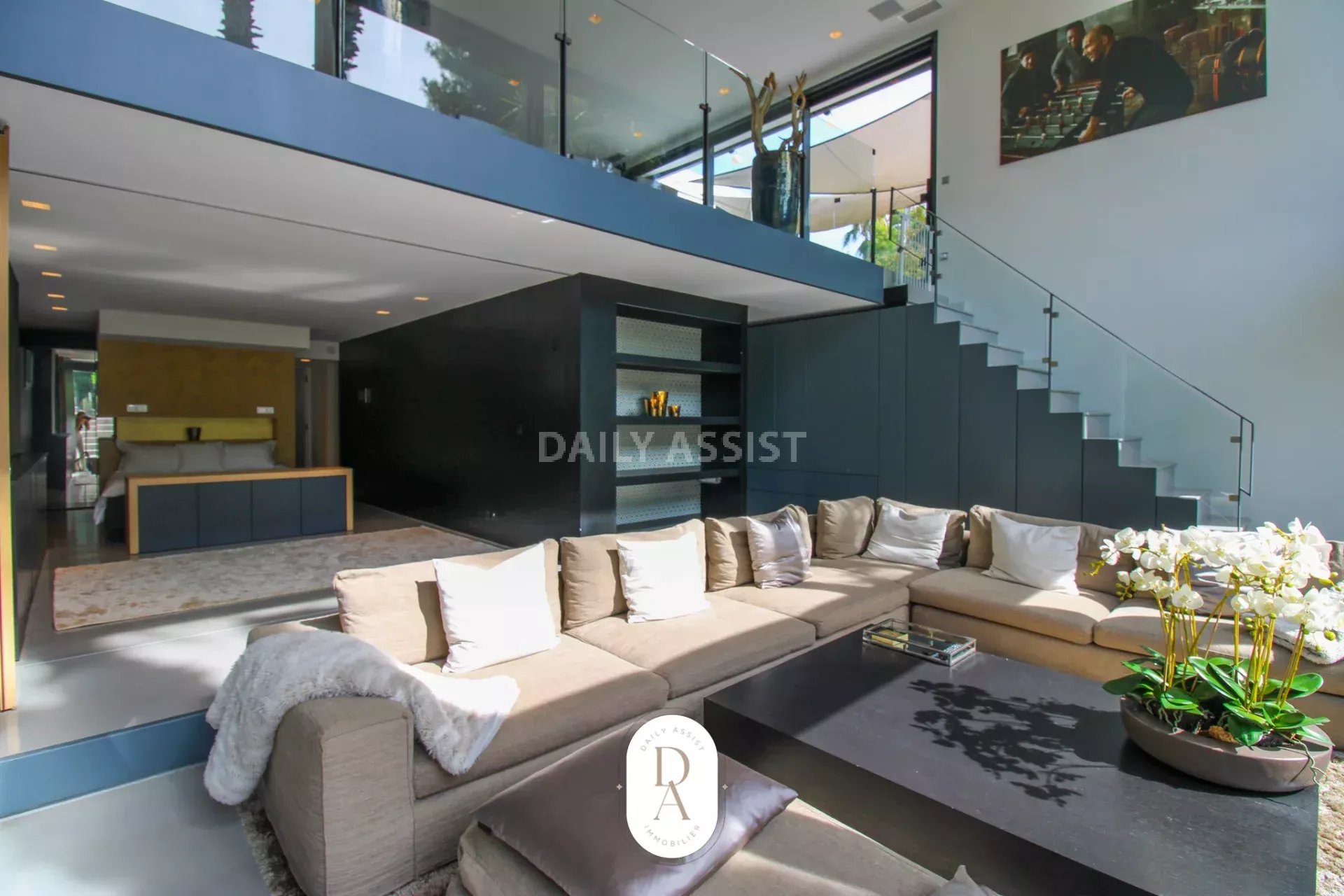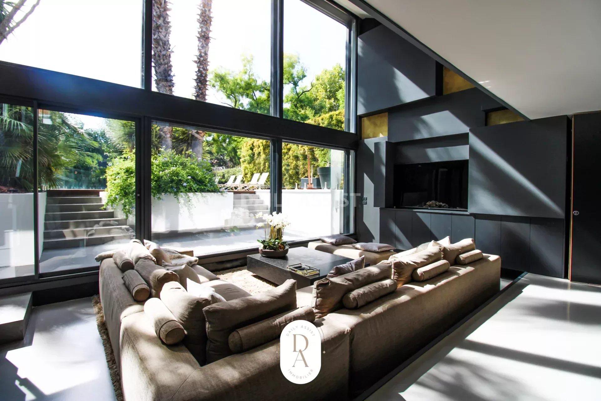 EXCLUSIVITE. LA CALIFORNIENNE est une villa contemporaine dans une copropriété sécurisée très recherchée du 8ème arrondissement, Le Parc Marveyre. Située au bout d'une allée, vous serez charmés dès l'entrée dans le joli jardin arboré par son calme et sa sérénité. Une grande pièce de vie de 58m2 très lumineuse grâce à ses immenses baies vitrées. L'une d'elle s'ouvre sur une belle terrasse ombragée. L'autre, de la hauteur de la maison, donne sur le jardin et la piscine. Une très belle cuisine avec îlot central est aménagée de très nombreux rangements qui vous conduisent sur l'arrière-cuisine et la buanderie. Un bel escalier vous amène en bas sur un salon et une master room (séparée du salon par une porte accordéon isolée phoniquement) son grand dressing et sa salle de bain et une chambre d'amis/bureau. La baie vitrée vous amène sur le jardin, la piscine et une salle de sport de 20m2. Le dernier étage abrite deux chambres de 16m2 qui bénéficient d'un grand solarium, et une belle salle de bain avec baignoire et douche, ainsi que d'un espace lecture/bureau. Le terrain de 1436m2 est un havre de paix. Entièrement engazonné, il est complanté de beaux arbres et d'immenses palmiers. Enfin, une jolie piscine sécurisée par des panneaux de verre et sa plage de bois vous invitera au farniente. Toute la CALIFORNIENNE est domotisée, et vous offrira toute la sécurité et le confort dont vous rêvez.