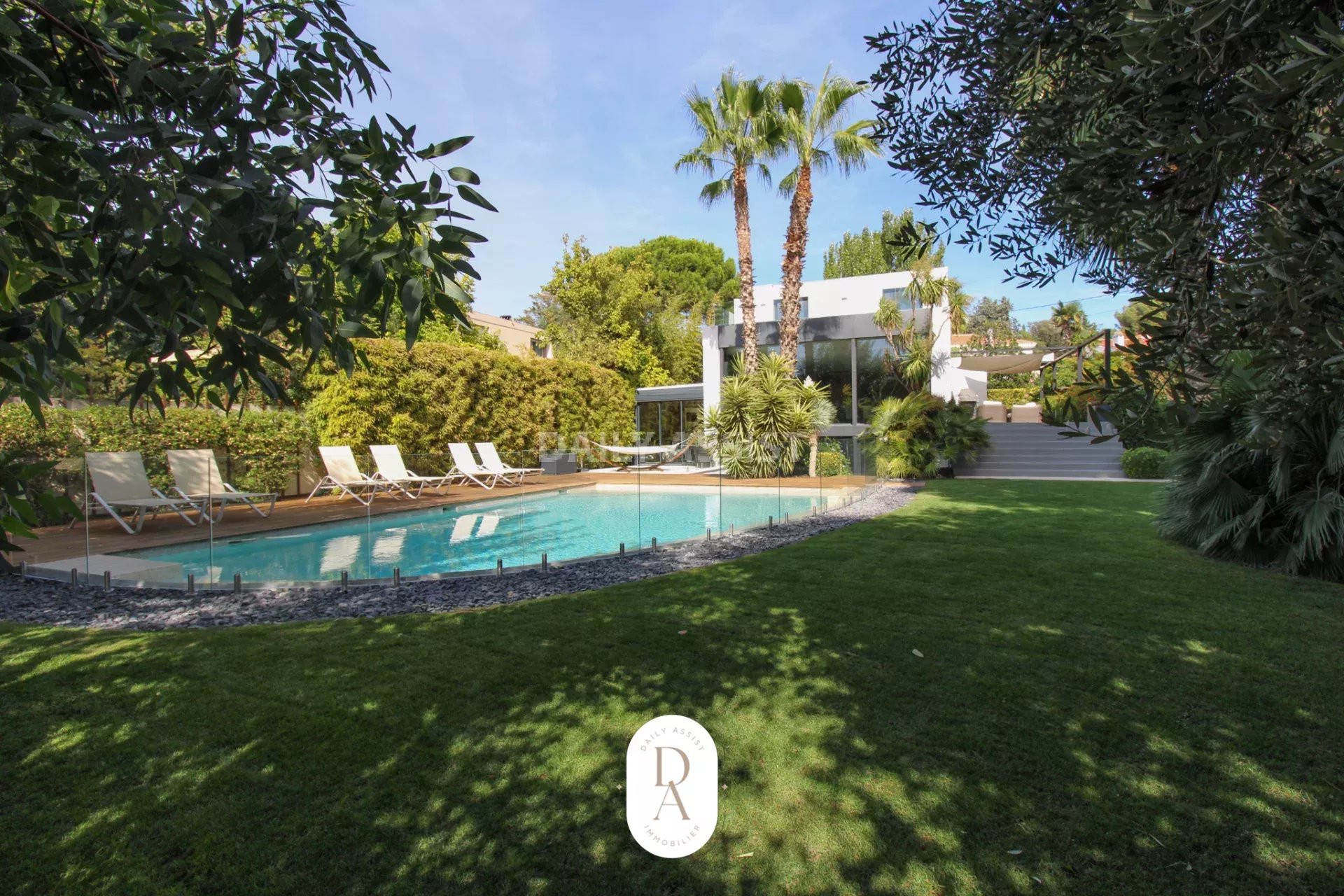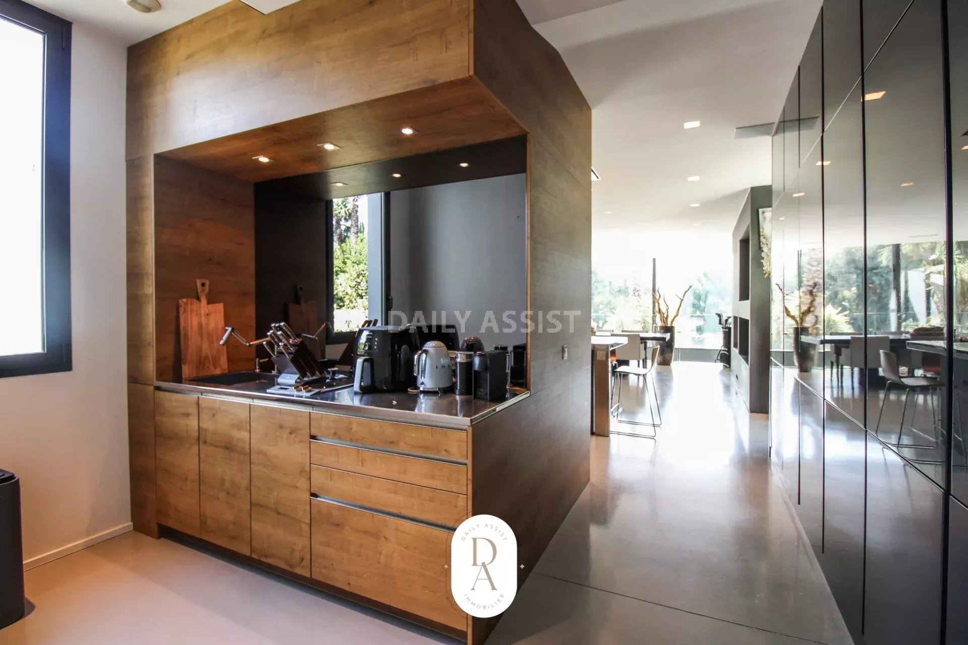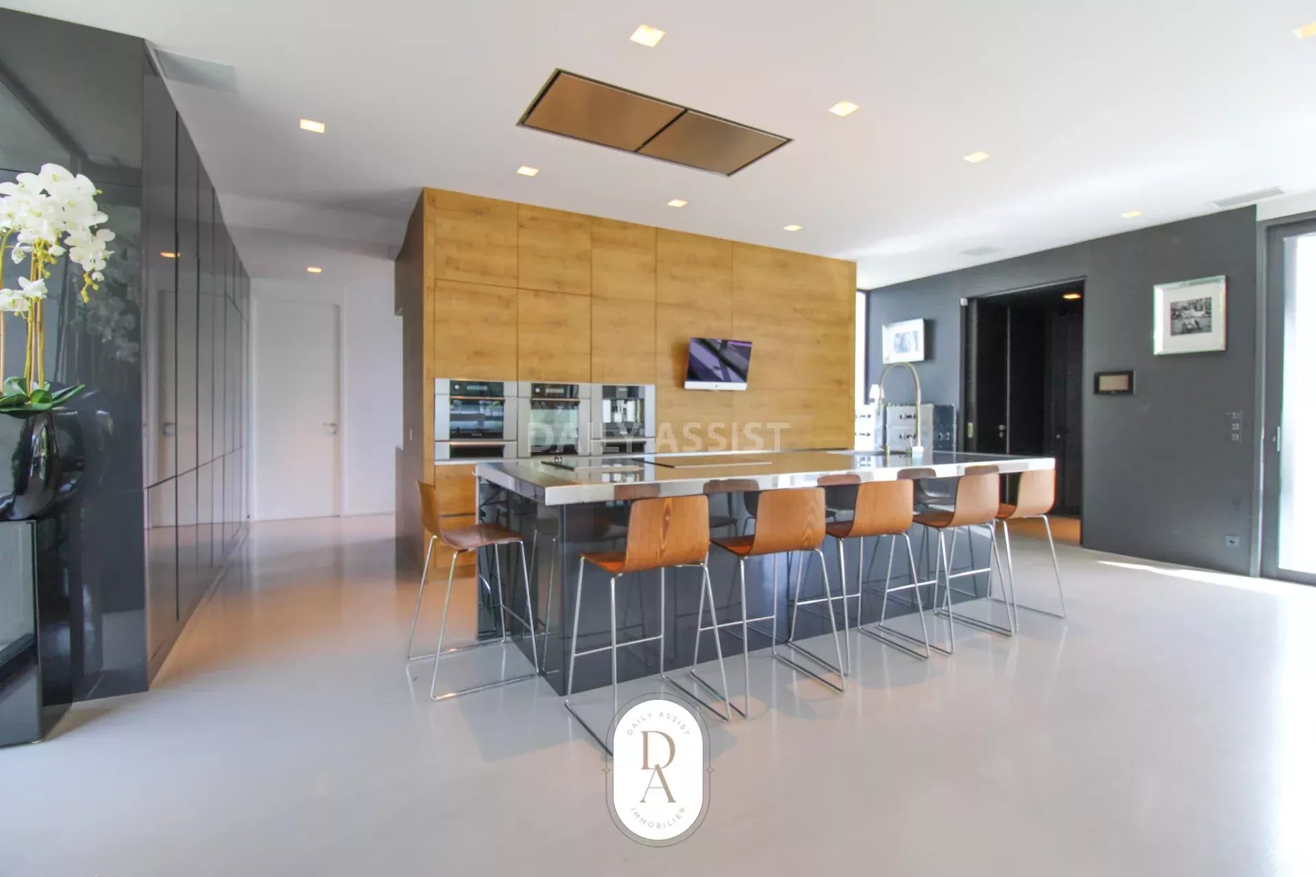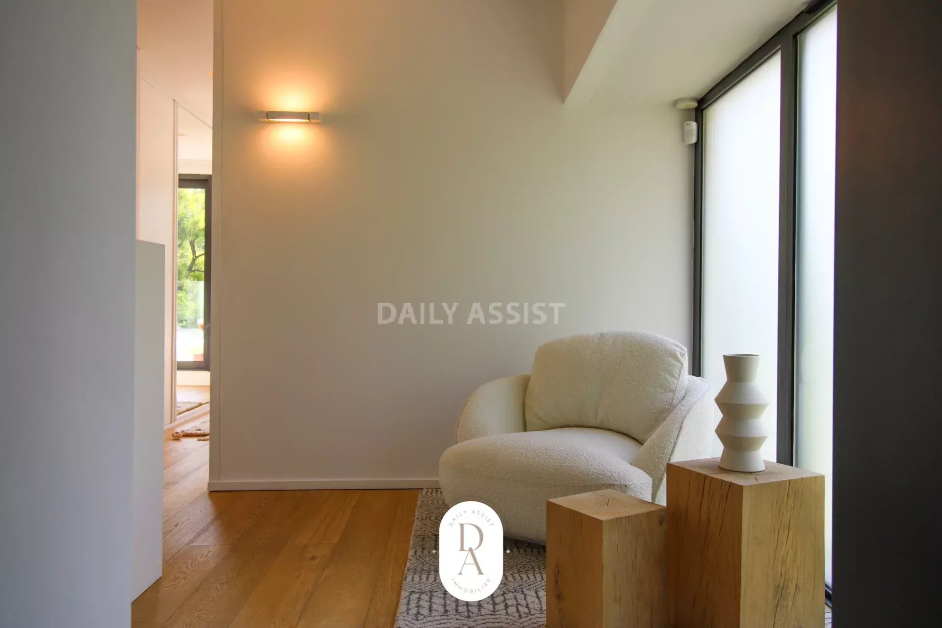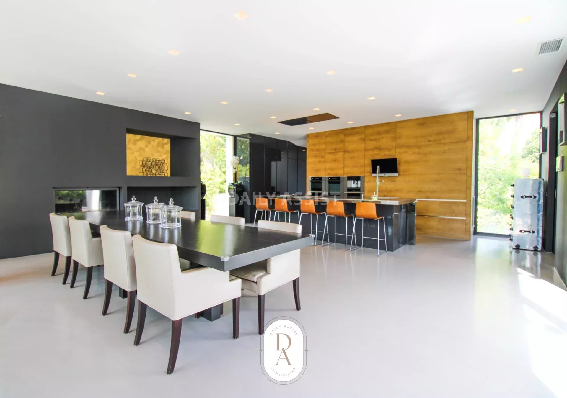 EXCLUSIVITE. LA CALIFORNIENNE est une villa contemporaine dans une copropriété sécurisée très recherchée du 8ème arrondissement, Le Parc Marveyre. Située au bout d'une allée, vous serez charmés dès l'entrée dans le joli jardin arboré par son calme et sa sérénité. Une grande pièce de vie de 58m2 très lumineuse grâce à ses immenses baies vitrées. L'une d'elle s'ouvre sur une belle terrasse ombragée. L'autre, de la hauteur de la maison, donne sur le jardin et la piscine. Une très belle cuisine avec îlot central est aménagée de très nombreux rangements qui vous conduisent sur l'arrière-cuisine et la buanderie. Un bel escalier vous amène en bas sur un salon et une master room (séparée du salon par une porte accordéon isolée phoniquement) son grand dressing et sa salle de bain et une chambre d'amis/bureau. La baie vitrée vous amène sur le jardin, la piscine et une salle de sport de 20m2. Le dernier étage abrite deux chambres de 16m2 qui bénéficient d'un grand solarium, et une belle salle de bain avec baignoire et douche, ainsi que d'un espace lecture/bureau. Le terrain de 1436m2 est un havre de paix. Entièrement engazonné, il est complanté de beaux arbres et d'immenses palmiers. Enfin, une jolie piscine sécurisée par des panneaux de verre et sa plage de bois vous invitera au farniente. Toute la CALIFORNIENNE est domotisée, et vous offrira toute la sécurité et le confort dont vous rêvez.