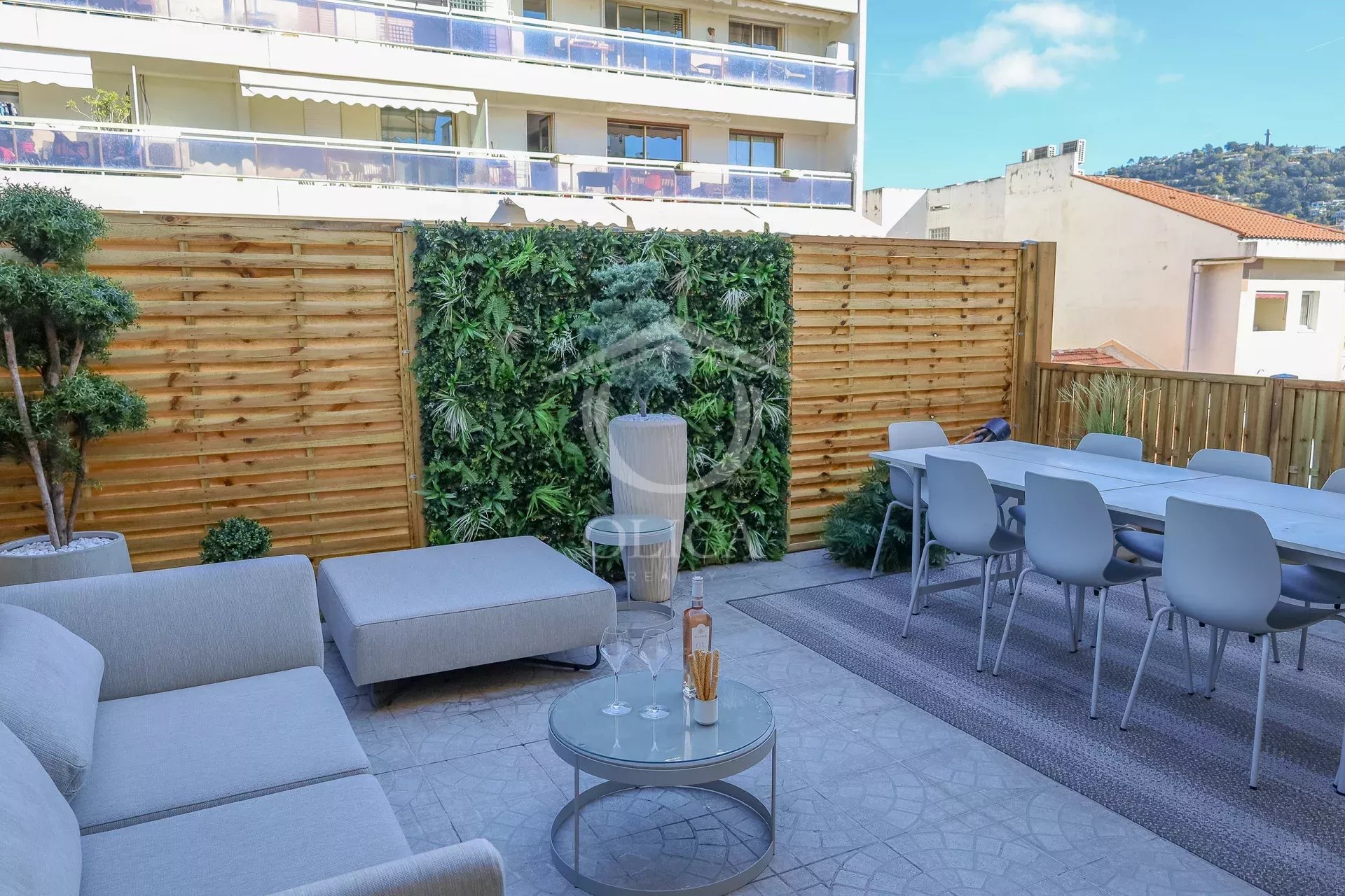 L’appartement dispose d’une magnifique terrasse avec salon d’été et table pour manger au soleil.