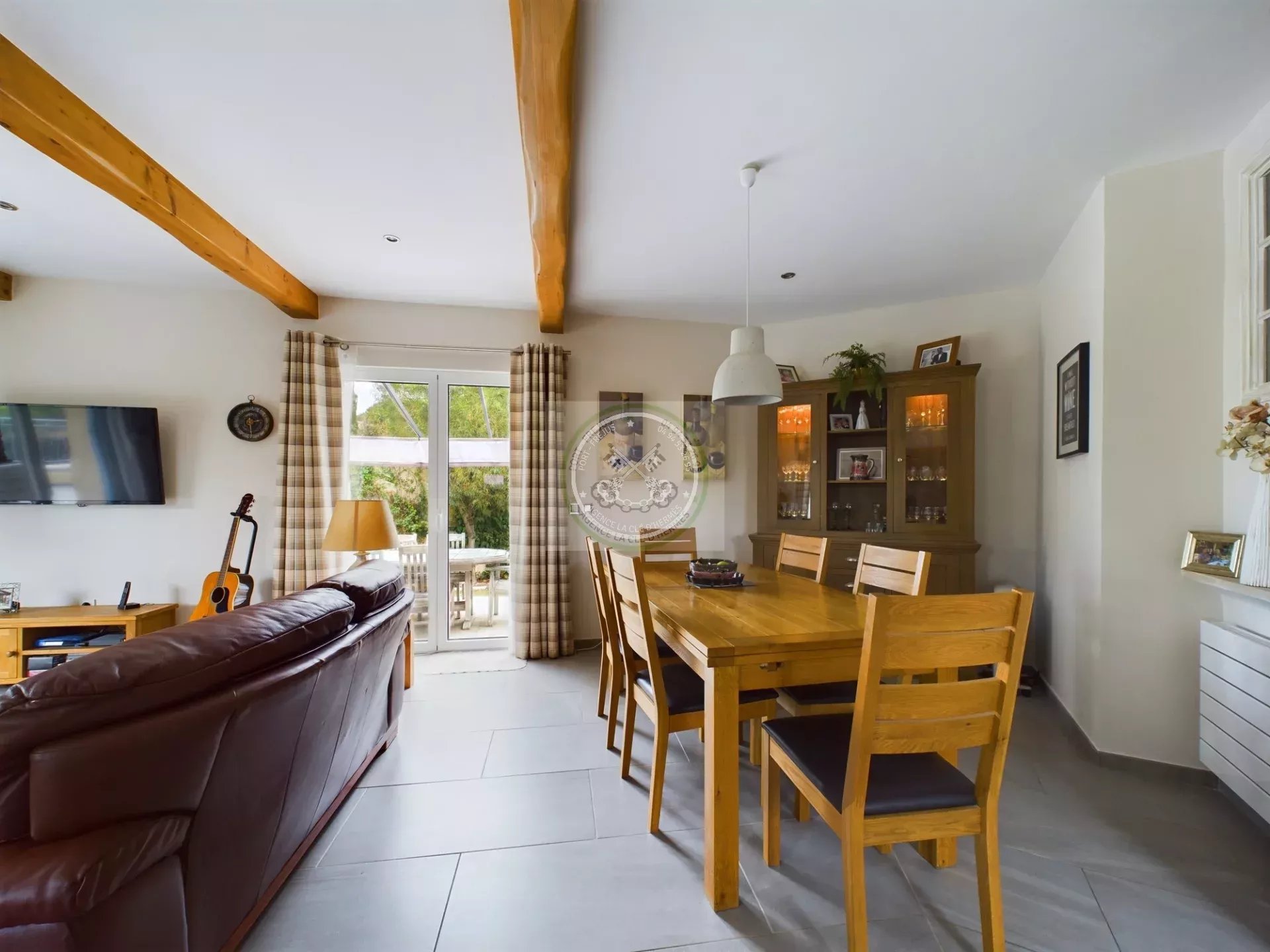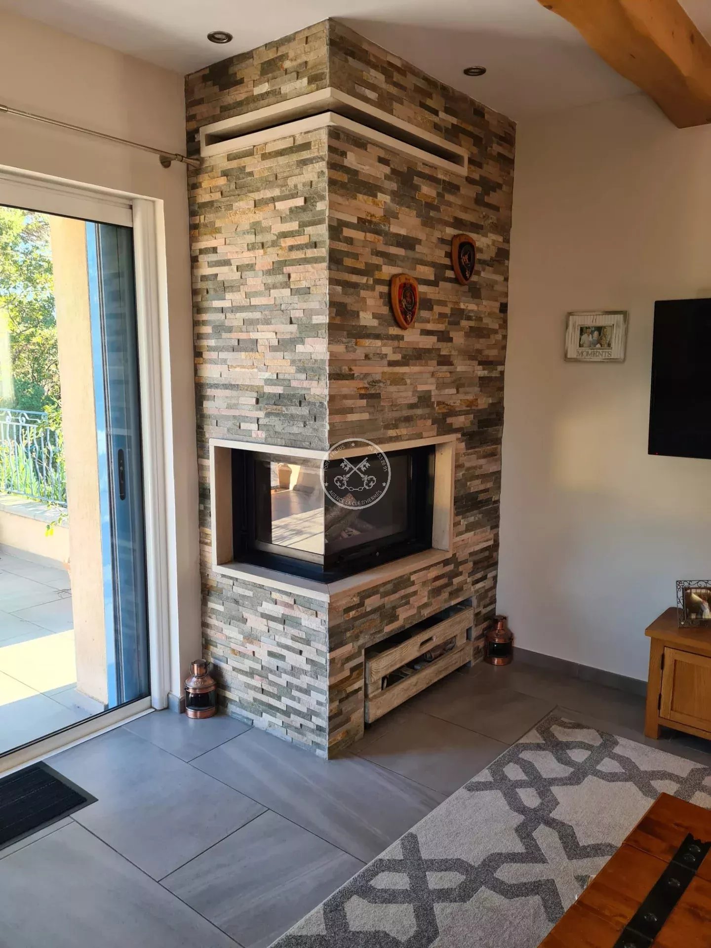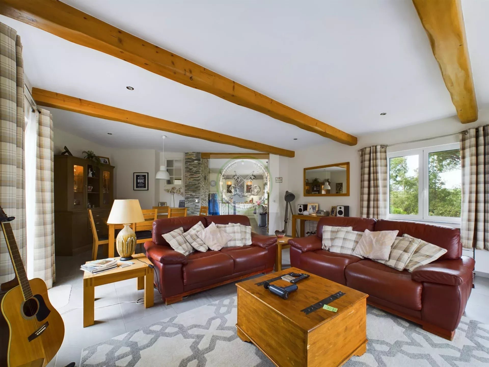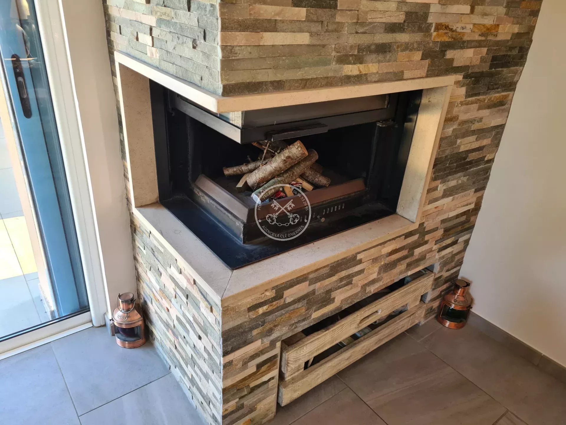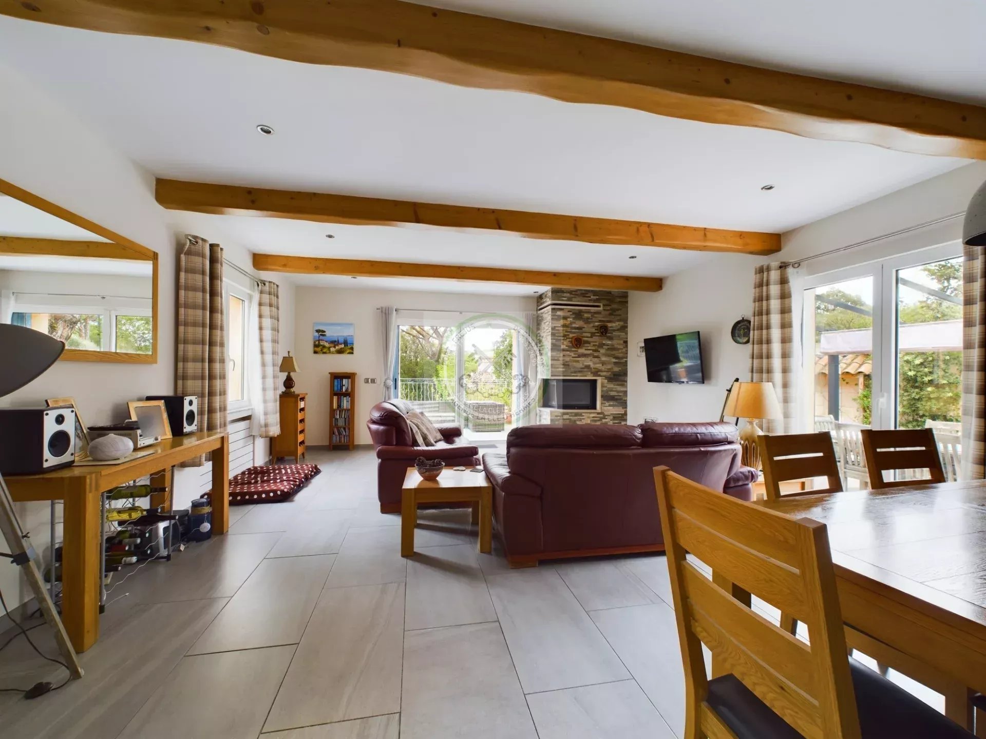 A l'étage et de plain pied sur l'arrière de la maison un grand séjour avec cheminée de 37 M2 donnant sur une grande terrasse couverte par un store électrique en enfilade une cuisine ouverte entièrement équipée .