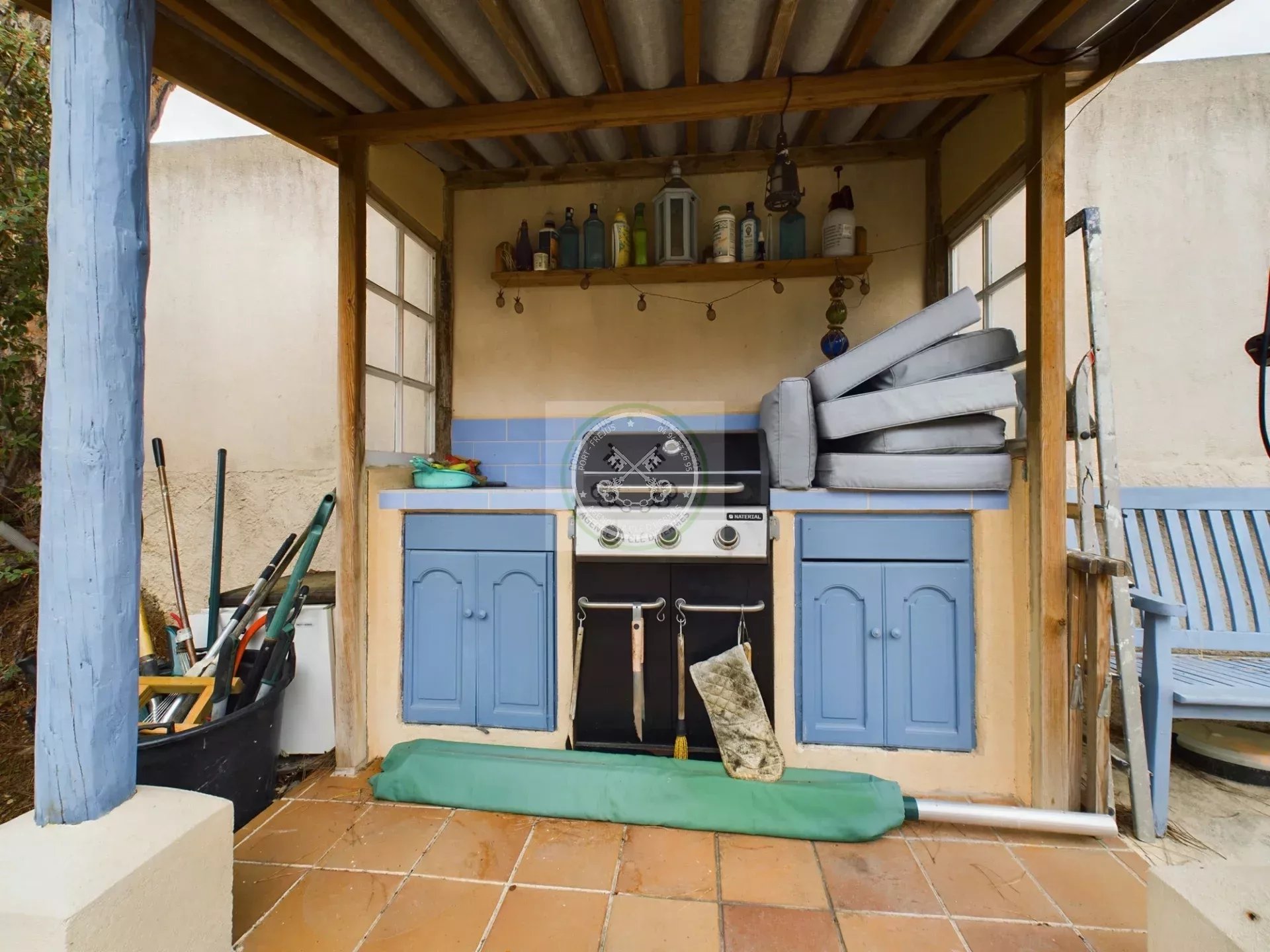 Le terrain plat et arboré est piscinable et aménagé avec une cuisine d'été avec barbecue .
