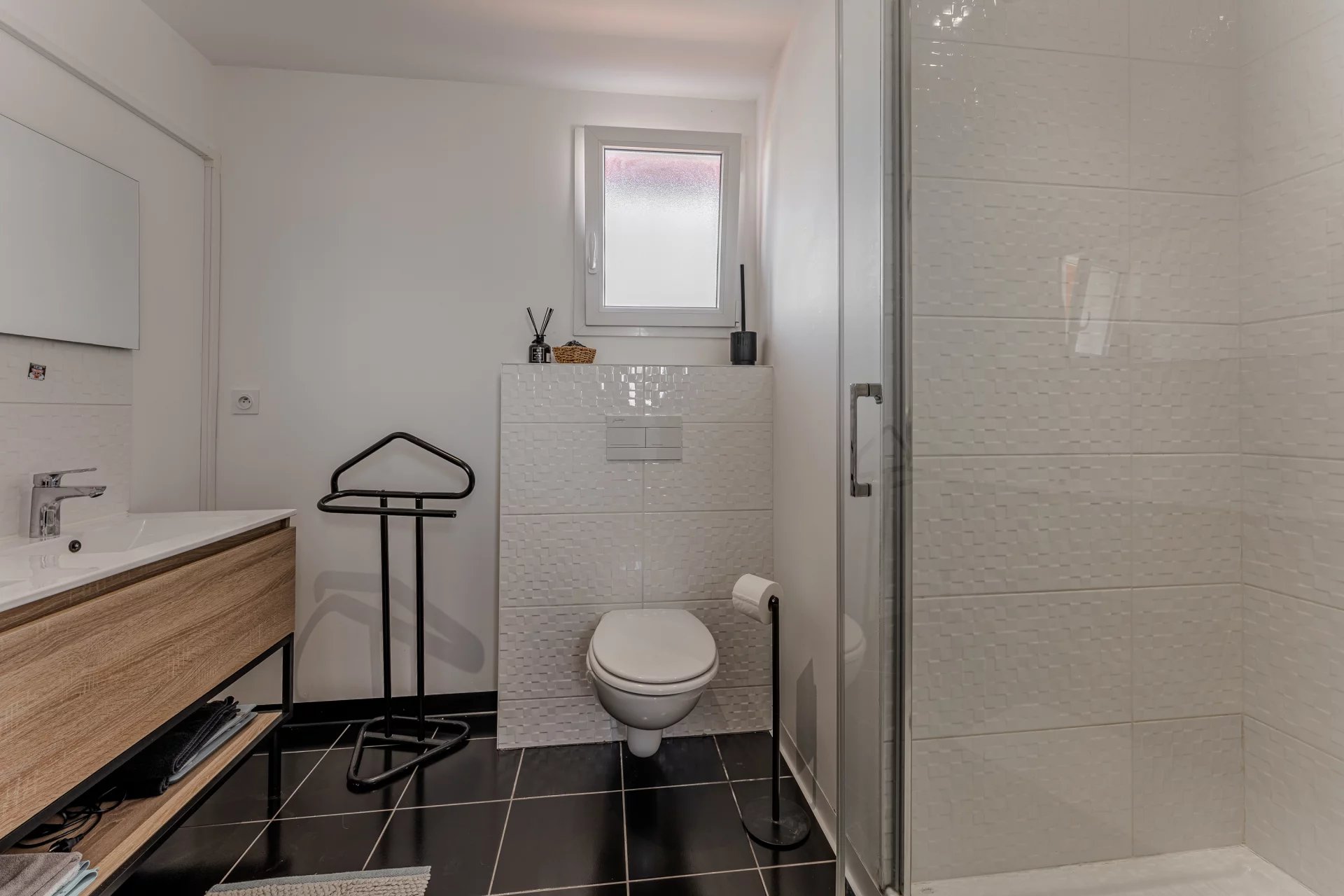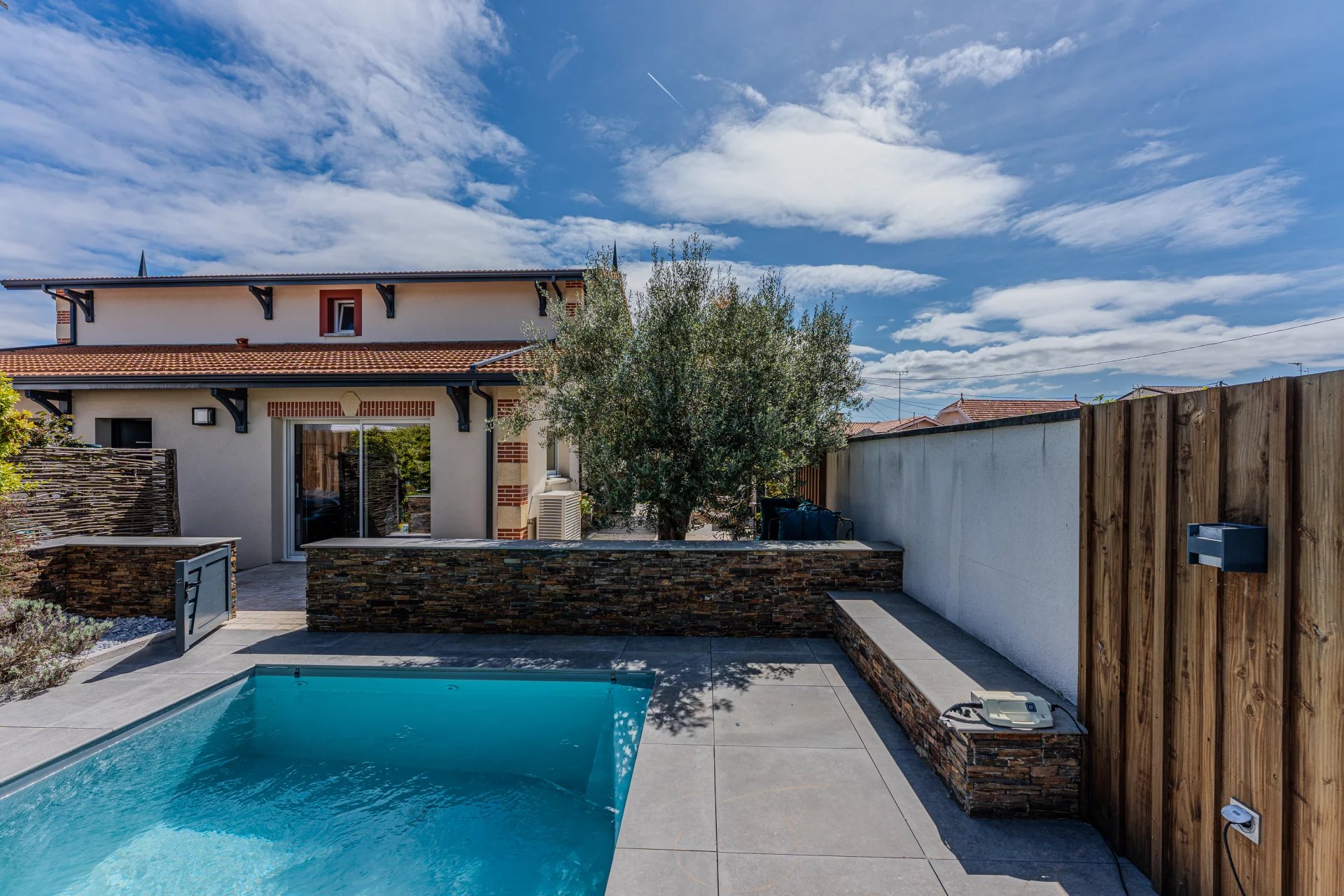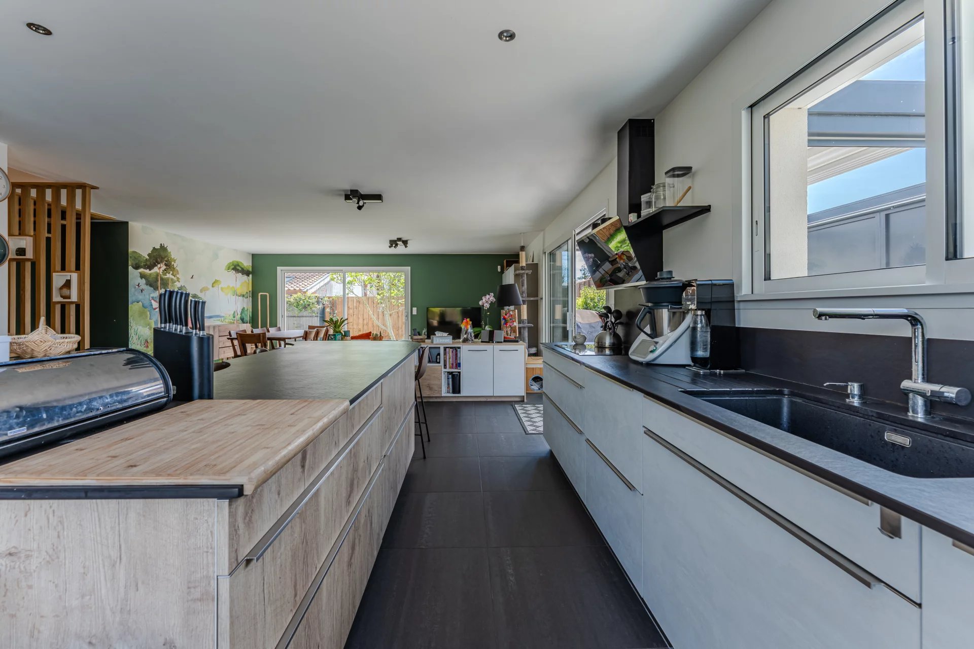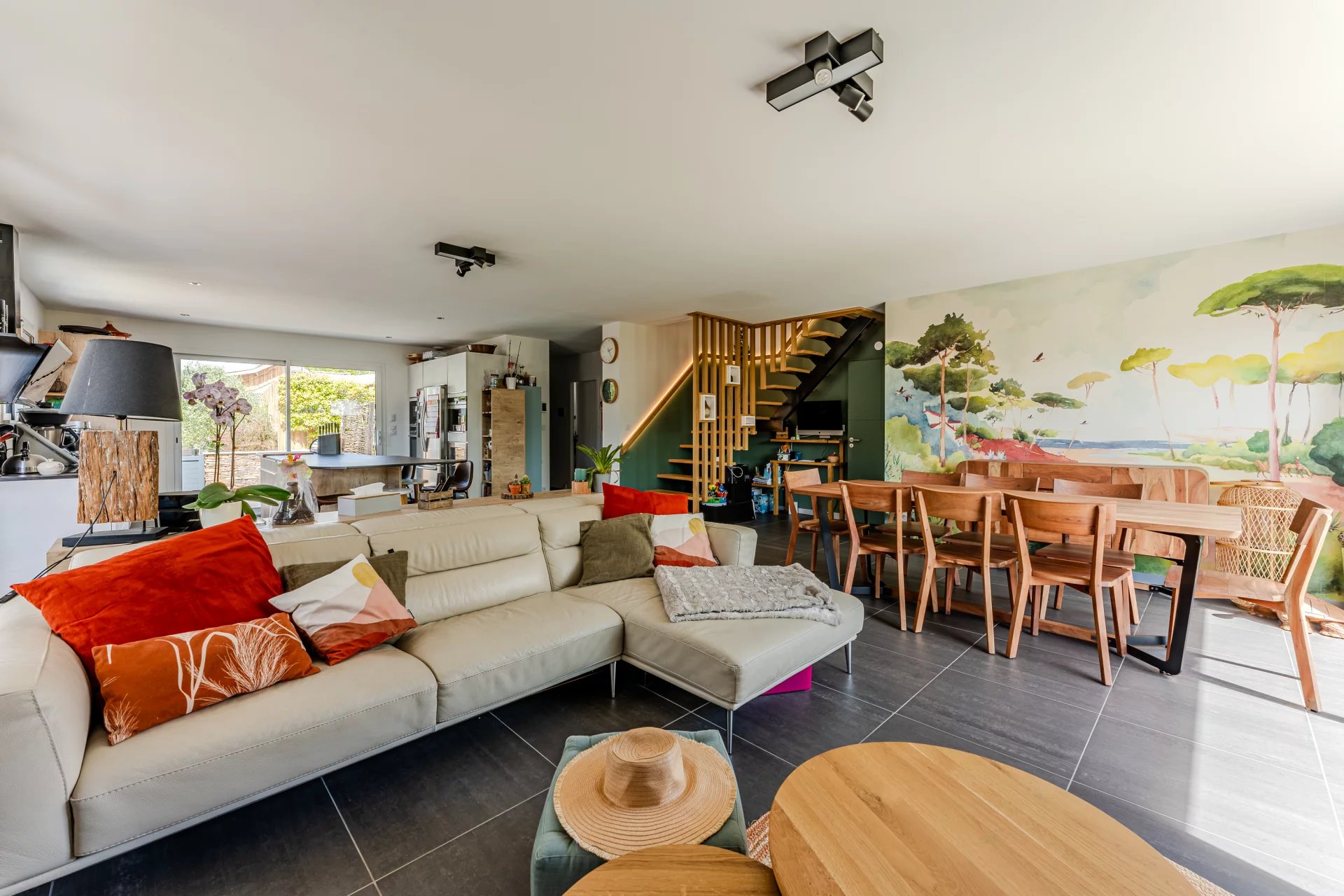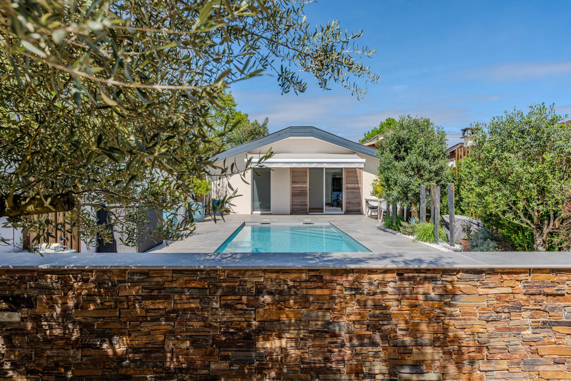 Dans un cadre serein, au bout d'une impasse, nichée sur un terrain paysager de 574m2, se dévoile notre ravissante maison de ville construite en 2019, arborant le style néo-arcachonnais, et s'étendant sur une superficie généreuse de 164 m2, offrant des prestations de qualité. Son emplacement privilégié constitue un avantage indéniable : à seulement 5 minutes de marche du centre-ville, elle assure également une accessibilité aisée aux écoles maternelle, primaire et au collège pour accompagner la scolarité de vos enfants. De plus, la gare, la place du marché et le port se trouvent à moins d'un kilomètre de là. Au rez-de-chaussée, vous découvrirez une pièce à vivre spacieuse de 60 m2 comprenant une cuisine entièrement équipée, deux chambres (16 et 10 m2), un WC, une salle de bain munie d'une douche italienne, d'une baignoire et d'une double vasque, ainsi qu'une buanderie. À l'étage, deux autres chambres (15 et 12,5 m2) et une salle d'eau équipée d'une douche, d'un WC et d'une double vasque vous attendent. Chaque pièce est pourvue d'aménagements sur mesure tels que des dressings, des bibliothèques, des penderies et des espaces de rangement. À l'extérieur, la cour peut accueillir deux voitures et est équipée d'une borne de recharge électrique, d'un portail motorisé et d'un visiophone. Vous profiterez également d'un espace terrasse couvert, d'un jardin agrémenté d'arbres fruitiers et d'une piscine chauffée au sel (10x3m), sécurisée par un volet roulant immergé et automatisée grâce à un système de gestion Klereo. Une salle de sport indépendante abrite un sauna traditionnel, une douche à l'italienne, un WC et le local technique de la piscine. Une seconde annexe est dédiée au rangement de vos vélos et de votre matériel de jardinage. L'ensemble est entièrement aménagé, équipé d'un système d'arrosage automatique et éclairé.