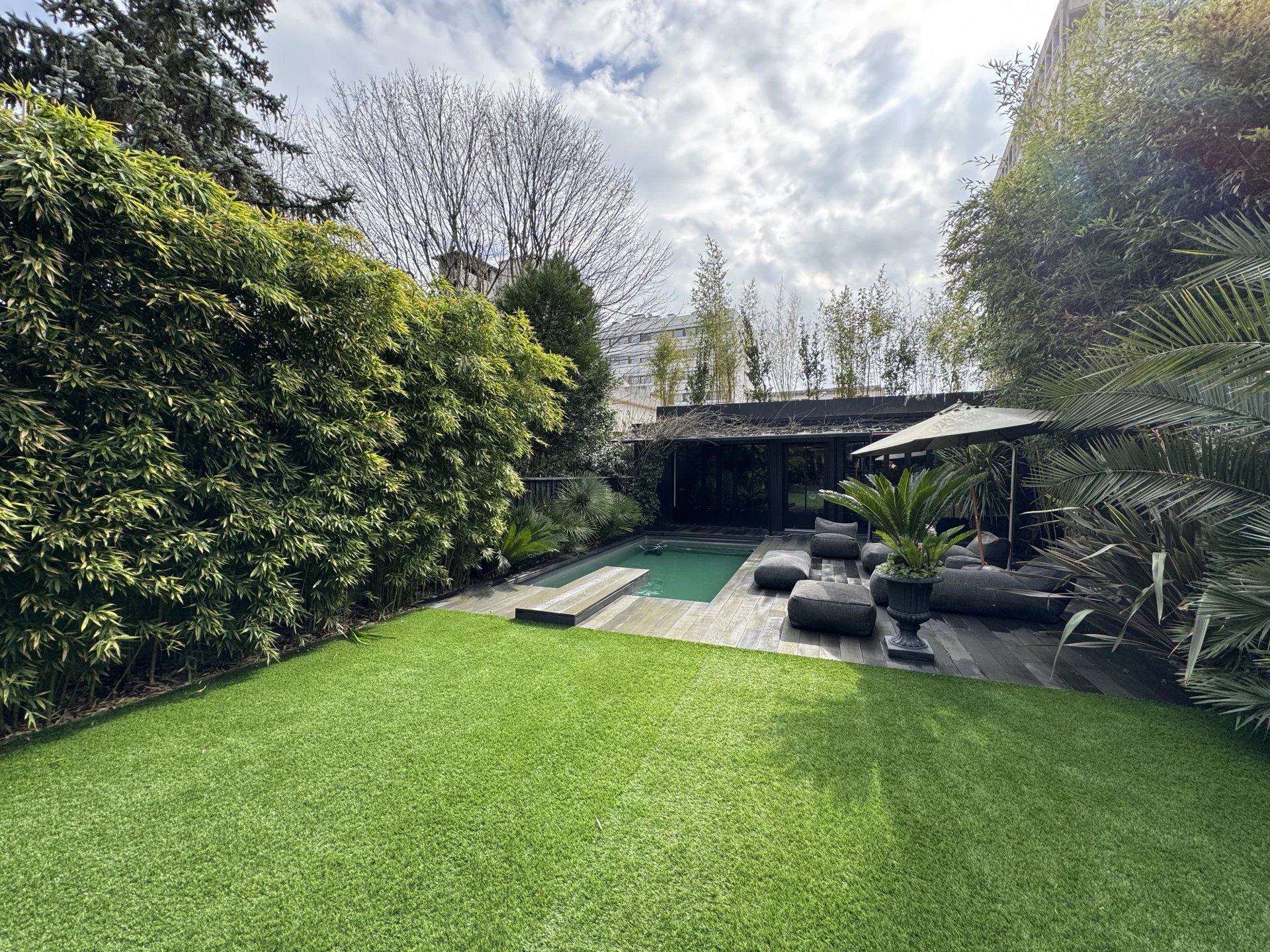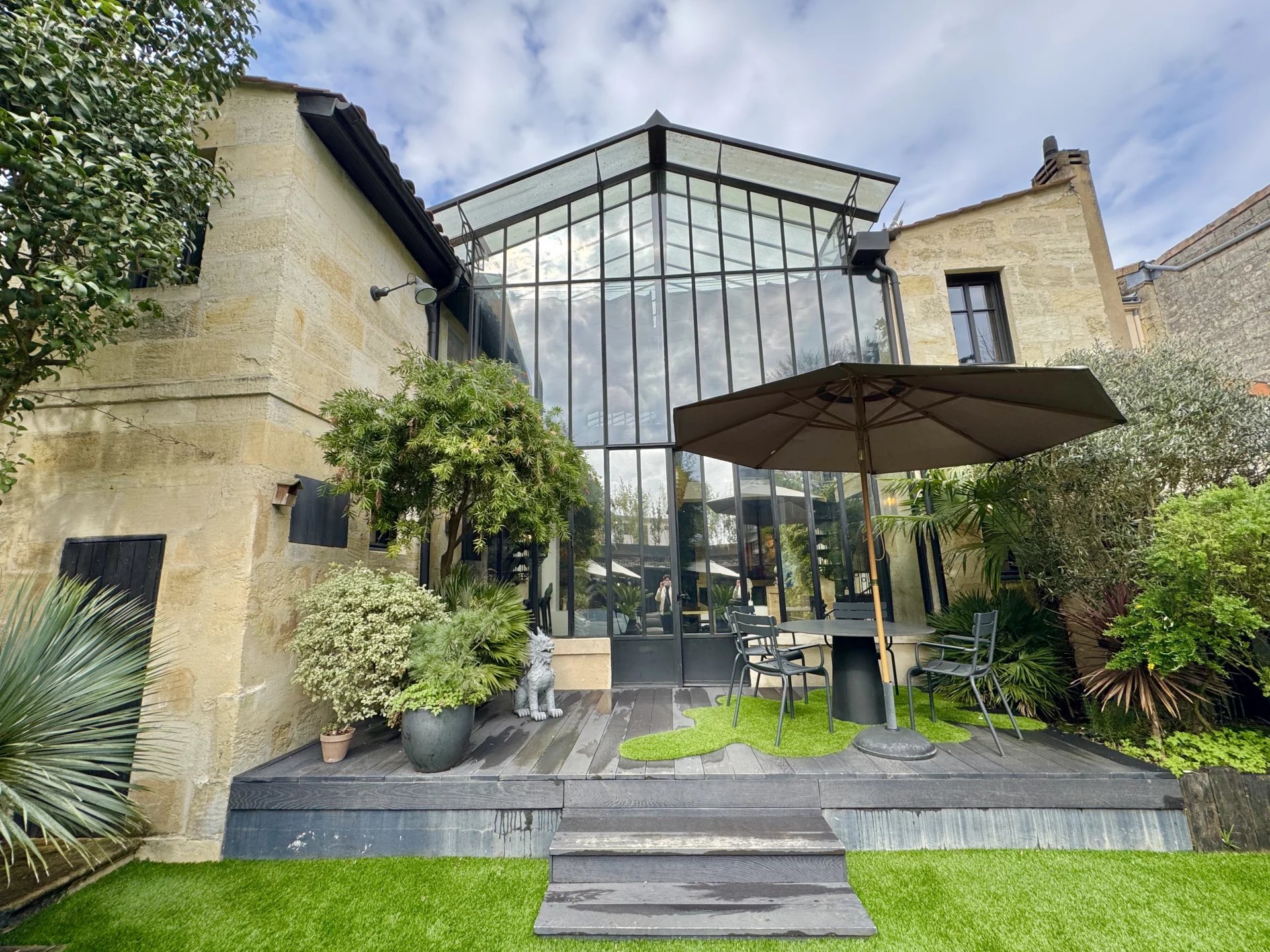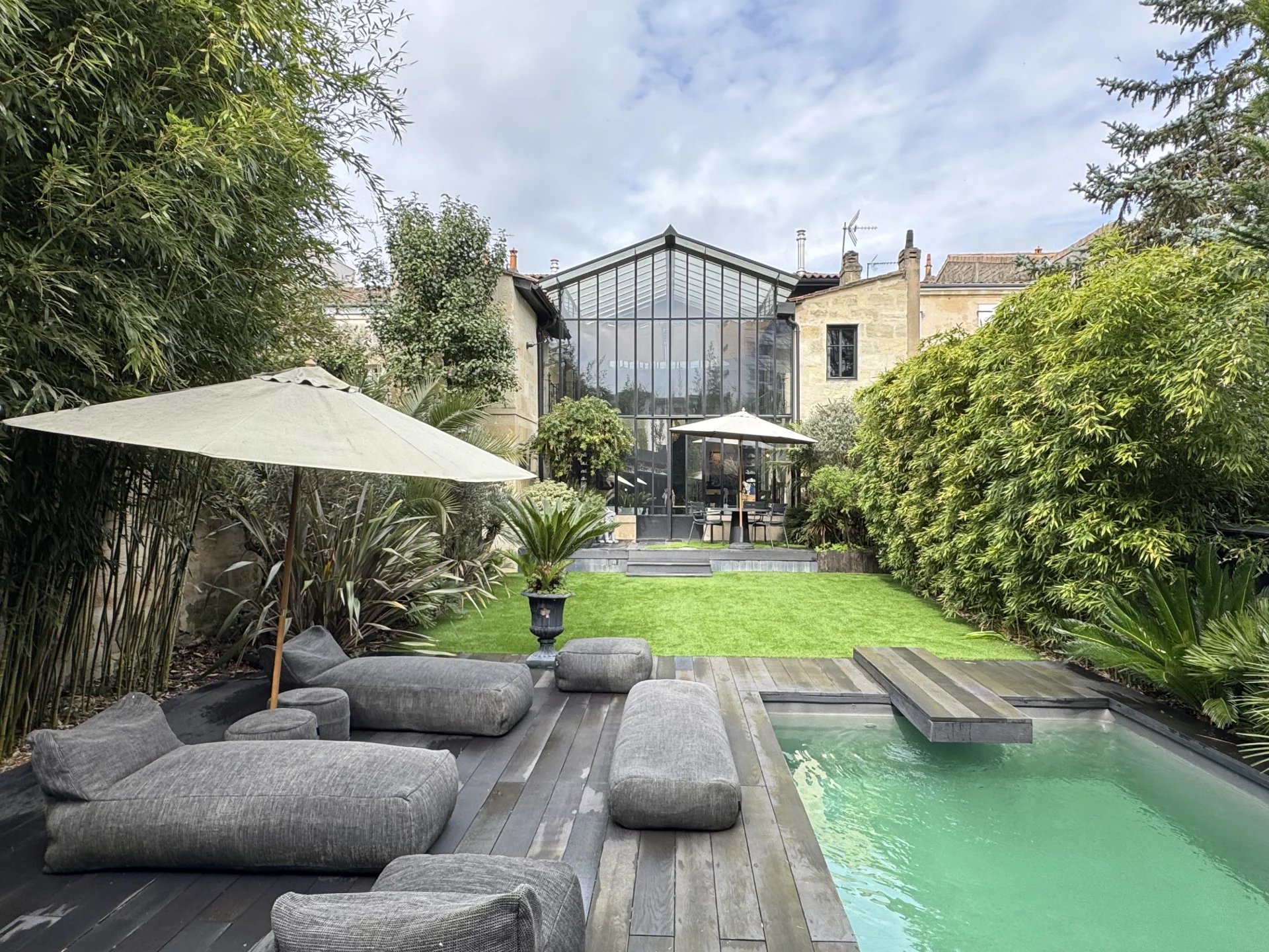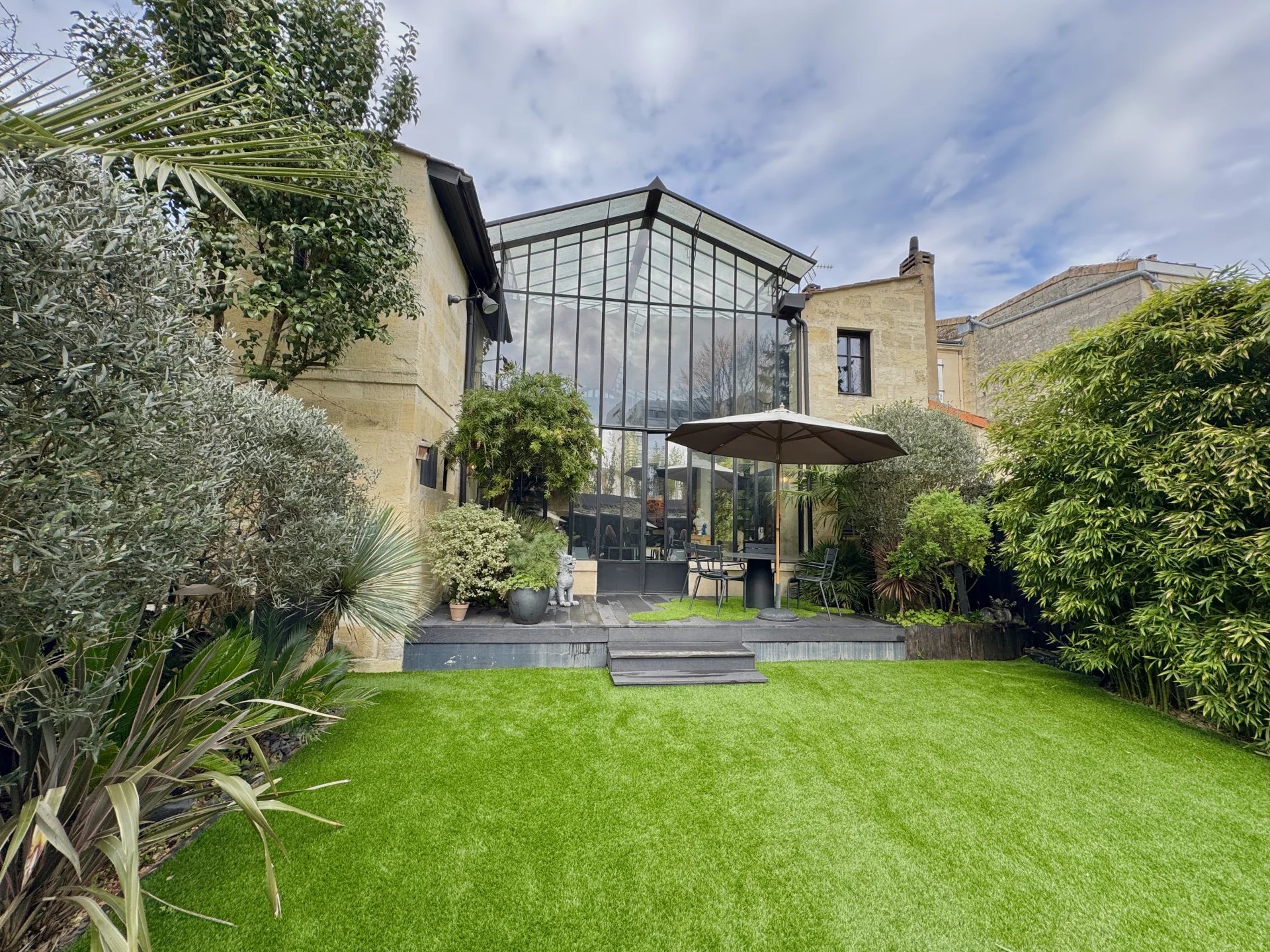 Nichée entre Saint-Seurin et le Parc Bordelais, cette superbe demeure de 300 m² allie élégance et confort dans un cadre raffiné. Imaginée par un designer de renom, elle séduit par son atmosphère intime et son agencement soigné, sublimé par une somptueuse verrière atelier qui baigne la salle à manger de lumière naturelle. Dès l’entrée, le ton est donné avec des volumes généreux et une distribution fluide des espaces. Le rez-de-chaussée accueille une chambre d’amis avec salle de douche et rangements, ainsi qu’un vaste espace de vie comprenant un double salon et une cuisine ouverte sur la salle à manger. À l’étage, la suite parentale impressionne avec son salon privé, sa salle de bains, son hammam et son dressing. Deux autres chambres, chacune dotée de rangements et d’une salle de douche, ainsi qu’un bureau indépendant et une buanderie complètent cet étage. L’extérieur est une véritable invitation à la détente, avec un jardin paysager de 160 m² exposé sud-ouest, une piscine chauffée et une dépendance de 25 m² pouvant servir d’atelier ou de studio. Pour parfaire cet ensemble, la maison dispose d’un grand garage et d’un sous-sol comprenant une cave à vin et une buanderie. Une rénovation de prestige avec des matériaux de haute qualité, pour un bien rare au cœur de Bordeaux.