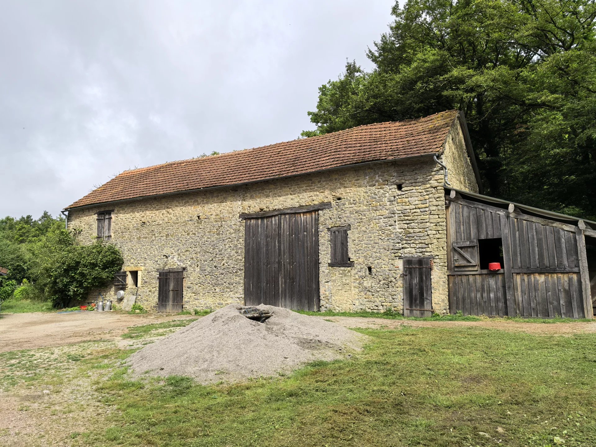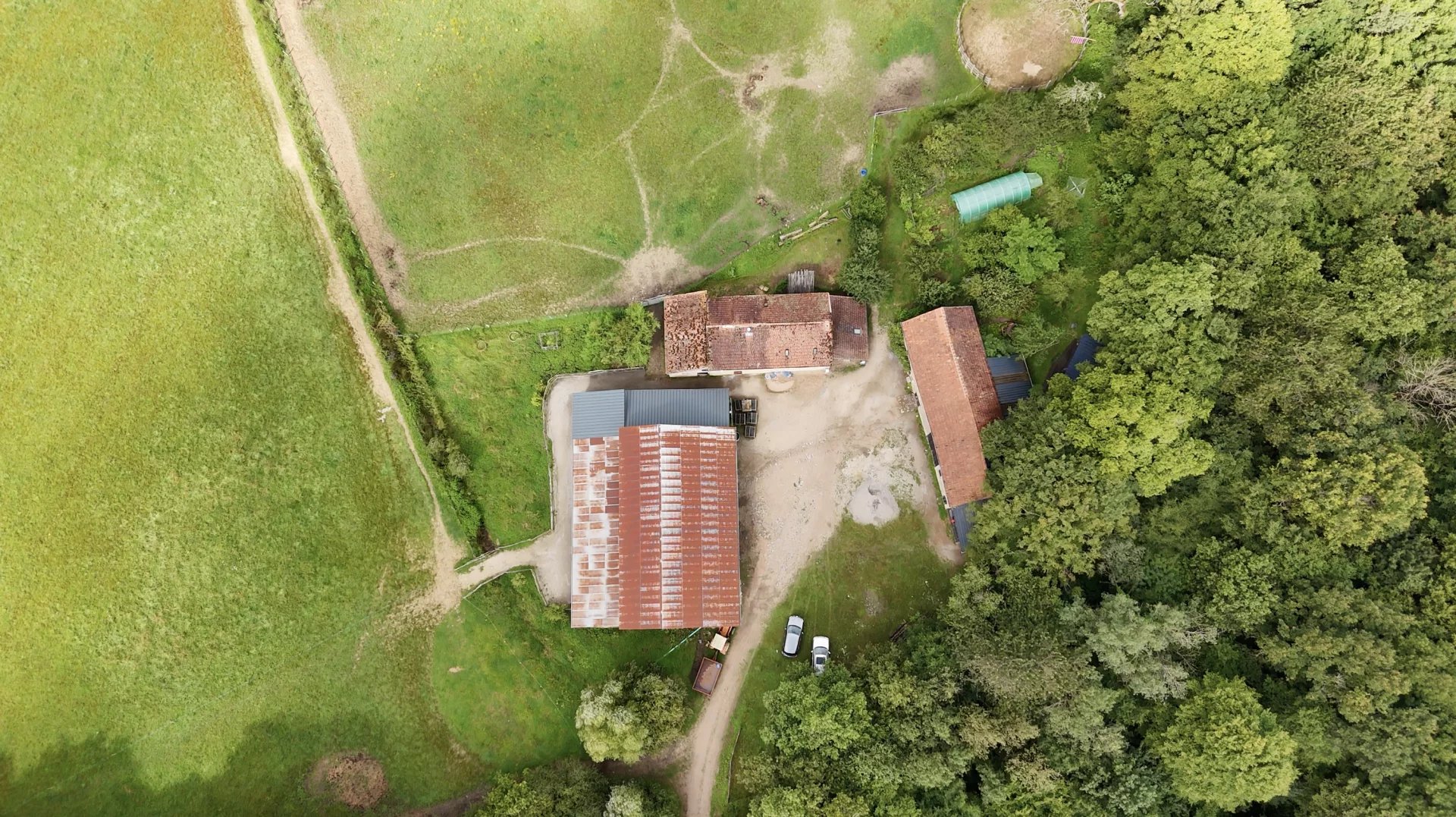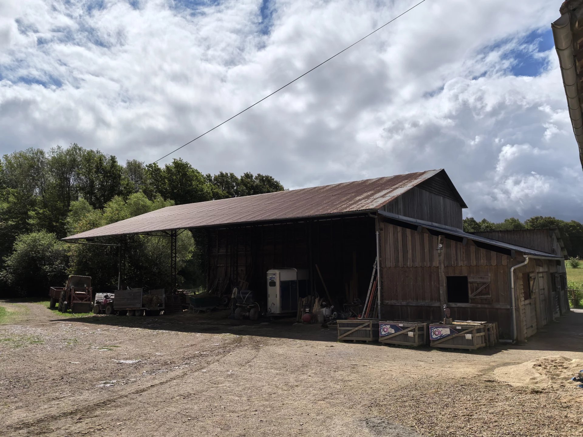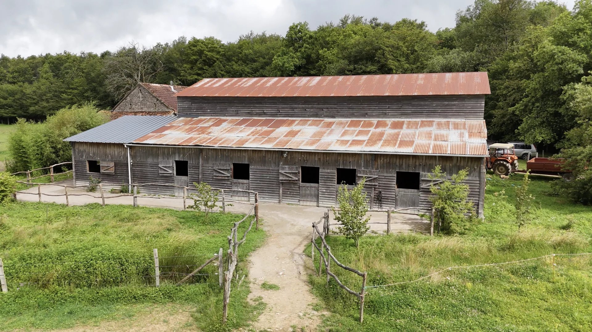 La propriété, accessible par un petit chemin forestier, est composée d’une maison d’habitation, d’une grande grange, d’un hangar et de divers box à chevaux.