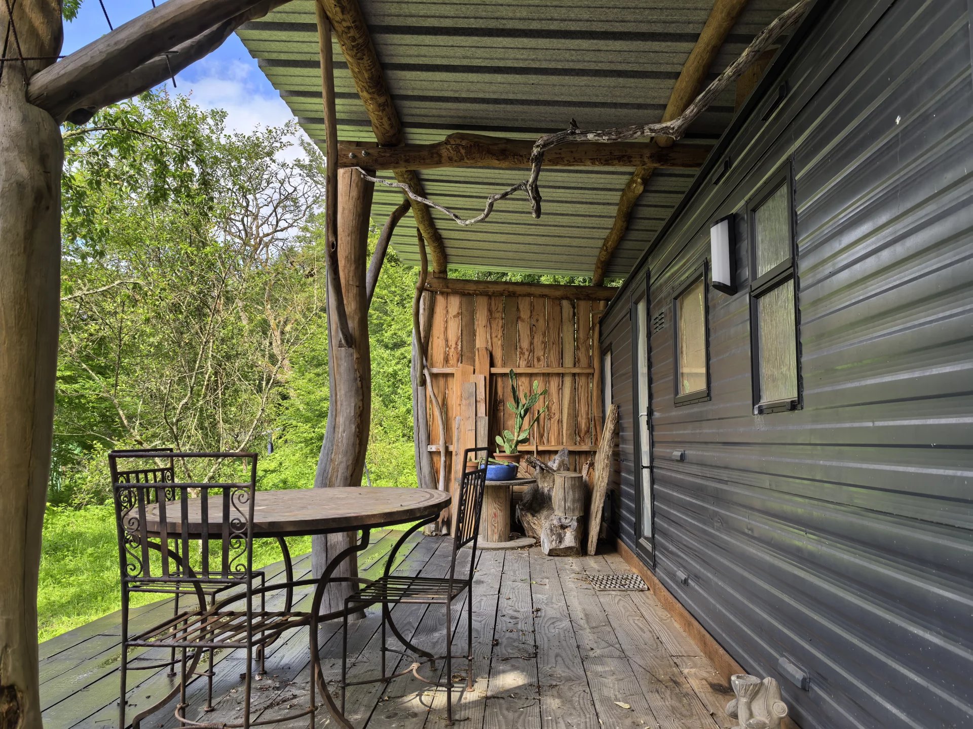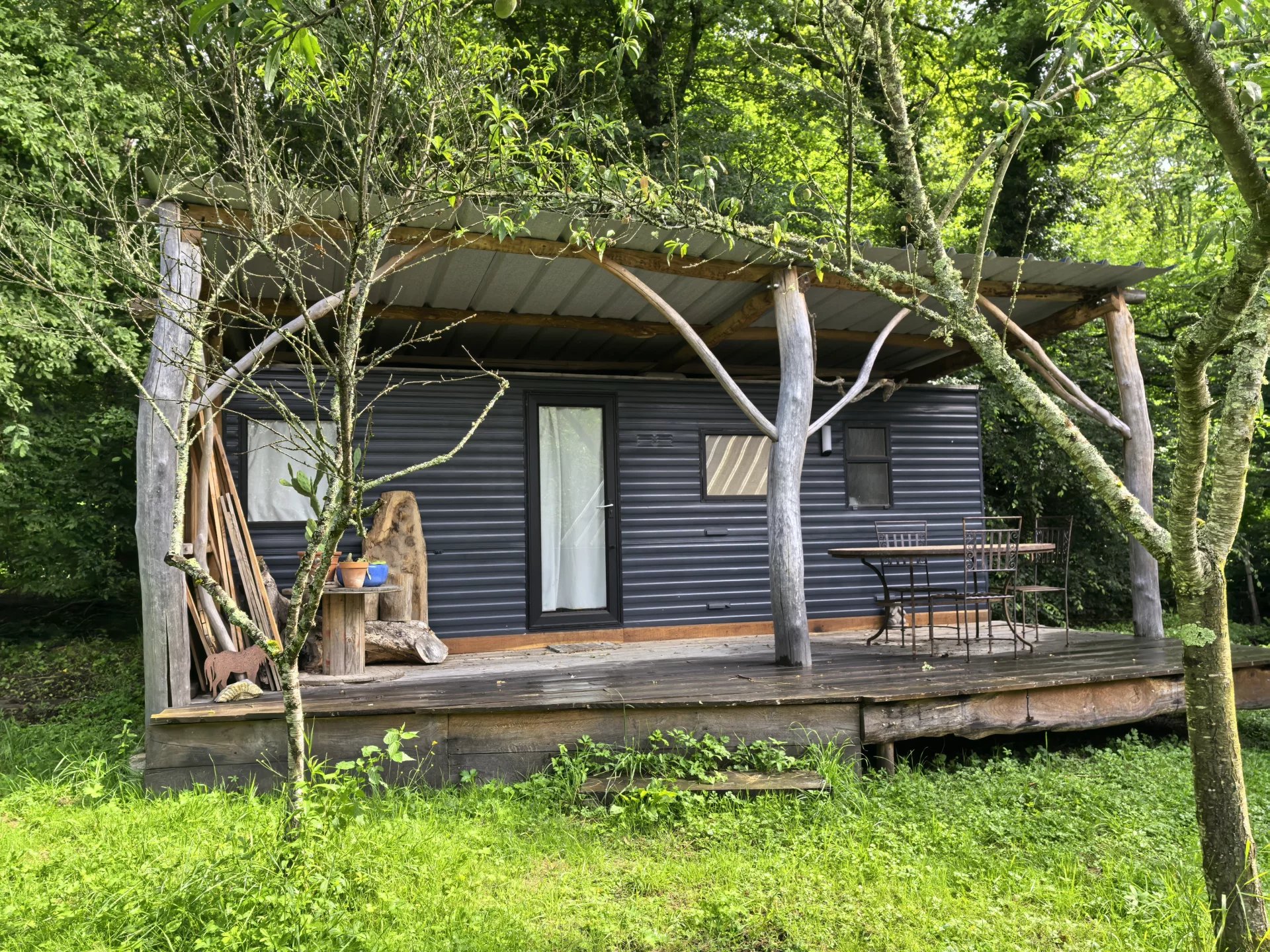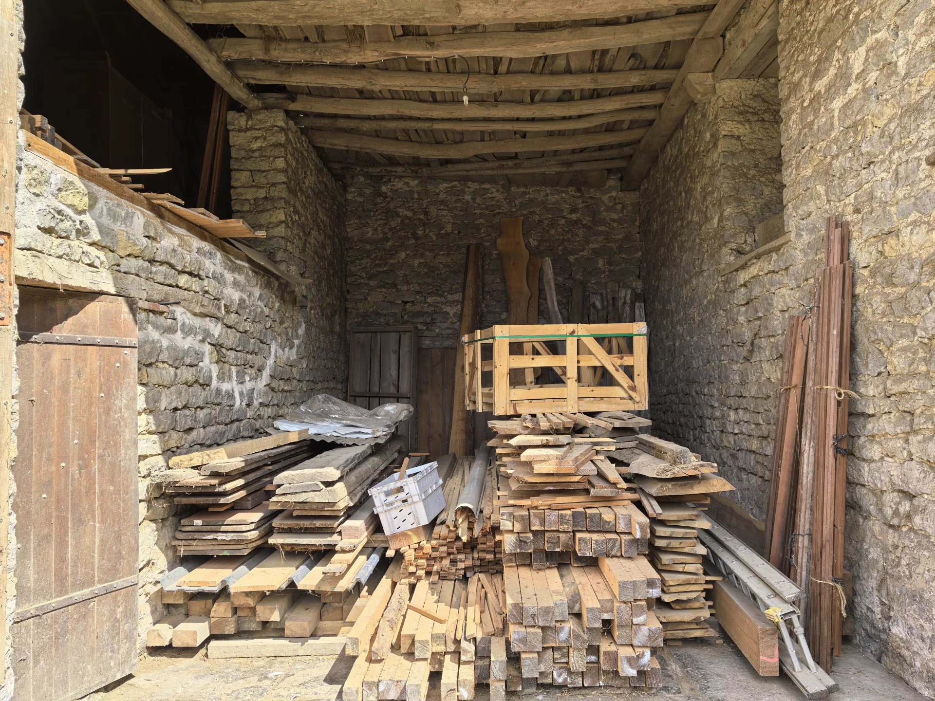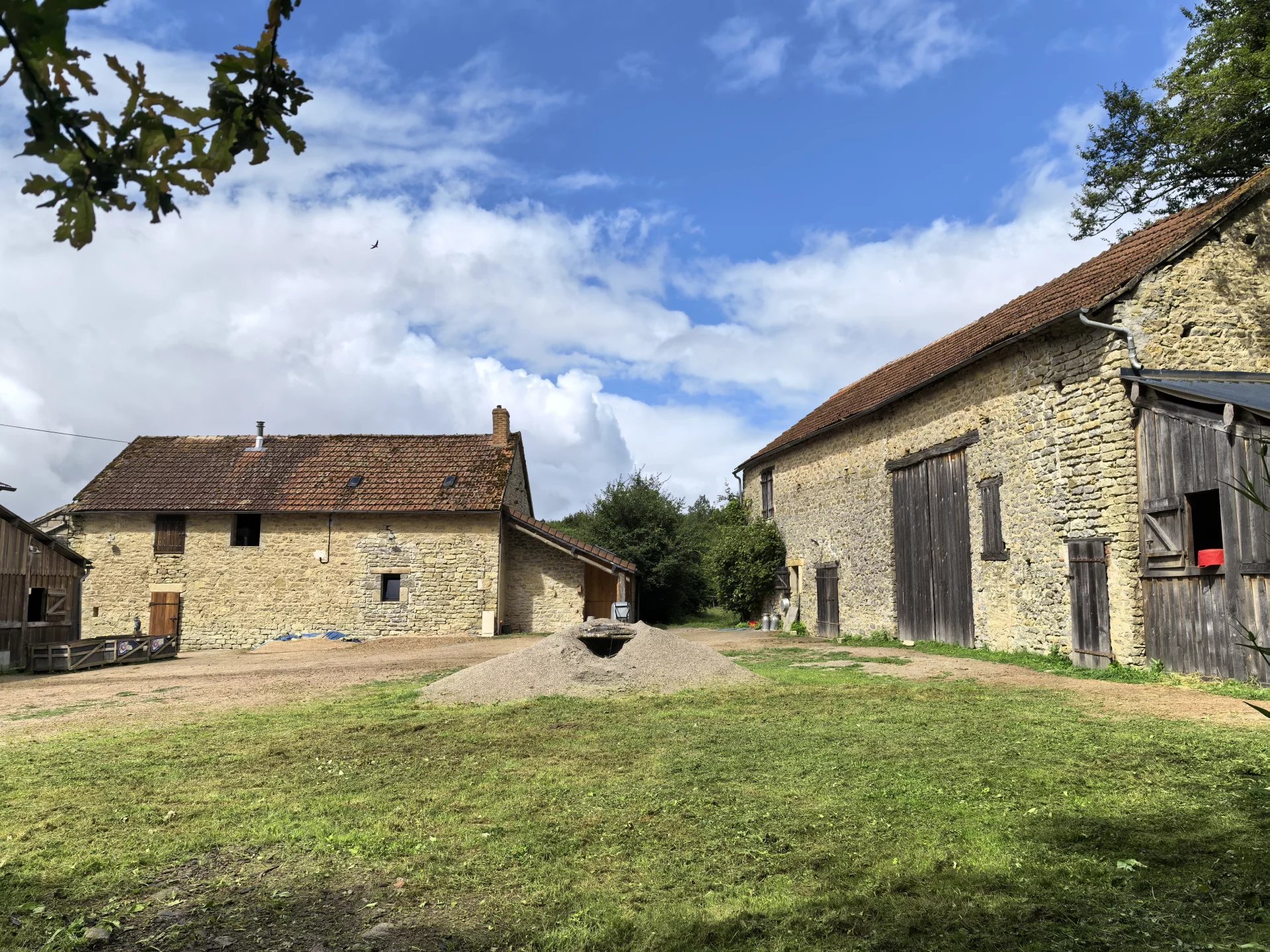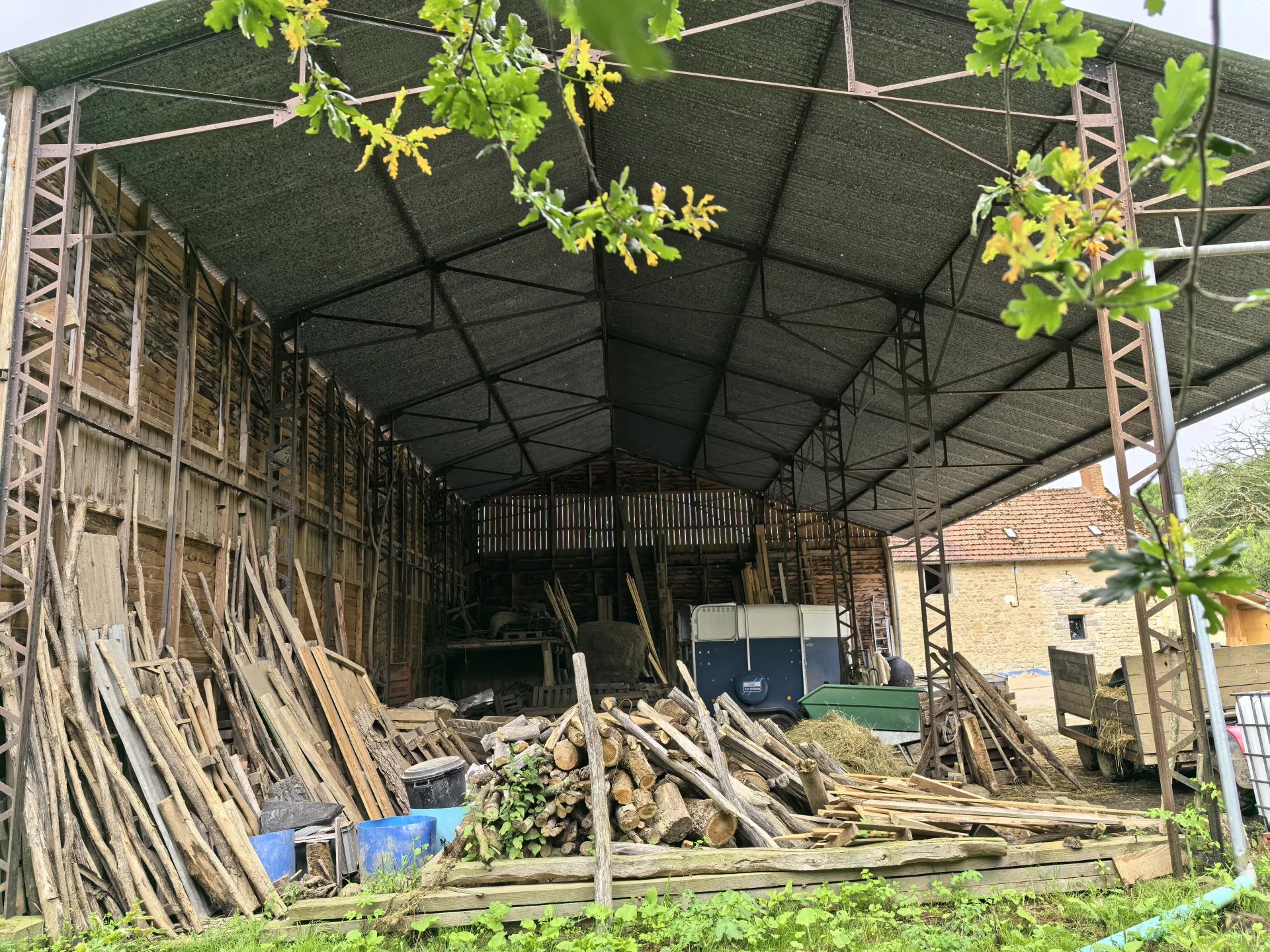 La propriété, accessible par un petit chemin forestier, est composée d’une maison d’habitation, d’une grande grange, d’un hangar et de divers box à chevaux.